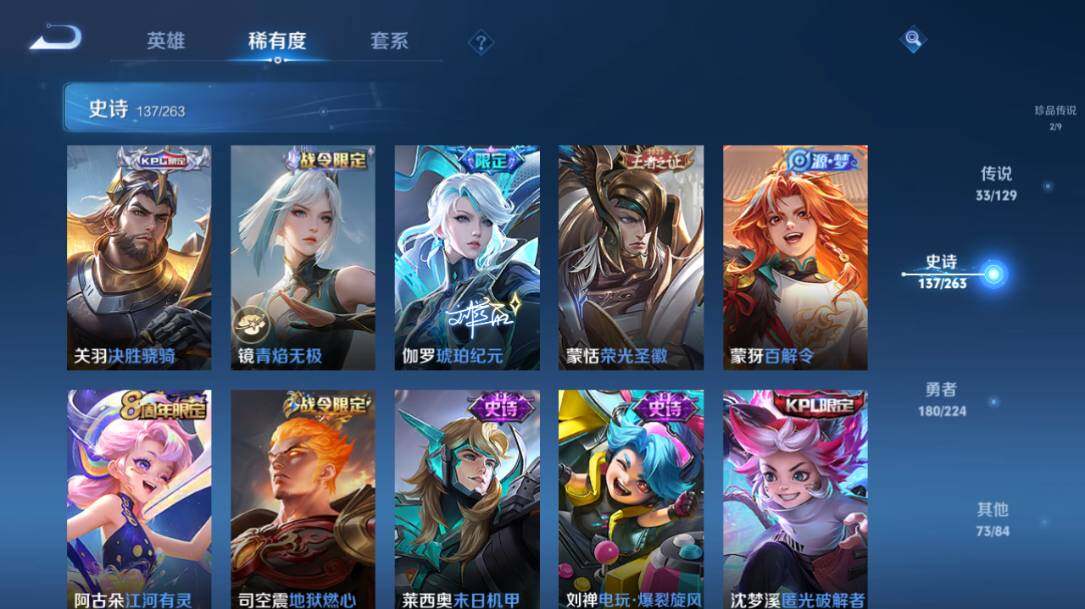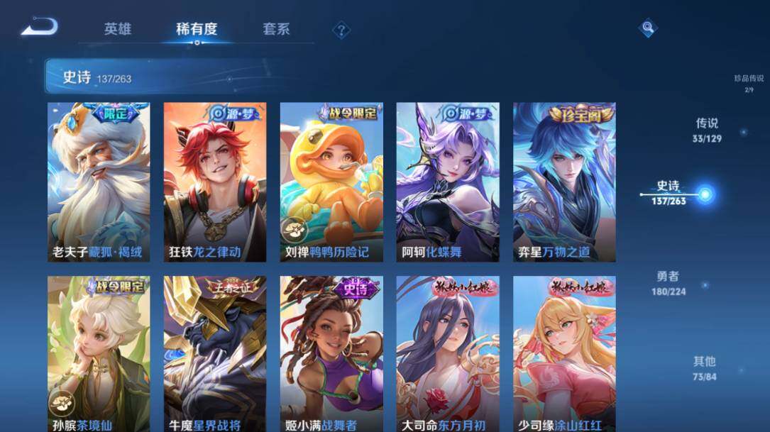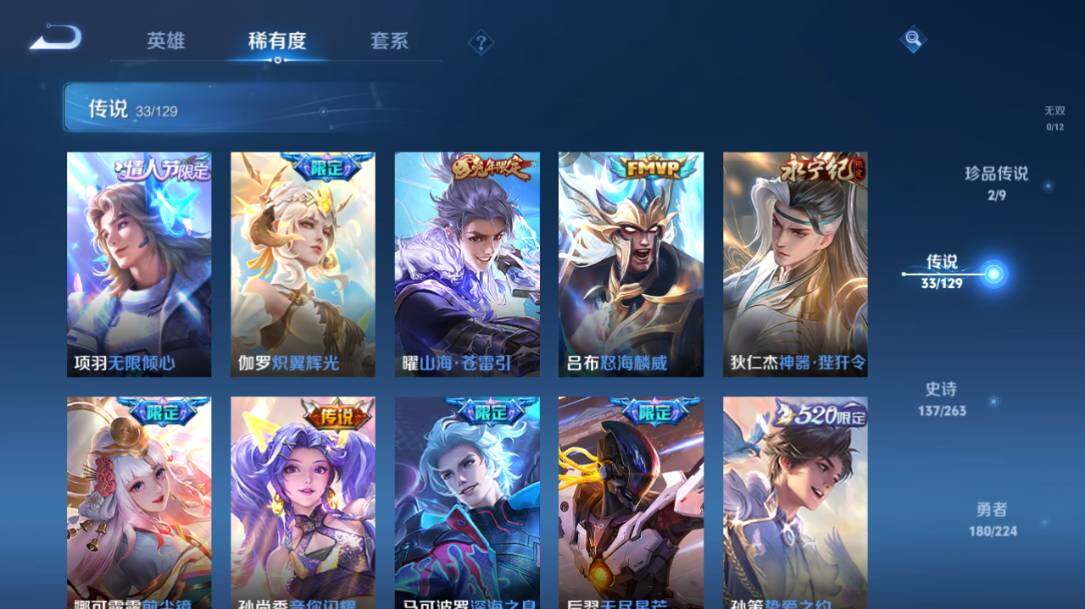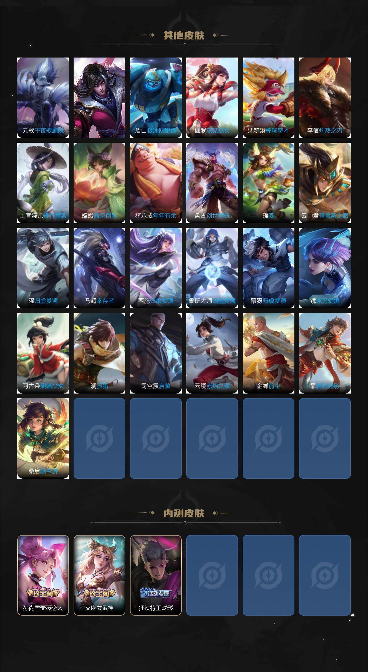 白起狰,太乙真人饕餮,芈月重明,典韦穷奇,狂铁御狮,夏侯惇朔风刀,明世隐疑决卦,鬼谷子原初探秘者,狄仁杰万华元夜,程咬金演武夺筹,钟馗驱傩正仪,苏烈千军破阵,女娲朔望之晖,鲁班七号狮舞东方,沈梦溪星空之诺,马可波罗暗影游猎,蒙犽狂想玩偶喵,元歌云间偶戏,达摩沙漠行僧,兰陵王金庭之子,沈梦溪大漠名商,李元芳云中旅人,桑启海盐诗旅,裴擒虎擒涛扼浪,鲁班大师探海日志,张良古海寻踪,项羽苍威无极,镜青焰无极