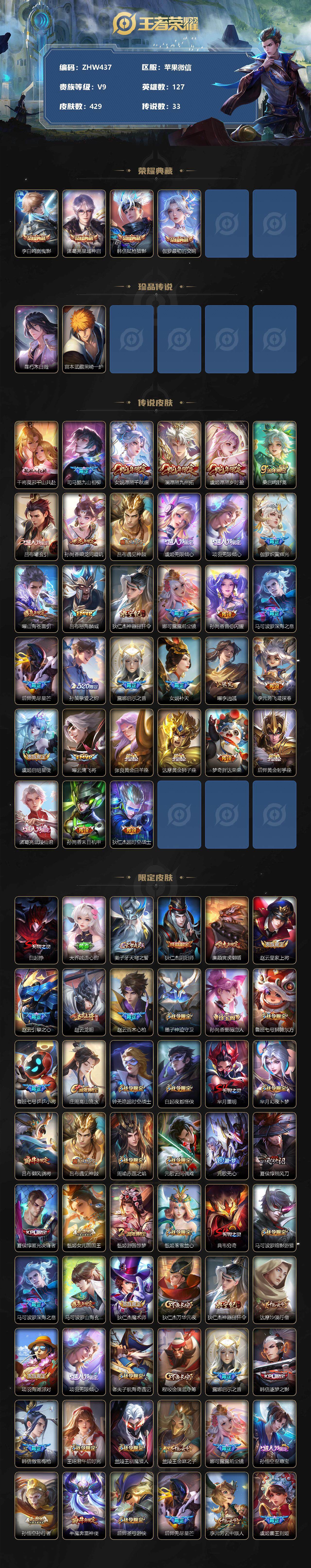 [12622820]苹果WX-V9-至尊星耀IV段位-127英雄-429皮肤-4典藏-2珍品传说-33传说-137史诗