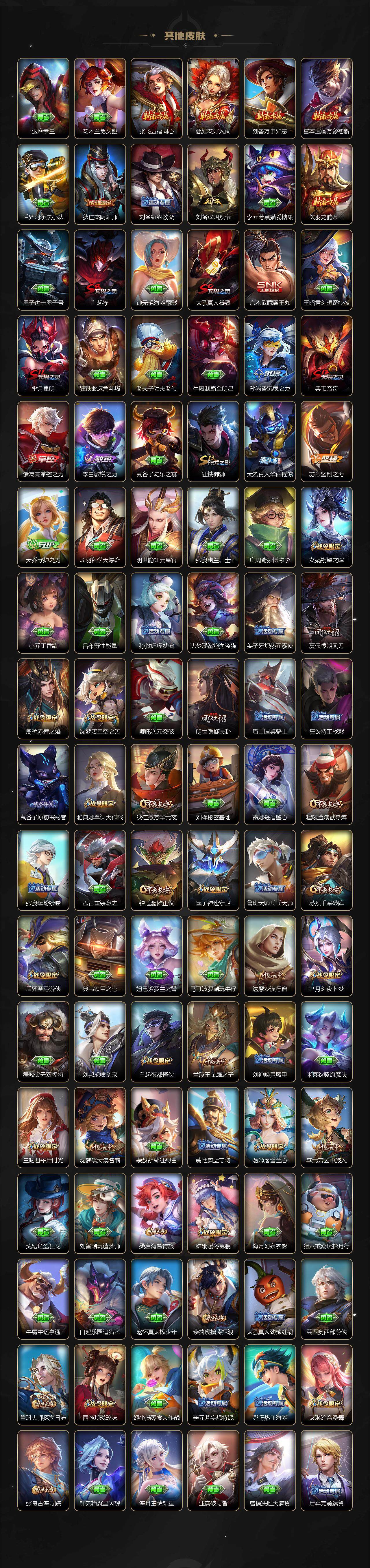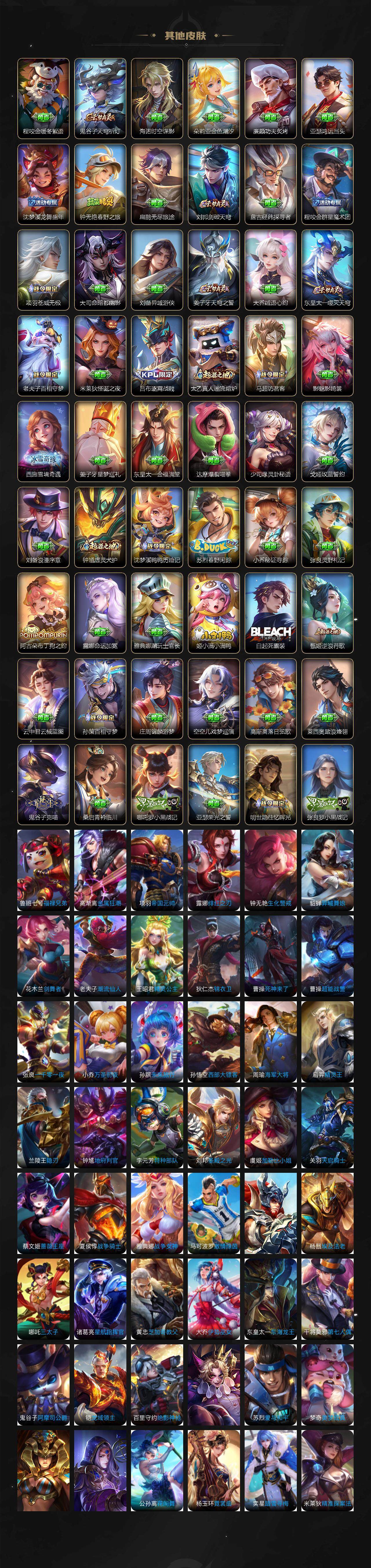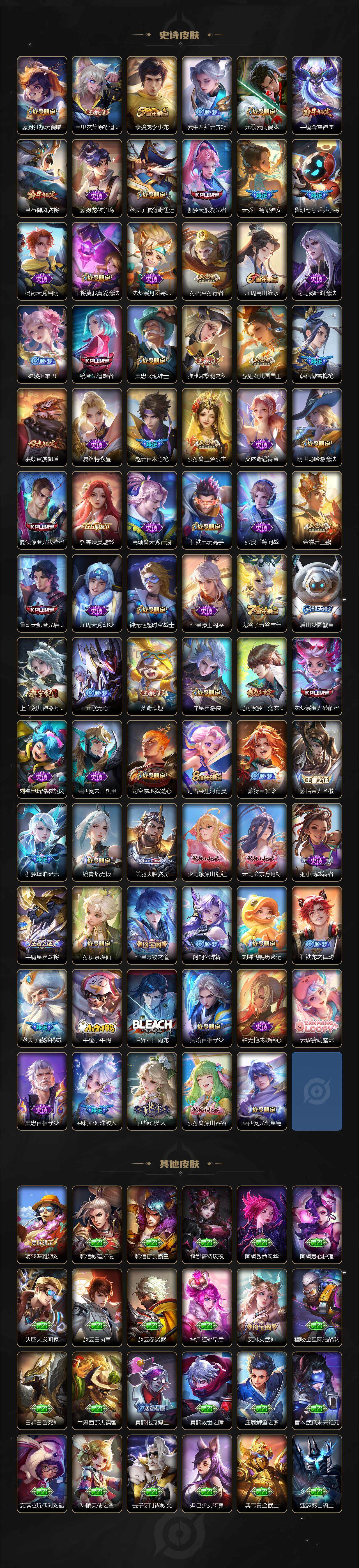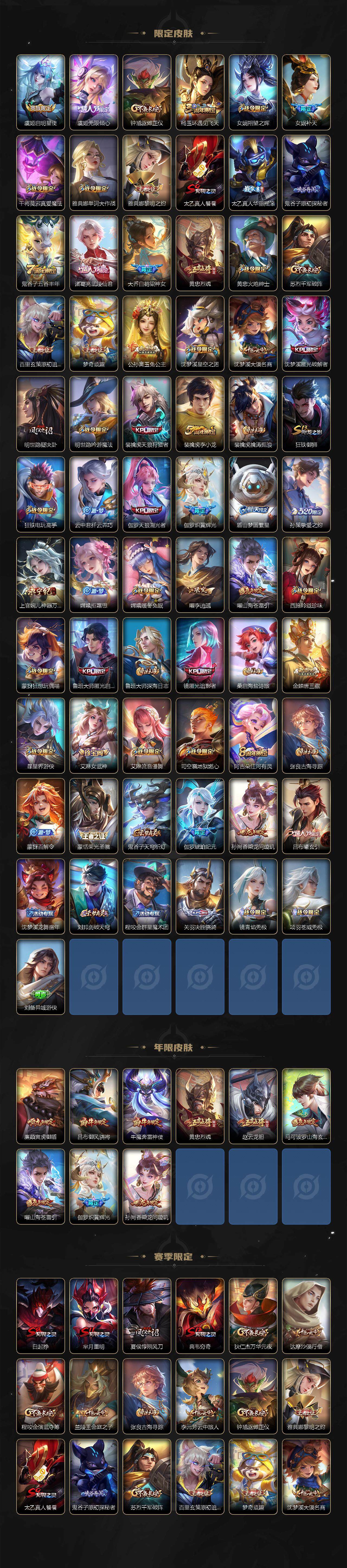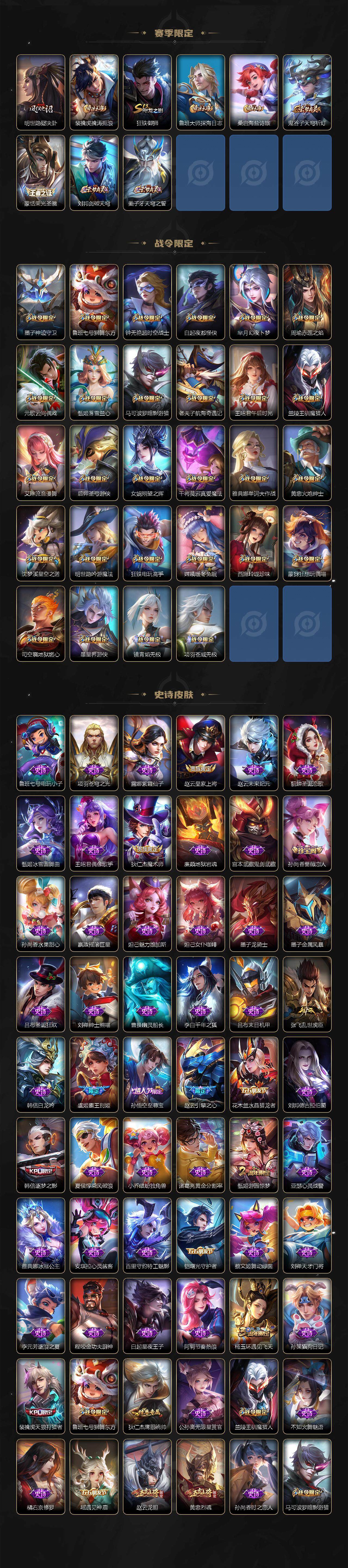 【限定皮肤】:白起狰,大乔绒语心约,姜子牙天穹之誓,狄仁杰阴阳师,廉颇寅虎御盾,赵云皇家上将,赵云引擎之心,赵云龙胆,赵云百木心枪,墨子神迹守卫,孙尚香蔷薇恋人,鲁班七号狮舞东方,鲁班七号乒乒小将,庄周高山流水,钟无艳超时空战士,白起夜都怪侠,芈月重明,芈月幻夜卜梦,吕布御风骁将,吕布遇见神鼓,周瑜赤莲之焰,元歌云间偶戏,元歌无心,夏侯惇朔风刀,夏侯惇匿光决锋者,甄姬女儿国国王,甄姬游园惊梦,甄姬落雪兰心,典韦穷奇,马可波罗暗影游猎,马可波罗深海之息,马可波罗山海玄木吟,狄仁杰魔术师,狄仁杰万华元夜,狄仁杰神器狴犴令,达摩沙漠行僧,项羽海滩派对,项羽无限倾心,老夫子航海奇遇记,程咬金演武夺筹,露娜启示之音,韩信逐梦之影,韩信傲雪梅枪,王昭君午后时光,兰陵王驯魔猎人,兰陵王金庭之子,娜可露露前尘镜,孙悟空至尊宝,孙悟空孙行者,牛魔奔雷神使,后羿圣弓游侠,后羿无尽星芒,李元芳云中旅人,虞姬霸王别姬,虞姬启明星使,虞姬无限倾心,钟馗驱傩正仪,杨玉环遇见飞天,女娲朔望之晖,女娲补天,干将莫邪真爱魔法,雅典娜单词大作战,雅典娜黎明之约,太乙真人饕餮,太乙真人华丽摇滚,鬼谷子原初探秘者,鬼谷子五谷丰年,诸葛亮武陵仙君,大乔白鹤梁神女,黄忠烈魂,黄忠火炮绅士,苏烈千军破阵,百里玄策原初追逐者,梦奇顽趣,公孙离玉兔公主,沈梦溪星空之诺