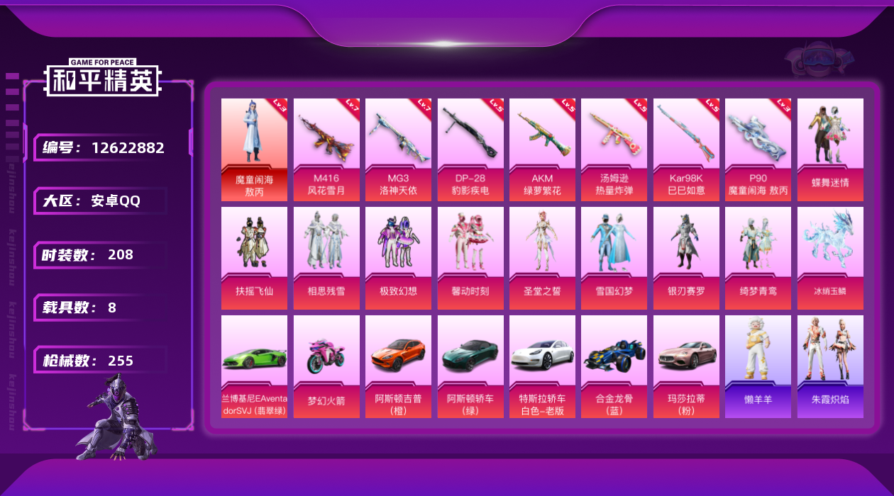 [12622882]老木乃伊/无敌战神框3/绝世印记2 安卓 手Q-无敌战神框-1神装-10粉装-7特效枪-8载具-6粉色飞行器-9.6w热力值-25王牌印记-208套装-255枪皮【红色神装等级】:魔童闹海-敖丙(三级)【热门品类】:粉装-雪国幻梦,粉装-梦幻火箭,套装-浪漫天命,套装-都市猎人,套装-冥河战士,套装-深海小丑鱼,套装-奇异狩猎者,套装-龟仙人,套装-潮萌小黄鸭,套装-暗影哥特,套装-浪漫波比【粉色载具】:特斯拉Model 3(珍珠白),兰博基尼Aventador SVJ(翡翠绿),阿斯顿马丁DBS(绿),阿斯顿马丁DBX(橙),玛莎拉蒂Ghibli(粉),合金龙骨(蓝),双人摩托-梦幻火箭,冰绡玉鳞【粉色套装】:粉装-雪国幻梦,粉装-蝶舞迷情,粉装-梦幻火箭,粉装-极致幻想,粉装-扶摇飞仙,粉装-银刃赛罗,粉装-绮梦青鸾,粉装-相思残雪,粉装-馨动时刻,角色-圣堂之誓【粉色枪皮等级】:AKM-绿萝繁花(五级),M416-风花雪月(七级),汤姆逊-热量炸弹(五级),P90-魔童闹海 敖丙(三级),Kar98K-巳巳如意(五级),DP-28-豹影疾电(五级),MG3-洛神天依(七级)【粉色飞行器】:梦幻火箭飞行器,终极赛罗飞行器,绮梦青鸾飞行器,相思残雪飞行器,灵珠游龙飞行器