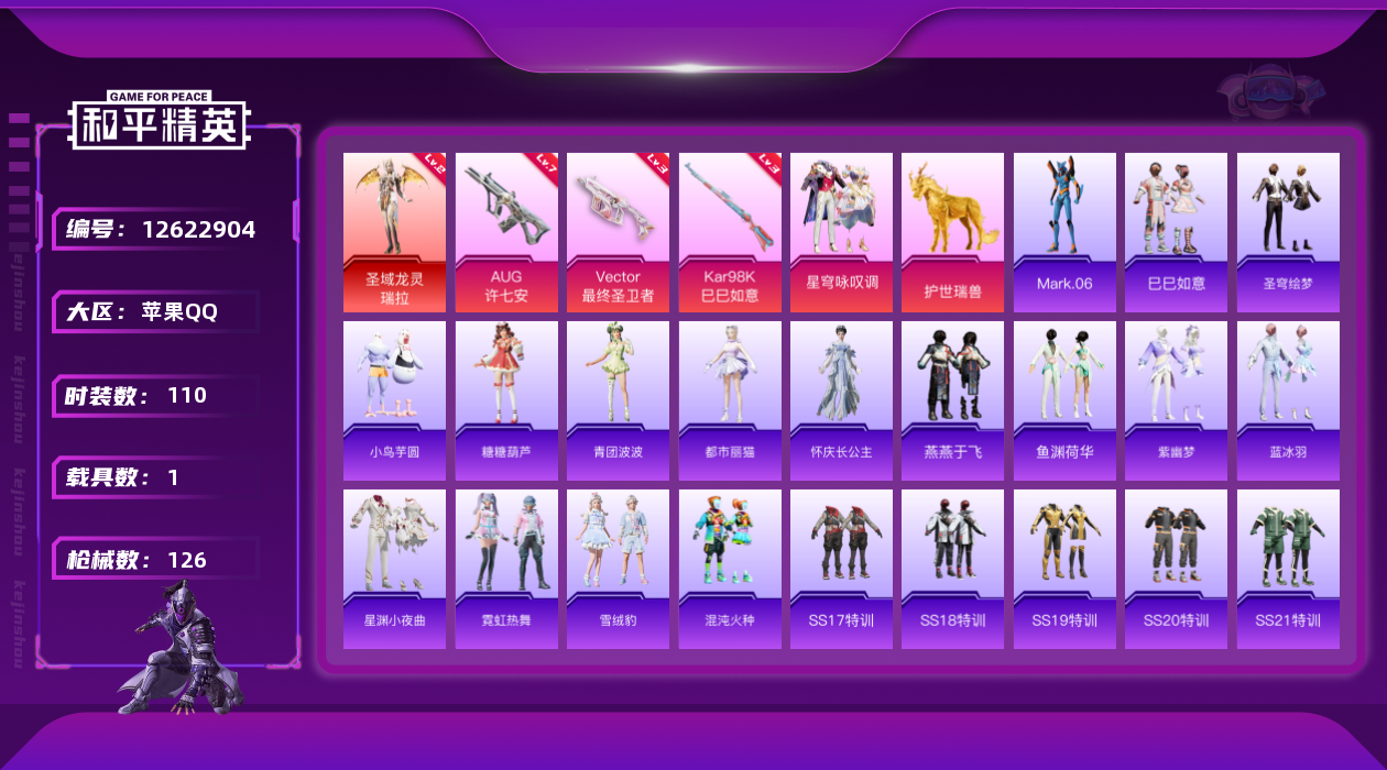 [12622904]素材身法号/地铁满天赋 苹果 手Q-1神装-1粉装-3特效枪-1载具-6粉色飞行器-4.5w热力值-3王牌印记-110套装-126枪皮【红色神装等级】:圣域龙灵-瑞拉(二级)【热门品类】:套装-深海小丑鱼,角色-Mark.06【粉色载具】:护世瑞兽【粉色套装】:粉装-星穹咏叹调【粉色枪皮等级】:AUG-许七安(七级),Vector-最终圣卫者(三级),Kar98K-巳巳如意(三级)【粉色飞行器】:齐天大圣飞行器,沙丘之主天马,龙翔九天飞行器,万象金身飞行器,圣域金龙飞行器