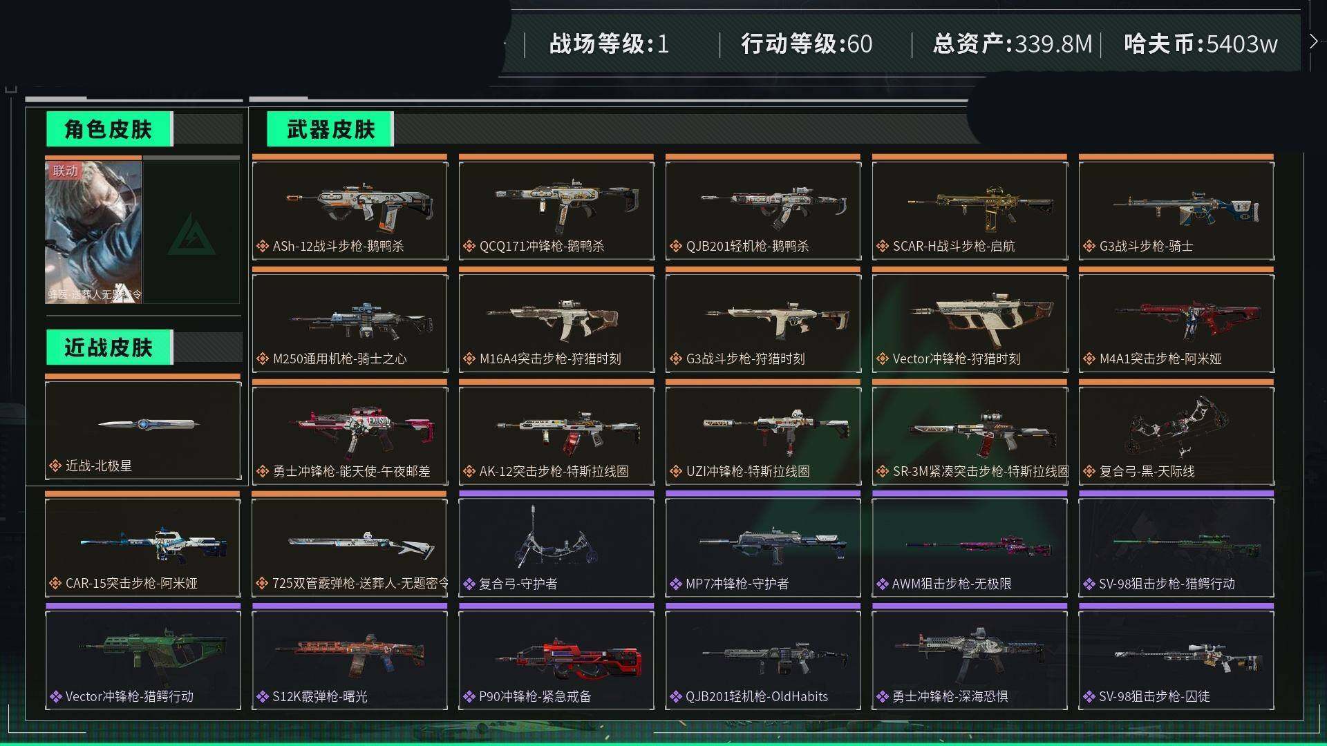【史诗级普通外观】:AKM突击步枪-林中猎手,腾龙突击步枪-无垢,MP5冲锋枪-深海恐惧,SR-3M紧凑突击步枪-荒野求生,勇士冲锋枪-深海恐惧,MP7冲锋枪-无垢,M1014霰弹枪-林中猎手,S12K霰弹枪-曙光,PKM通用机枪-蝮蛇,PKM通用机枪-荒野汤28426总资产339M,哈夫币5403w,近战-北极星,蜂医-送葬人无题密令,枪皮数量144,战场等级:1 无军衔,行动等级:60 白银,安全箱等时效性道具请以游戏内数据为准;详情请看图【个人信息】战场等级:1 无军衔,行动等级:60 白银【哈夫币】5403w【总资产】339M【货币】40三角币/0曼德尔币/89三角券【安全箱】基础安全箱2(1x2)/进阶安全箱4(2x2)/S6高级安全箱6(2x3)【通行证】烽火地带限定版【特勤处】制药台Lv.3/工作台Lv.3/仓库Lv.8/防具台Lv.3/训练中心Lv.7/靶场Lv.6/技术中心Lv.3/指挥中心Lv.6/潜水中心Lv.0/收藏室Lv.1【角色皮肤】蜂医-送葬人无题密令/【已拥有捆绑包】狩猎时刻捆绑包/特斯拉线圈捆绑包/【近战皮肤】近战-黑鹰/近战-北极星/【步枪皮肤】AKM突击步枪-林中猎手/腾龙突击步枪-无垢/SR-3M紧凑突击步枪-荒野求生/CAR-15突击步枪-阿米娅/M4A1突击步枪-阿米娅/G3战斗步枪-狩猎时刻/M16A4突击步枪-狩猎时刻/AK-12突击步枪-特斯拉线圈/SR-3M紧凑突击步枪
