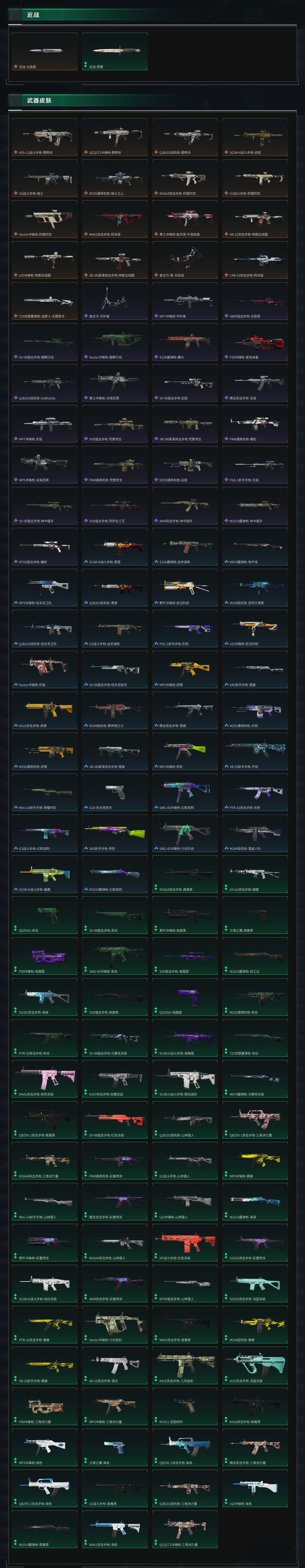 【传说级普通外观】:M4A1突击步枪-阿米娅,ASh-12战斗步枪-鹅鸭杀,M16A4突击步枪-狩猎时刻,AK-12突击步枪-特斯拉线圈,G3战斗步枪-狩猎时刻,CAR-15突击步枪-阿米娅,Vector冲锋枪-狩猎时刻,UZI冲锋枪-特斯拉线圈,SR-3M紧凑突击步枪-特斯拉线圈,QCQ171冲锋枪-鹅鸭杀,725双管霰弹枪-送葬人-无题密令,M250通用机枪-骑士之心,QJB201轻机枪-鹅鸭杀,复合弓-黑·天际线