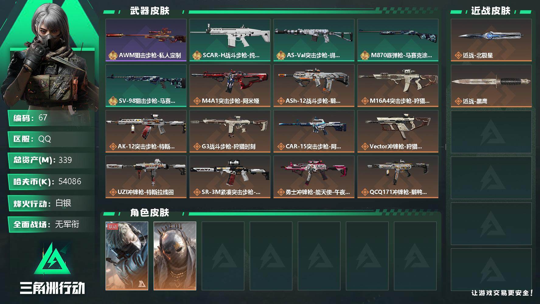 [12623059]54086k哈伏币-247m流动资产-60烽火等级-白银-1战场等级-无军衔 【干员外观】:蜂医-送葬人·无题密令,牧羊人-街头之王 【近战皮肤】:近战-北极星,近战-黑鹰 【典藏外观】:AWM狙击步枪-私人定制,SCAR-H战斗步枪-纯白涂装,AS Val突击步枪-蝴蝶,M870霰弹枪-马赛克涂装,SV-98狙击步枪-马赛克涂装 【传说级普通外观】:M4A1突击步枪-阿米娅,ASh-12战斗步枪-鹅鸭杀,M16A4突击步枪-狩猎时刻,AK-12突击步枪-特斯拉线圈,G3战斗步枪-狩猎时刻,CAR-15突击步枪-阿米娅,Vector冲锋枪-狩猎时刻,UZI冲锋枪-特斯拉线圈,SR-3M紧凑突击步枪-特斯拉线圈,QCQ171冲锋枪-鹅鸭杀,725双管霰弹枪-送葬人-无题密令,M250通用机枪-骑士之心,QJB201轻机枪-鹅鸭杀,复合弓-黑·天际线 【史诗级普通外观】:AKM突击步枪-林中猎手,腾龙突击步枪-无垢,MP5冲锋枪-深海恐惧,SR-3M紧凑突击步枪-荒野求生,勇士冲锋枪-深海恐惧,MP7冲锋枪-无垢,M1014霰弹枪-林中猎手,S12K霰弹枪-曙光,PKM通用机枪-蝮蛇,PKM通用机枪-荒野汤28426总资产339M,哈夫币5403w,近战-北极星,蜂医-送葬人无题密令,枪皮数量144,战场等级:1 无军衔,行动等级:60 白银,安全箱等时效性道具请以游戏内数据为准;详情请看图【个人信息】战场等级:1 无军衔,行动等级:60 白银【哈夫币】5403w【总资产】339M【货币】40三角币/0曼德尔币/89三角券【安全箱】基础安全箱2(1x2)/进阶安全箱4(2x2)/S6高级安全箱6(2x3)【通行证】烽火地带限定版【特勤处】制药台Lv.3/工作台Lv.3/仓库Lv.8/防具台Lv.3/训练中心Lv.7/靶场Lv.6/技术中心Lv.3/指挥中心Lv.6/潜水中心Lv.0/收藏室Lv.1【角色皮肤】蜂医-送葬人无题密令/【已拥有捆绑包】狩猎时刻捆绑包/特斯拉线圈捆绑包/【近战皮肤】近战-黑鹰/近战-北极星/【步枪皮肤】AKM突击步枪-林中猎手/腾龙突击步枪-无垢/SR-3M紧凑突击步枪-荒野求生/CAR-15突击步枪-阿米娅/M4A1突击步枪-阿米娅/G3战斗步枪-狩猎时刻/M16A4突击步枪-狩猎时刻/AK-12突击步枪-特斯拉线圈/SR-3M紧凑突击步枪