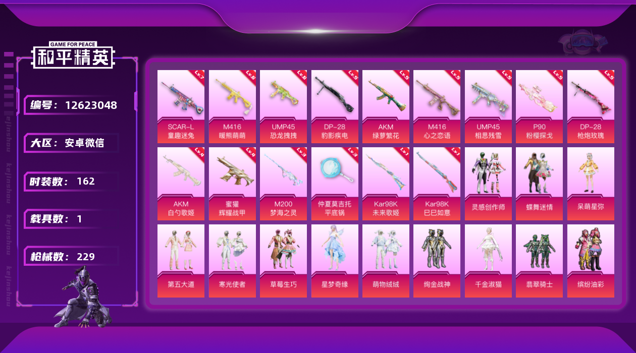 [12623048]素材身法号/无敌战神框1 安卓 微信-无敌战神框-21粉装-15特效枪-1载具-8粉色飞行器-8.8w热力值-21王牌印记-162套装-229枪皮【热门品类】:粉装-缤纷油彩,套装-浪漫天命,套装-深海小丑鱼,套装-小丑鱼,角色-2B战斗服款,套装-龟仙人,套装-粉红小猪【粉色载具】:星梦玉骢【粉色套装】:粉装-蝶舞迷情,粉装-缤纷油彩,粉装-草莓生巧,粉装-翡翠骑士,粉装-绚金战神,粉装-冰霜白皇,粉装-蜜桃特工,粉装-恐龙拽拽,粉装-星夜魔法师,粉装-妙趣可丽,粉装-灵感创作师,粉装-彩虹甜喵,粉装-寒光使者,粉装-第五大道,角色-呆萌星弥,角色-小可学妹,粉装-萌物绒绒,粉装-镜光幻境,角色-星梦奇缘,角色-初号机 觉醒Ver.,角色-千金淑猫【粉色枪皮等级】:AKM-白勺歌姬(四级),AKM-绿萝繁花(五级),SCAR-L-童趣迷兔(七级),M416-心之恋语(五级),M416-暖熊萌萌(六级),蜜獾-辉耀战甲(四级),UMP45-相思残雪(五级),UMP45-恐龙拽拽(六级),P90-粉樱探戈(五级),Kar98K-未来歌姬(一级),Kar98K-巳巳如意(一级),M200-梦海之灵(三级),DP-28-枪炮玫瑰(五级),DP-28-豹影疾电(五级),平底锅-仲夏莫吉托(三级)【粉色飞行器】:夏日绵绵冰飞行器,天之羽翼飞行器,白勺歌姬飞行器,镜光幻境飞行翼,镜域双华-灵镜之阶,龙翔九天飞行器,幻海精灵飞行器,深渊漩涡飞行器