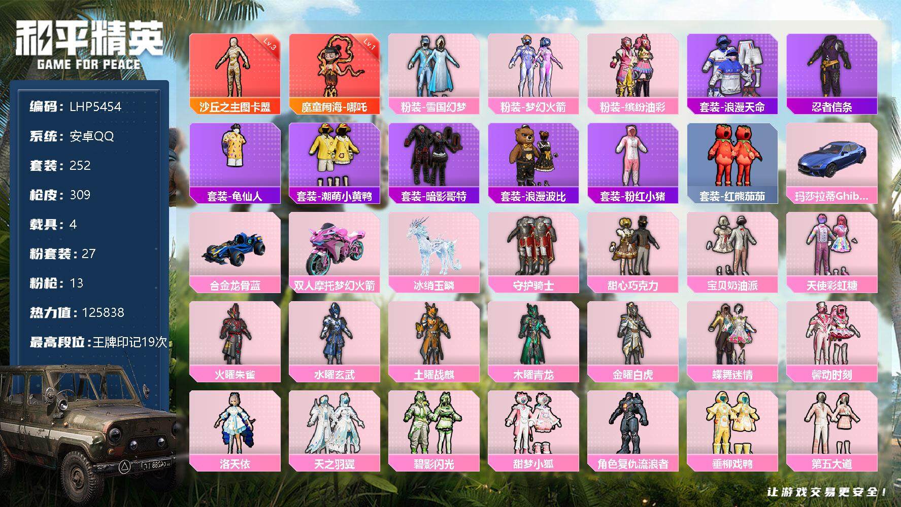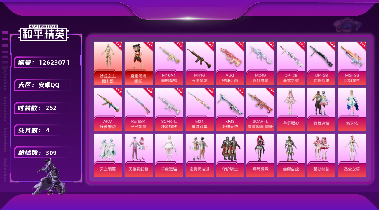 [12623071]素材身法号/绝世印记1 安卓 手Q-2神装-27粉装-13特效枪-4载具-11粉色飞行器-12.5w热力值-19王牌印记-252套装-309枪皮【红色神装等级】:魔童闹海-哪吒(一级),沙丘之主-图卡盟(三级)【热门品类】:粉装-雪国幻梦,粉装-梦幻火箭,粉装-缤纷油彩,套装-浪漫天命,套装-忍者信条,套装-龟仙人,套装-潮萌小黄鸭,套装-暗影哥特,套装-浪漫波比,套装-粉红小猪,套装-红熊茄茄【粉色载具】:玛莎拉蒂Ghibli(蓝),合金龙骨(蓝),双人摩托-梦幻火箭,冰绡玉鳞【粉色套装】:粉装-守护骑士,粉装-甜心巧克力,粉装-宝贝奶油派,粉装-天使彩虹糖,粉装-火曜朱雀,粉装-水曜玄武,粉装-土曜战麒,粉装-木曜青龙,粉装-金曜白虎,粉装-雪国幻梦,粉装-蝶舞迷情,粉装-梦幻火箭,粉装-缤纷油彩,粉装-馨动时刻,角色-洛天依,粉装-天之羽翼,粉装-碧影闪光,粉装-甜梦小狐,角色-复仇流浪者,粉装-垂柳戏鸭,粉装-第五大道,粉装-闲梦青缨,角色-圣堂之誓,套装-创世·救赎,角色-千金淑猫,角色-绯穹魔姬,角色-羊梦糖心【粉色枪皮等级】:AKM-绿萝繁花(五级),M16A4-垂柳戏鸭(七级),SCAR-L-纯梦嫁纱(三级),SCAR-L-魔童闹海 哪吒(一级),M416-五爪金龙(七级),AUG-妙趣可丽(七级),Kar98K-巳巳如意(五级),M24-镜域双华(三级),M249-彩虹甜喵(七级),DP-28-圣堂之誓(七级),DP-28-豹影疾电(五级),MG3-洛神天依(三级),MG-36-沧焰双生(五级)【粉色飞行器】:酣梦熊熊飞行器,春暖花开飞行器,梦幻火箭飞行器,闪光银龙飞行器,沙丘之主天马,镜域双华-灵镜之阶,龙翔九天飞行器,飞天猪飞行器