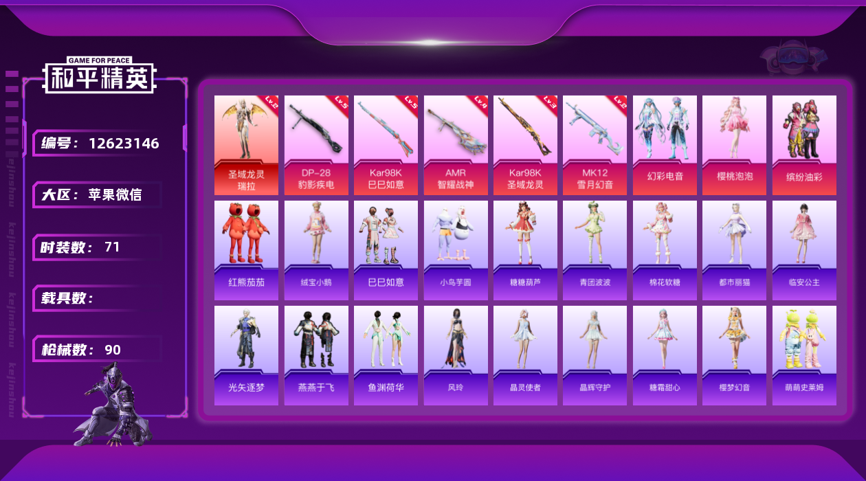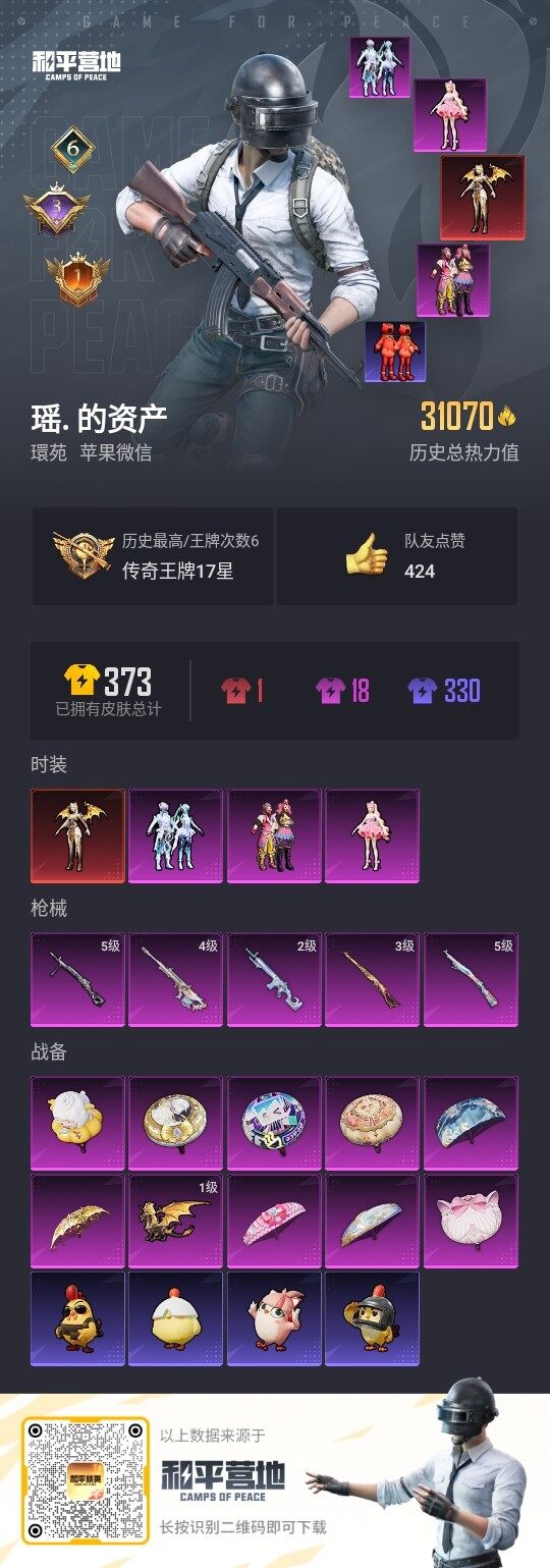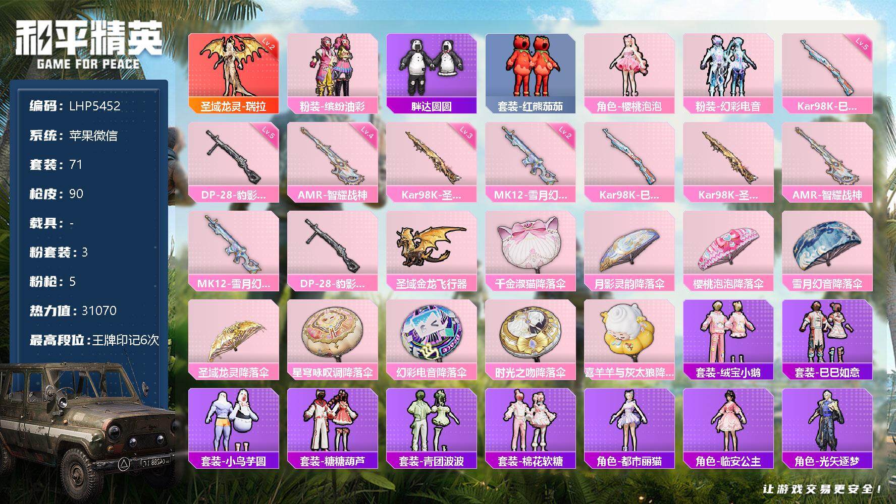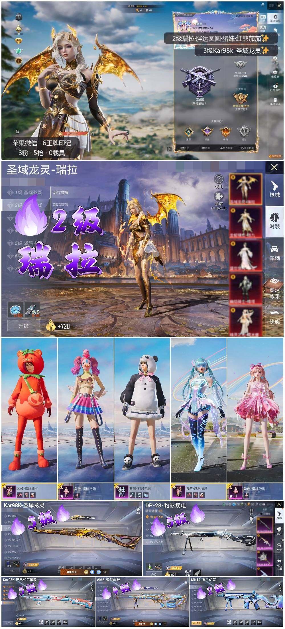 [12623146]素材身法号/地铁满天赋 苹果 微信-1神装-3粉装-5特效枪-1粉色飞行器-3.1w热力值-6王牌印记-71套装-90枪皮【红色神装等级】:圣域龙灵-瑞拉(二级)【热门品类】:粉装-缤纷油彩,套装-胖达圆圆,套装-红熊茄茄【粉色套装】:粉装-缤纷油彩,角色-樱桃泡泡,粉装-幻彩电音【粉色枪皮等级】:汤姆逊-星月云朵(二级MK12-雪月幻音),Kar98K-巳巳如意(五级),Kar98K-圣域龙灵(三级),AMR-智耀战神(四级),DP-28-豹影疾电(五级)【粉色飞行器】:圣域金龙飞行器