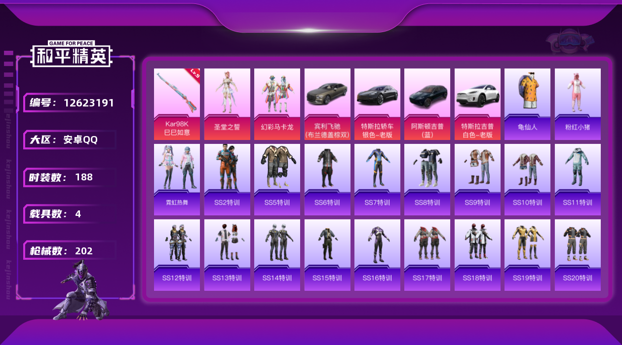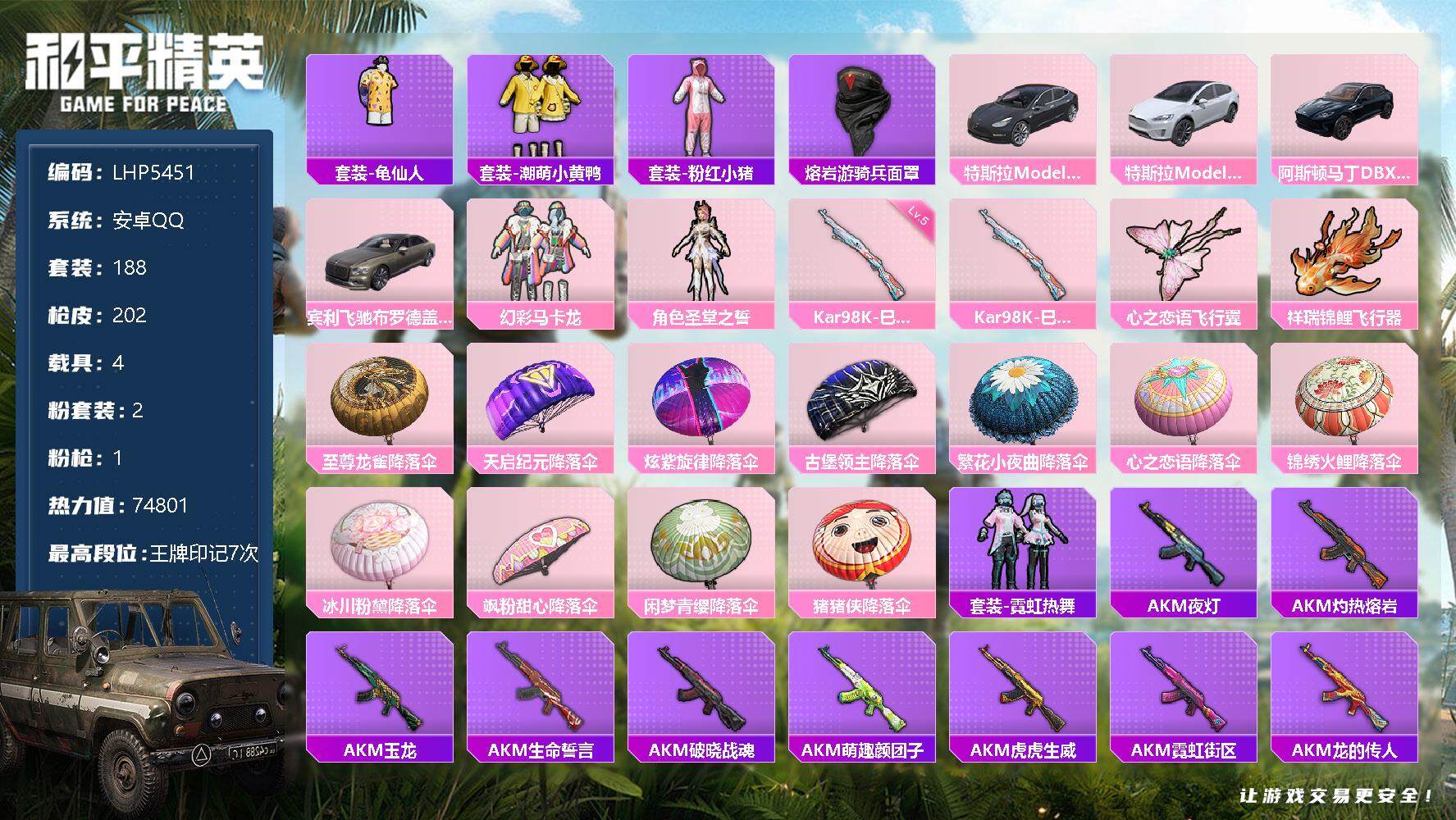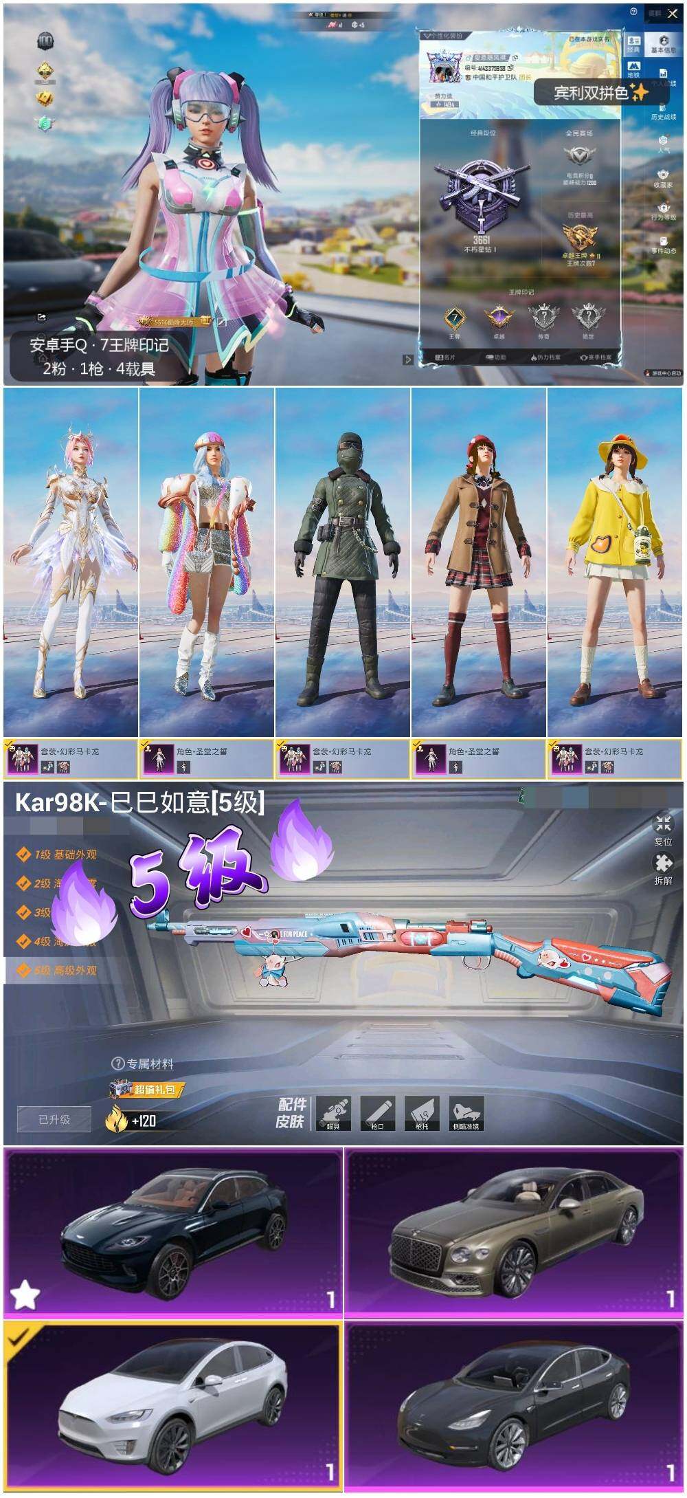 [12623191]素材身法号/地铁满天赋 安卓 手Q-2粉装-1特效枪-4载具-2粉色飞行器-7.4w热力值-7王牌印记-188套装-202枪皮【热门品类】:套装-龟仙人,套装-潮萌小黄鸭,套装-粉红小猪,熔岩游骑兵面罩【粉色载具】:特斯拉Model 3(冷光银),特斯拉Model X(珍珠白),阿斯顿马丁DBX(蓝),宾利飞驰(布罗德盖棕双色)【粉色套装】:粉装-幻彩马卡龙,角色-圣堂之誓【粉色枪皮等级】:Kar98K-巳巳如意(五级)【粉色飞行器】:心之恋语飞行翼,祥瑞锦鲤飞行器