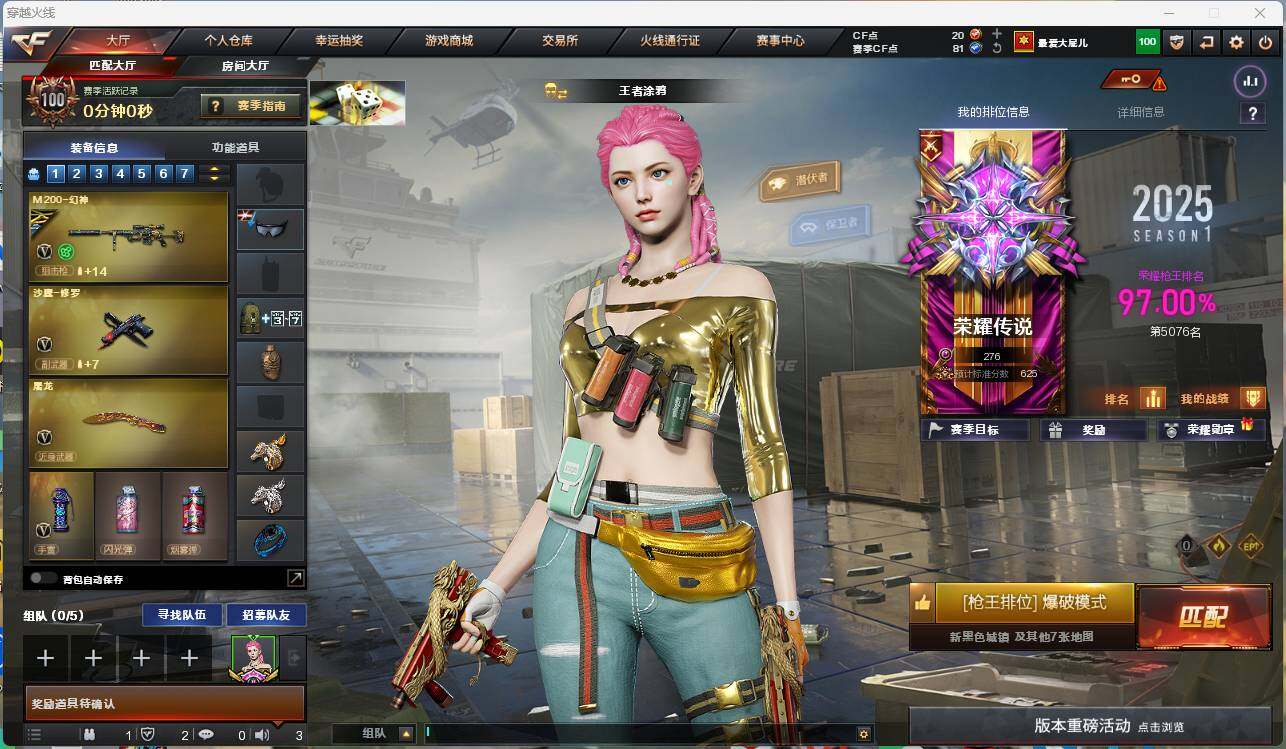 【热门武器】:传说光耀,传说暗裔,QBZ03-金色蔷薇*2,Scar Light-白虎,M200-幻神,死亡之眼,荣耀世冠-雷神,Kar98K-星神,M4A1-黑骑士,RPK-盘龙,加特林-炼狱,USP-钞能力灵狐,羊驼玩偶,沙鹰-修罗,金刚伞