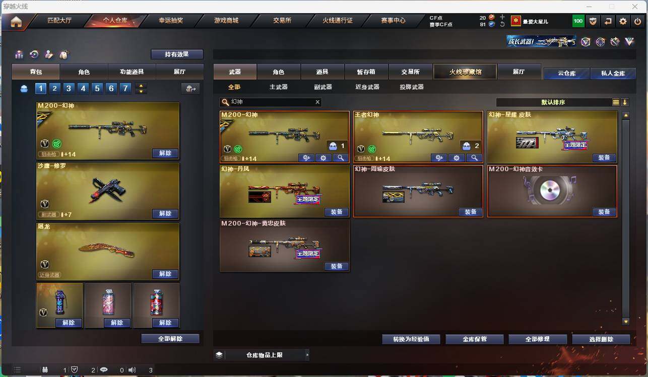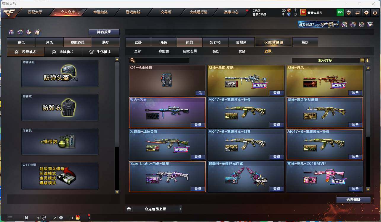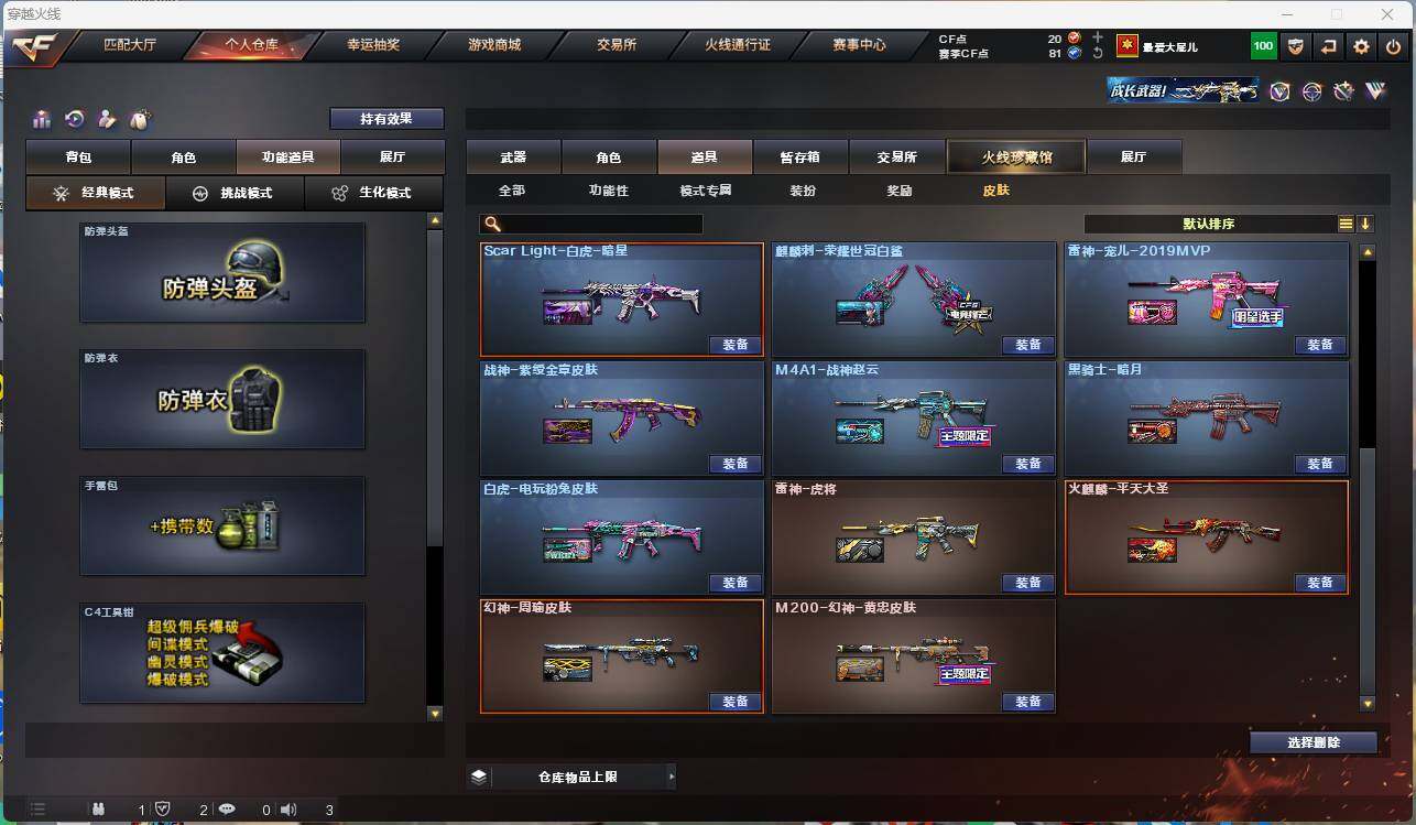 【稀有皮肤】:M200-幻神-黄忠皮肤,幻神-周瑜皮肤,幻神-丹凤,幻神-星耀 皮肤,Scar Light-白虎-暗星,白虎-电玩粉兔皮肤,雷神-虎将,M4A1-战神赵云,雷神-宠儿-2019MVP,火麒麟-战神关羽,火麒麟-平天大圣,黑骑士-暗月,毁灭-风暴