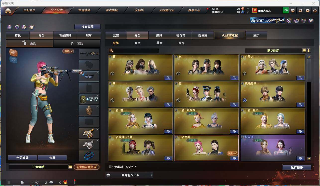 【角色】:王者春,王者涂鸦,王者-魅影,王者-迷迭香,王者玲珑-小乔,灵狐者-职业经理,审判者,零,葵,樱,瞳,战地猎狐,炽天使