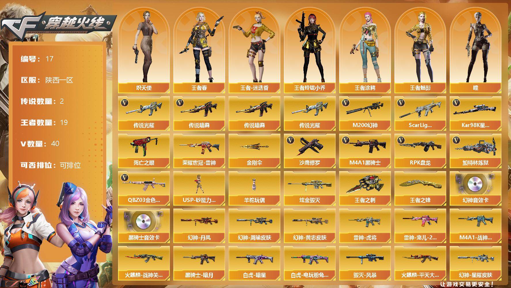 [12623266]陕西一区-40V-19王者-1炫金 【传说武器】:传说光耀,传说暗裔 【热门武器】:传说光耀,传说暗裔,QBZ03-金色蔷薇*2,Scar Light-白虎,M200-幻神,死亡之眼,荣耀世冠-雷神,Kar98K-星神,M4A1-黑骑士,RPK-盘龙,加特林-炼狱,USP-钞能力灵狐,羊驼玩偶,沙鹰-修罗,金刚伞 【王者炫金武器】:炫金毁灭,王者之刺,王者之锋*2 【音效卡】:M200-幻神音效卡,M4A1-黑骑士音效卡 【稀有皮肤】:M200-幻神-黄忠皮肤,幻神-周瑜皮肤,幻神-丹凤,幻神-星耀 皮肤,Scar Light-白虎-暗星,白虎-电玩粉兔皮肤,雷神-虎将,M4A1-战神赵云,雷神-宠儿-2019MVP,火麒麟-战神关羽,火麒麟-平天大圣,黑骑士-暗月,毁灭-风暴 【角色】:王者春,王者涂鸦,王者-魅影,王者-迷迭香,王者玲珑-小乔,灵狐者-职业经理,审判者,零,葵,樱,瞳,战地猎狐,炽天使 【人偶武器】:USP-钞能力灵狐,雷神-枪娘蕾安娜 【暴走生化】:死亡之眼 【英雄级武器】:高爆手雷-竞技荣光*2,荣耀世冠-雷神,QBZ03-金色蔷薇*2,Scar Light-白虎,M4A1-雷神*2,M4A1-黑龙,M4A1-玫瑰精灵,M4A1-黑骑士,RPK-盘龙,加特林-炼狱,AK47-无影,AK47-火麒麟,AK47-黑武士,AK12-天启,AWM-天龙,Barrett-毁灭,AWM-裁决,Kar98K-星神,M200-幻神,AK47-B-战神,AK47-B-常胜将军,沙鹰-天神*2,沙鹰-修罗,龙啸*2,屠龙*3 【特殊枪械】:1白虎,1黑骑士,1盘龙,1炼狱