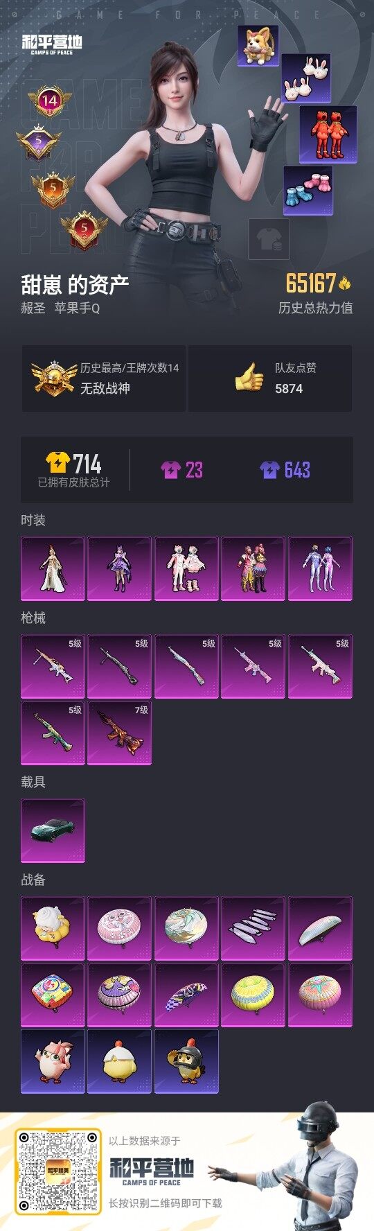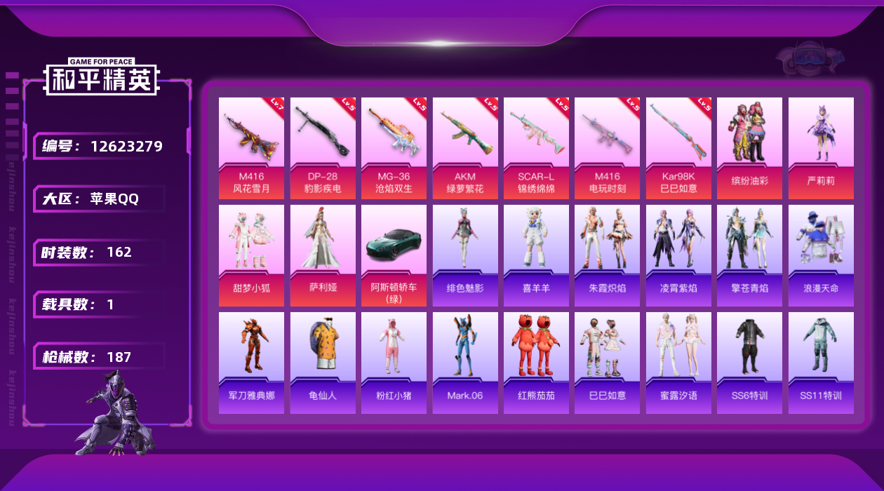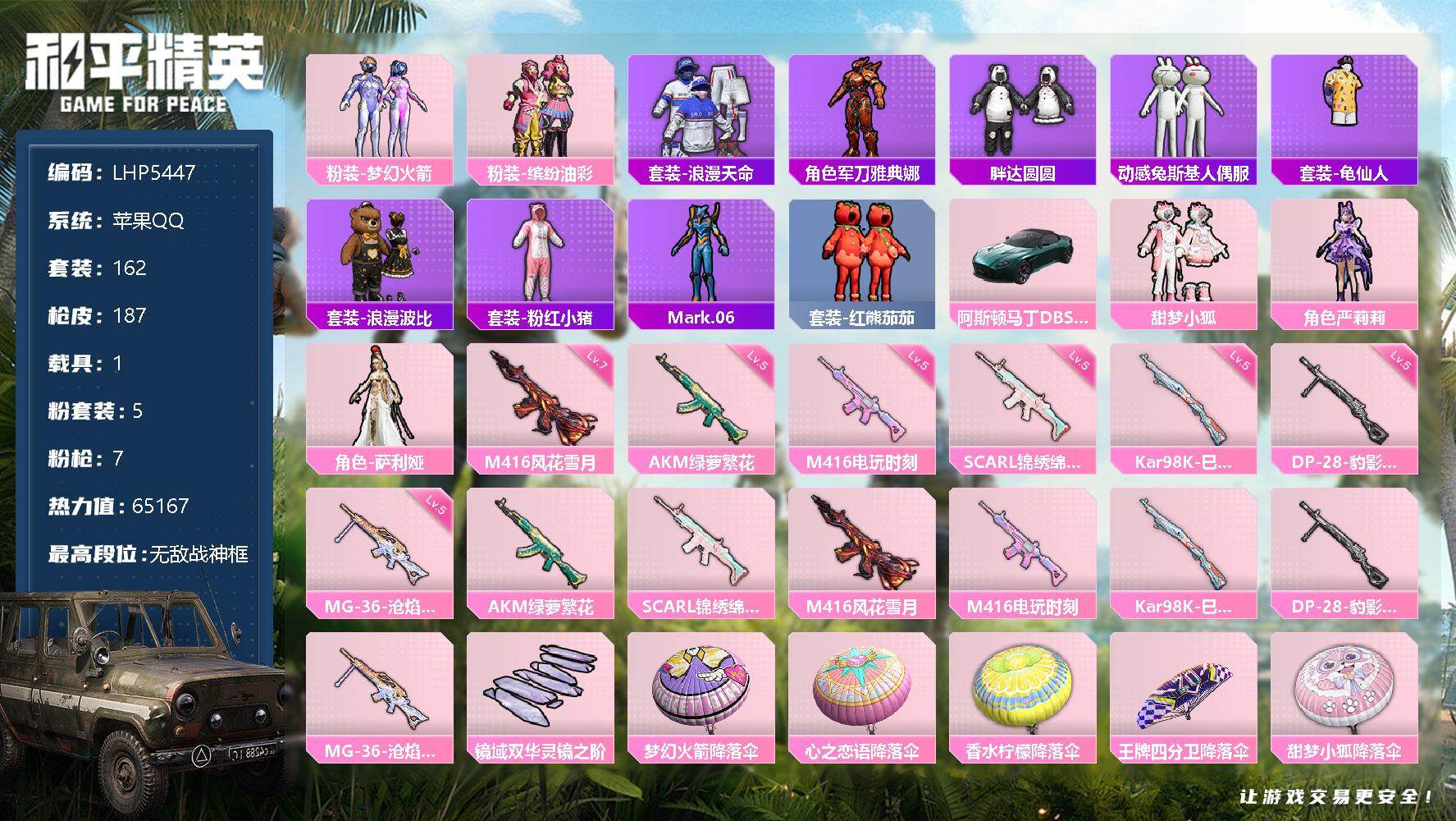 [12623279]素材身法号/无敌战神框1/绝世印记5/ 苹果 手Q-无敌战神框-5粉装-7特效枪-1载具-1粉色飞行器-6.5w热力值-14王牌印记-162套装-187枪皮【热门品类】:粉装-梦幻火箭,粉装-缤纷油彩,套装-浪漫天命,角色-军刀雅典娜,套装-胖达圆圆,套装-动感兔斯基人偶服,套装-龟仙人,套装-浪漫波比,套装-粉红小猪,角色-Mark.06,套装-红熊茄茄【粉色载具】:阿斯顿马丁DBS(绿)【粉色套装】:粉装-梦幻火箭,粉装-缤纷油彩,粉装-甜梦小狐,角色-严莉莉,角色-萨利娅【粉色枪皮等级】:AKM-绿萝繁花(五级),SCAR-L-锦绣绵绵(五级),M416-风花雪月(七级),M416-电玩时刻(五级),Kar98K-巳巳如意(五级),DP-28-豹影疾电(五级),MG-36-沧焰双生(五级)【粉色飞行器】:镜域双华-灵镜之阶