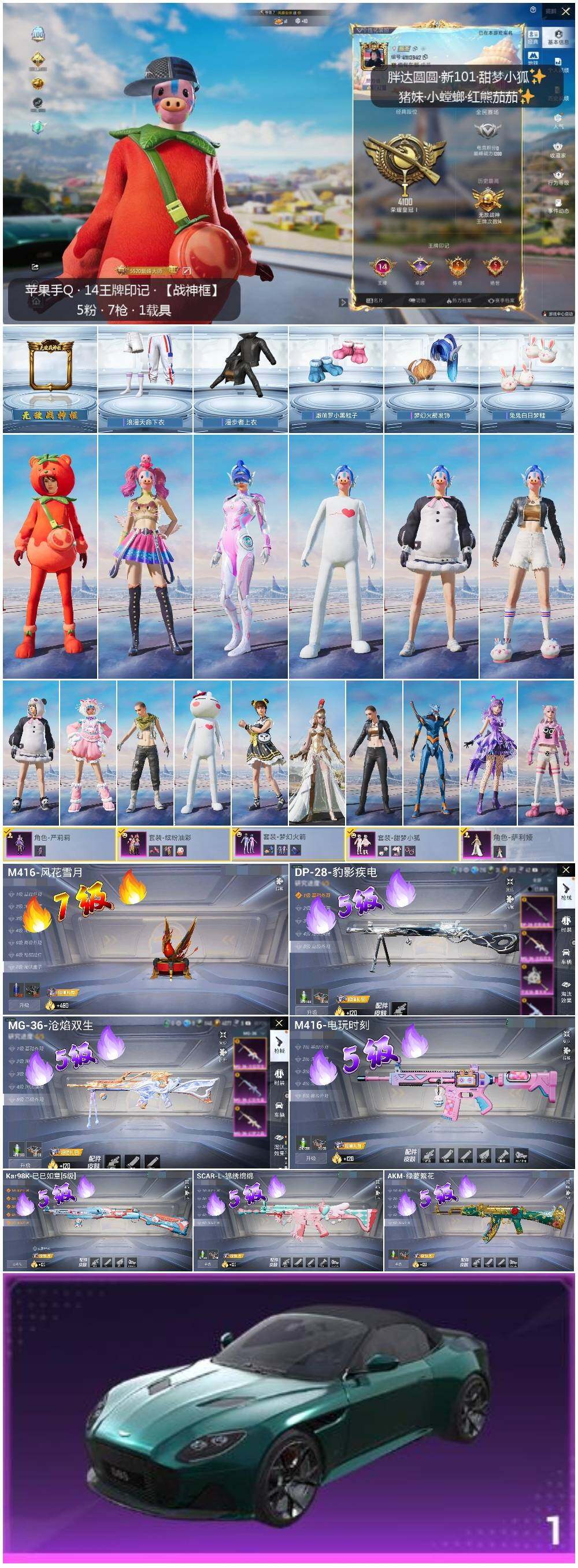 - [11553851]6粉装 6特效枪 4载具 7印记 可二次 可修改实名 女号 身法装备:舞王派对(派对舞王、小金鞋) 优质装备:舞王派对(派对舞王、小金鞋) 热门装扮:月影灵韵,罗征,幻彩电音,金曜白虎,金属狂野,古堡领主,罗小黑,浪客战士,大橘为重,恒星战甲,万圣娃娃,梦魇先生,爱崽白熊,东方飞龙,派对舞王(小金鞋) 载具:帕加尼imola(光影红),合金龙骨(绿),特斯拉Model X(冷光银),特斯拉Model 3(冷光银) 稀有枪皮:AUG-暖羊咩咩,Kar98K-巳巳如意,GROZA-镜光银凌,Kar98K伏魔团,AKM炫紫旋律 七级特效枪:七级Kar98K-伏魔团,七级AKM-炫紫旋律 五级特效枪:五级GROZA-镜光银凌,五级Kar98K-巳巳如意,五级AUG-暖羊咩咩 四级特效枪:四级DP-28-豹影疾电 紫色装扮:SS22特训,SS20特训,SS21特训,SS2特训,SS3特训,SS4特训,SS5特训,人气偶像,SS30特训套装,SS23特训,霓虹热舞,SS31特训套装,云朵鹅,彩虹兔,雪绒豹,SS33特训套装,青涩时光,旭日情侣,顶瓜瓜,SS13特训,SS14特训,SS19特训,冰川特警,SS16特训,天籁歌者,SS17特训,凛冬战士,街头潮人,跃动心情,蓝彩潮人,迅猛虎鲸,都市漫游者,都市魅力,酒红色名流,野性山猫,野性战魂,金鼠迎春,竞技勇士朋克,竞技达人朋克,红色运动,绮丽涂鸦,缤纷果语,耀眼新星,长空猛禽,雨林探路者,游猎者,冰河战士,龙魂突击队,蝶变,蓝海鲸歌,龙腾端午,风暴特警,雪山征服者,雪山精英,雷霆特警,霓虹街区,青年教官,风行保卫者,龙的传人,飞行日记,魅力单车,鹤鸣,黄色伏地魔,黄色名流,黄色格斗者,黄色运动,黎明保卫者,黑色伏地魔,决胜时刻,战地督导,战地菁英,时尚圣诞,朋克治安官,极地朋克,极速红龙,格斗先锋,橘黑制服,沙漠兵团,圣诞大吉,冷焰舞者,刚毅裁决者,北国孤狼,午夜朋克,和平特警,坚韧舞者,夜莺强袭者,完美偶像,帅气教官,幻世战舞者,甜蜜告白,特战装甲,猎鹰,猛禽,王牌教练,甜蜜熊情侣,甜蜜菠萝,疯狂小兔子,白色伏地魔,潮流先锋,派对绅士,海岛探路者,深蓝色名流,湖蓝色名流,牛气满满,灰色格斗者,灼焰舞者,熔岩使者,燃烧卡路里,牛气冲天,拉斐尔,雏菊兔兔,萝兰蝴蝶,纯真浪花,热情海星,SS28特训,燕燕于飞,鱼渊荷华,巳巳如意