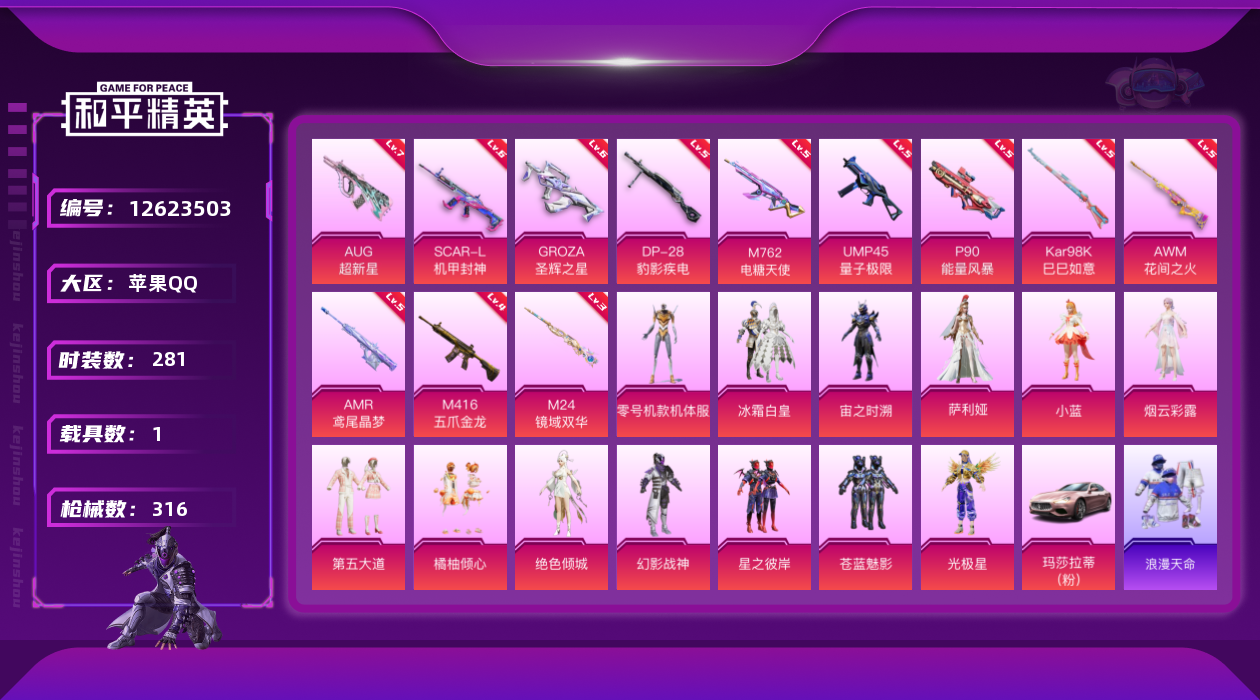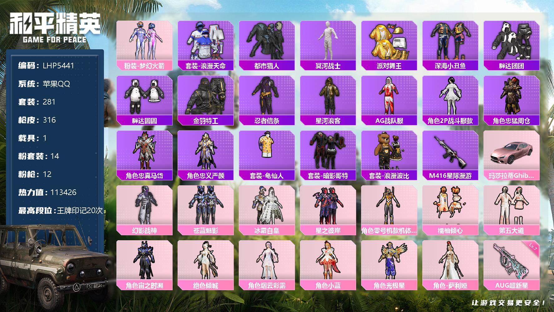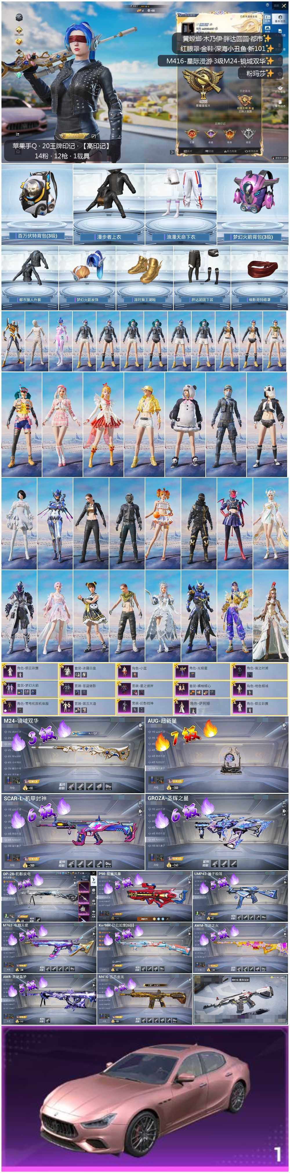 [12623503]素材身法号/老木乃伊/ 苹果 手Q-14粉装-12特效枪-1载具-5粉色飞行器-11.3w热力值-20王牌印记-281套装-316枪皮【热门品类】:粉装-梦幻火箭,套装-浪漫天命,套装-都市猎人,套装-冥河战士,套装-派对舞王,套装-深海小丑鱼,套装-胖达团团,套装-胖达圆圆,套装-金羽特工,套装-忍者信条,套装-星河浪客,套装-AG战队服,角色-2P战斗服款,角色-忠猛周仓,角色-忠真马岱,角色-忠义严颜,套装-龟仙人,套装-暗影哥特,套装-浪漫波比,M416-星际漫游【粉色载具】:玛莎拉蒂Ghibli(粉)【粉色套装】:粉装-幻影战神,粉装-梦幻火箭,粉装-苍蓝魅影,粉装-冰霜白皇,粉装-星之彼岸,角色-零号机款机体服,粉装-橘柚倾心,粉装-第五大道,角色-宙之时溯,角色-绝色倾城,角色-烟云彩露,角色-小蓝,角色-光极星,角色-萨利娅【粉色枪皮等级】:SCAR-L-机甲封神(六级),M416-五爪金龙(四级),GROZA-圣辉之星(六级),AUG-超新星(七级),M762-电糖天使(五级),UMP45-量子极限(五级),P90-能量风暴(五级),Kar98K-巳巳如意(五级),M24-镜域双华(三级),AWM-花间之火(五级),AMR-鸢尾晶梦(五级),DP-28-豹影疾电(五级)【粉色飞行器】:梦幻火箭飞行器,王牌四分卫飞行器,镜域双华-灵镜之阶,绝色倾城飞行器,圣辉之星飞行器