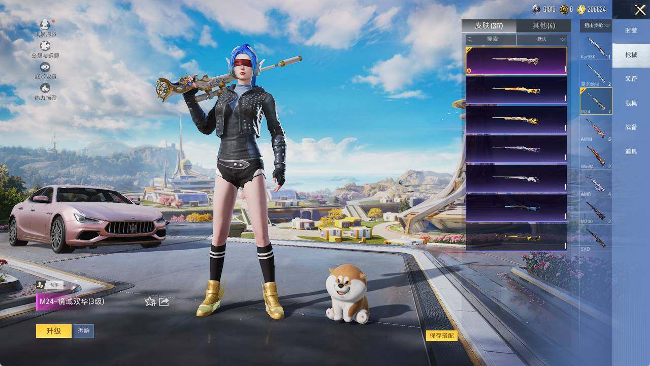 SCAR-L-机甲封神,M416-五爪金龙,GROZA-圣辉之星,AUG-超新星,M762-电糖天使,UMP45-量子极限,P90-能量风暴,Kar98K-巳巳如意,M24-镜域双华,AWM-花间之火,AMR-鸢尾晶梦