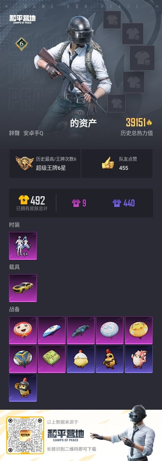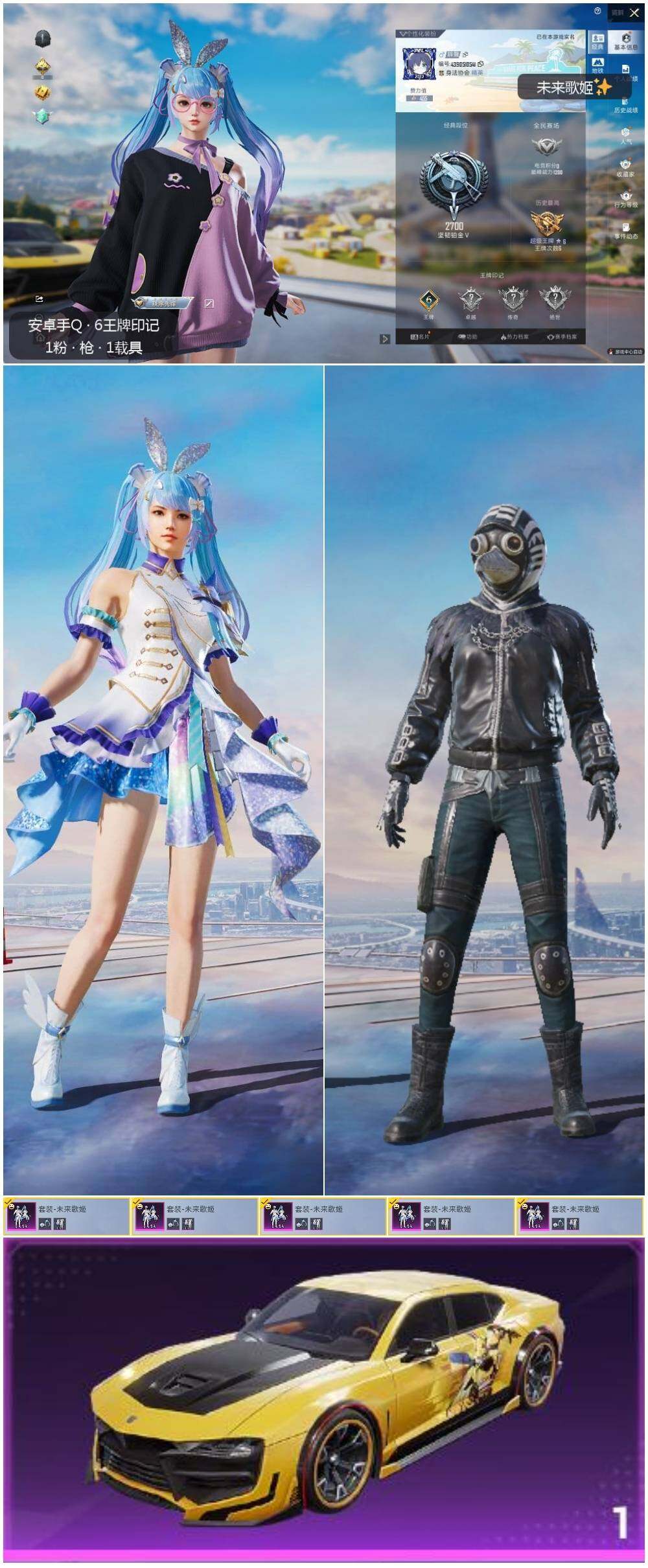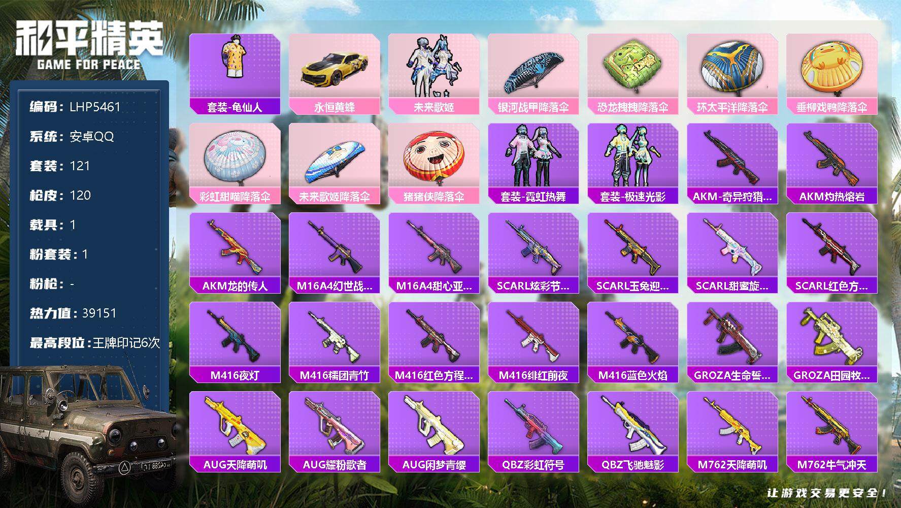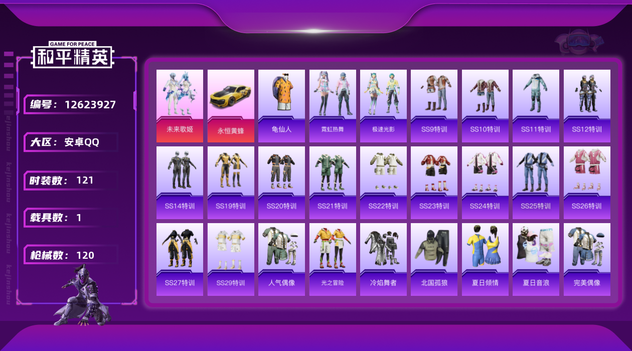 [12623927]安卓 手Q-1粉装-1载具-3.9w热力值-6王牌印记-121套装-120枪皮【热门品类】:套装-龟仙人【粉色载具】:永恒黄蜂【粉色套装】:粉装-未来歌姬