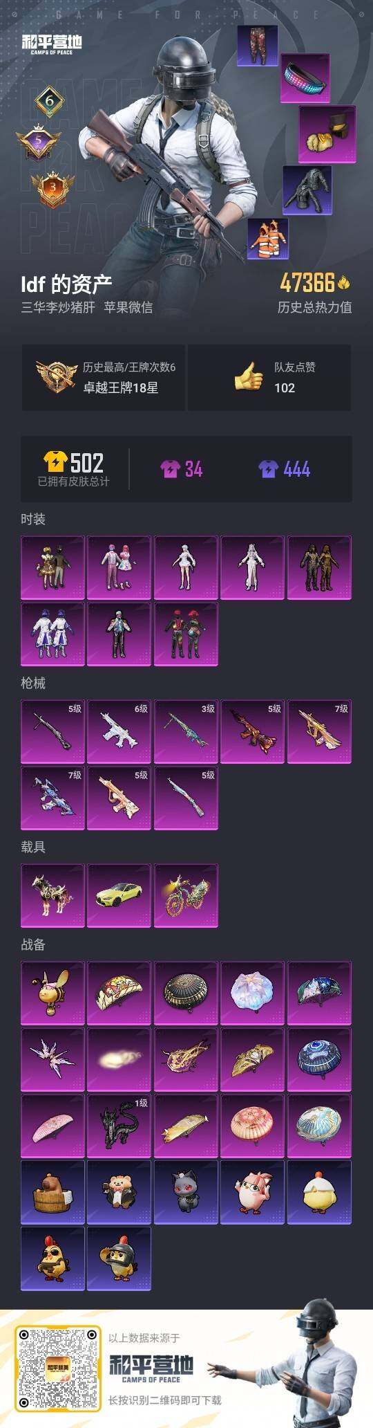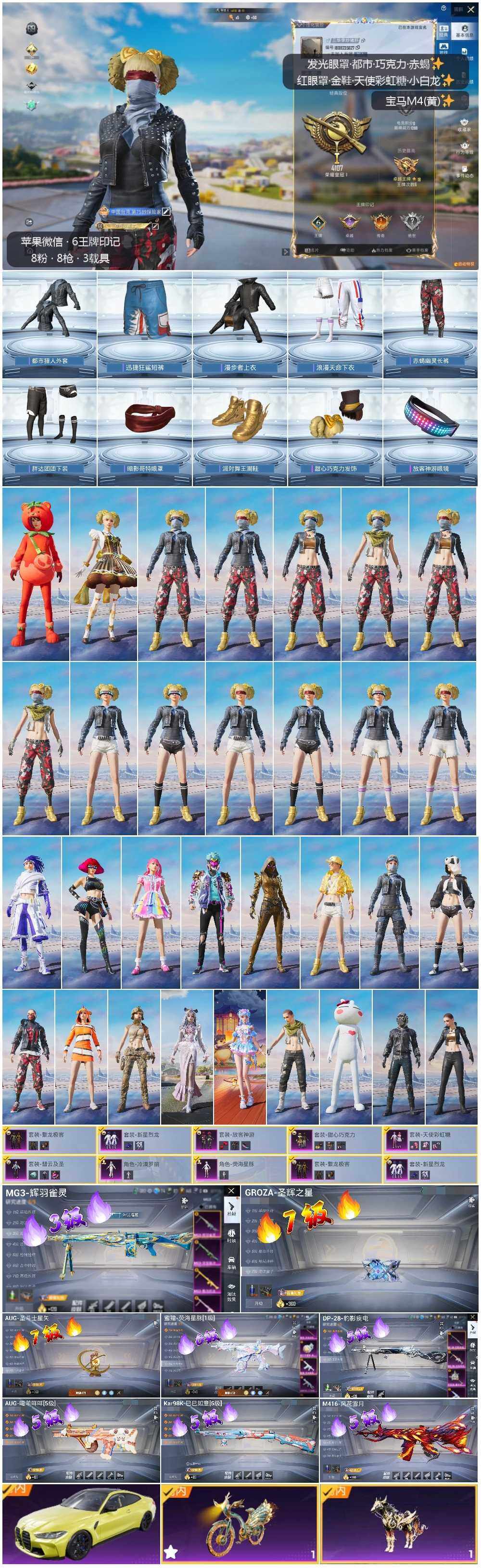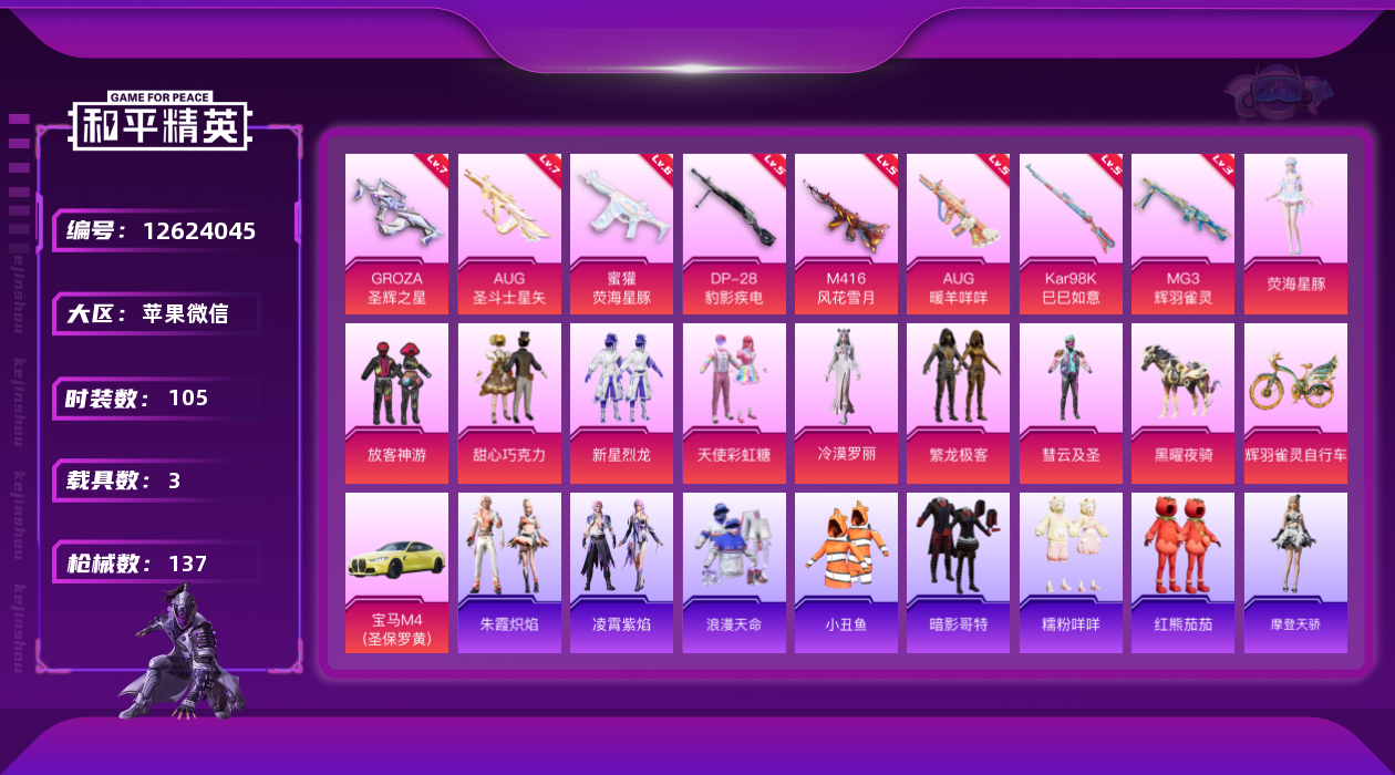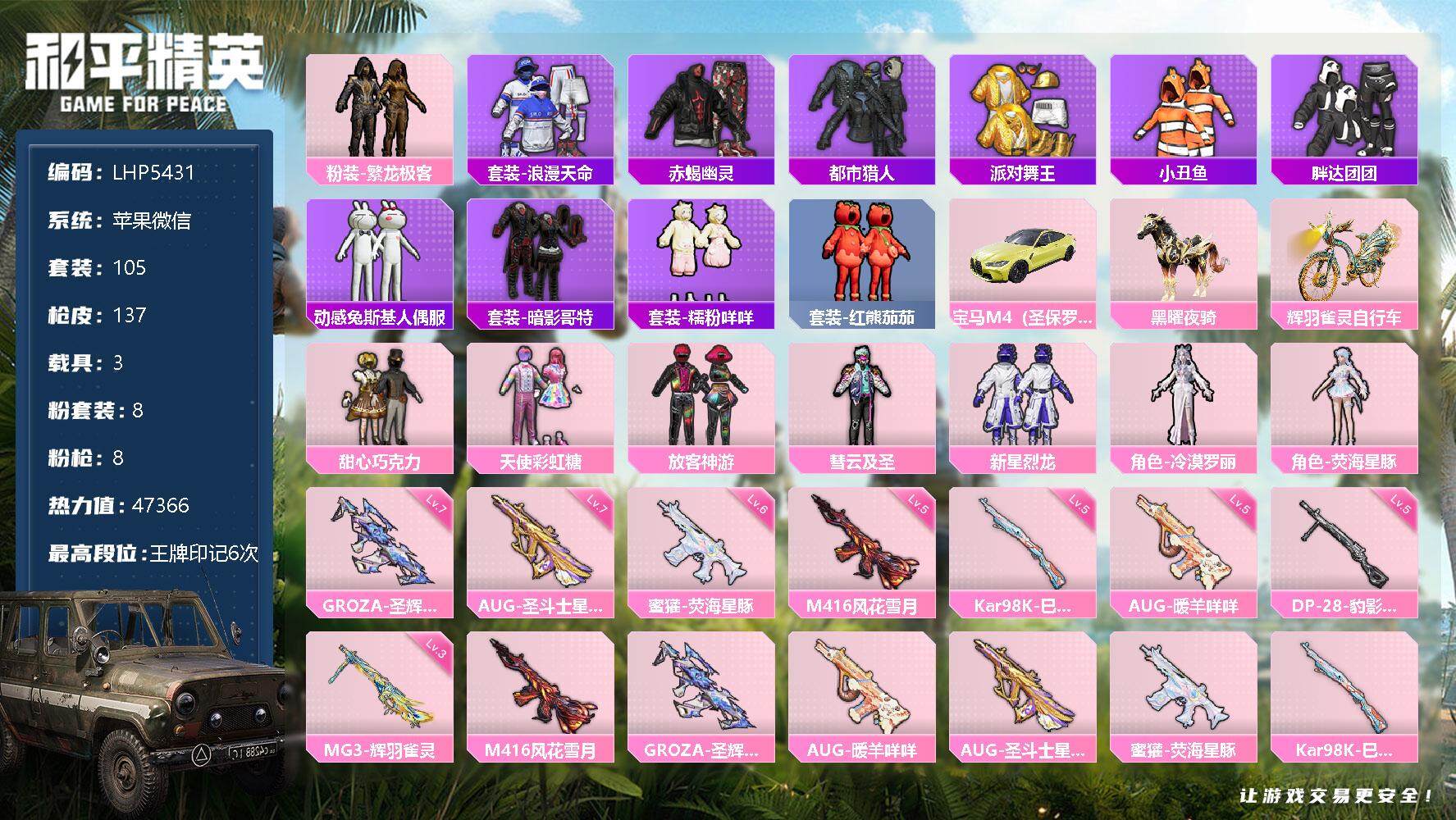 [12624045]素材身法号 苹果 微信-8粉装-8特效枪-3载具-5粉色飞行器-4.7w热力值-6王牌印记-105套装-137枪皮【热门品类】:粉装-繁龙极客,套装-浪漫天命,套装-赤蝎幽灵,套装-都市猎人,套装-派对舞王,套装-小丑鱼,套装-胖达团团,套装-动感兔斯基人偶服,套装-暗影哥特,套装-糯粉咩咩,套装-红熊茄茄【粉色载具】:宝马M4(圣保罗黄),黑曜夜骑,辉羽雀灵自行车【粉色套装】:粉装-甜心巧克力,粉装-天使彩虹糖,粉装-放客神游,粉装-彗云及圣,粉装-新星烈龙,粉装-繁龙极客,角色-冷漠罗丽,角色-荧海星豚【粉色枪皮等级】:M416-风花雪月(五级),GROZA-圣辉之星(七级),AUG-暖羊咩咩(五级),AUG-圣斗士星矢(七级),蜜獾-荧海星豚(六级),Kar98K-巳巳如意(五级),DP-28-豹影疾电(五级),MG3-辉羽雀灵(三级)【粉色飞行器】:齐天大圣飞行器,龙翔九天飞行器,万象金身飞行器,终晖之翼飞行器