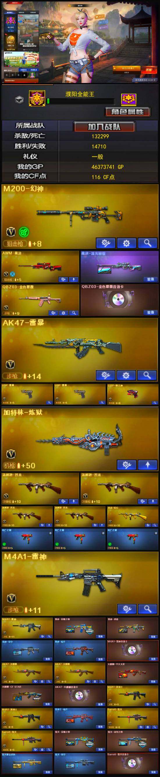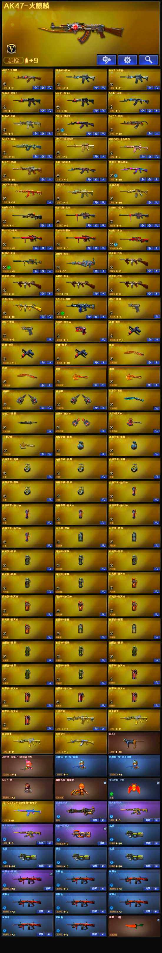 【英雄级武器】:COP-堕天神,麒麟刺-堕天神,龙啸-堕天神,AK47-雷暴,USP-雷暴*2,斩神刀-雷暴,QBZ03-金色蔷薇,无影-神兵利器,M4A1-雷神*2,M4A1-玫瑰精灵,M4A1-黑骑士*2,M4A1-死神,加特林-炼狱,汤姆逊-烈龙*4,AK47-无影,AK47-火麒麟*2,AK47-黑武士,AWM-天龙,Barrett-毁灭*2,Barrett-极光*2,AWM-裁决,AA-12-雷霆,M200-幻神,AK47-黑鲨,M4A1-猎神,黑武士-锦绣游龙,AK-47-猩红传说*2,M4A1-赤狱骑士,沙鹰-修罗*3,麒麟刺*2,龙啸*2,屠龙*2