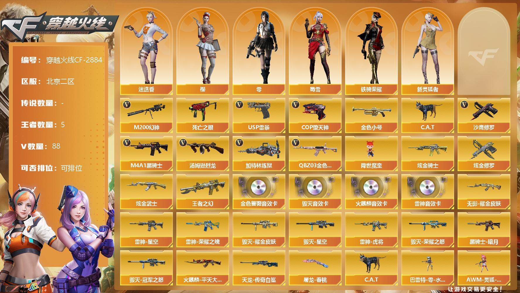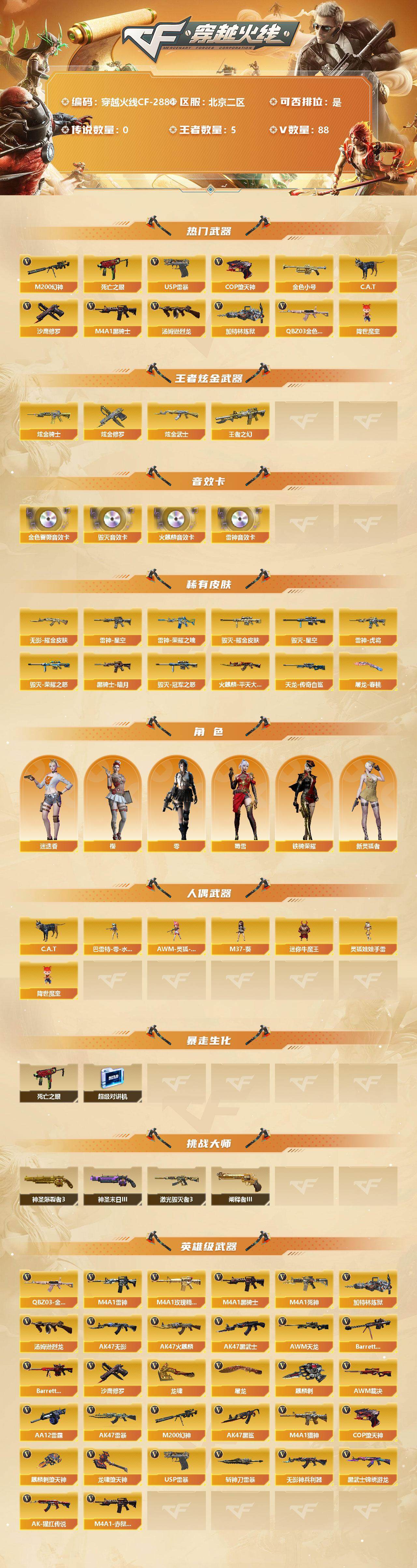 [12624088]北京二区-88V-5王者-4炫金 【热门武器】:QBZ03-金色蔷薇,M200-幻神,死亡之眼*3,金色小号,C.A.T,M4A1-黑骑士*2,汤姆逊-烈龙*4,加特林-炼狱,降世魔童,USP-雷暴*2,COP-堕天神,沙鹰-修罗*3 【王者炫金武器】:炫金骑士*2,炫金修罗,炫金武士,王者之幻 【音效卡】:AK47-火麒麟音效卡,M4A1-雷神音效卡,Barrett-毁灭音效卡,QBZ03-金色蔷薇音效卡 【稀有皮肤】:雷神-荣耀之魄,雷神-星空,雷神-虎将,火麒麟-平天大圣,黑骑士-暗月,毁灭-荣耀之怒,毁灭耀金皮肤,毁灭-星空,毁灭-冠军之怒,AWM-天龙-传奇白鲨,无影耀金皮肤,屠龙-春桃 皮肤 【角色】:零,樱,迷迭香,蜀雪,新灵狐者,铁骑荣耀 【人偶武器】:降世魔童,巴雷特-零-水下丽影*2,AWM-灵狐-15周年嘉年华,M37-葵,C.A.T,迷你牛魔王,灵狐娃娃手雷 【暴走生化】:死亡之眼*3,超级对讲机 【挑战大师】:神圣爆裂者III,神圣爆裂者-末日III,阐释者III,激光毁灭者III*2 【英雄级武器】:COP-堕天神,麒麟刺-堕天神,龙啸-堕天神,AK47-雷暴,USP-雷暴*2,斩神刀-雷暴,QBZ03-金色蔷薇,无影-神兵利器,M4A1-雷神*2,M4A1-玫瑰精灵,M4A1-黑骑士*2,M4A1-死神,加特林-炼狱,汤姆逊-烈龙*4,AK47-无影,AK47-火麒麟*2,AK47-黑武士,AWM-天龙,Barrett-毁灭*2,Barrett-极光*2,AWM-裁决,AA-12-雷霆,M200-幻神,AK47-黑鲨,M4A1-猎神,黑武士-锦绣游龙,AK-47-猩红传说*2,M4A1-赤狱骑士,沙鹰-修罗*3,麒麟刺*2,龙啸*2,屠龙*2 【特殊枪械】:2黑骑士,4烈龙,1炼狱