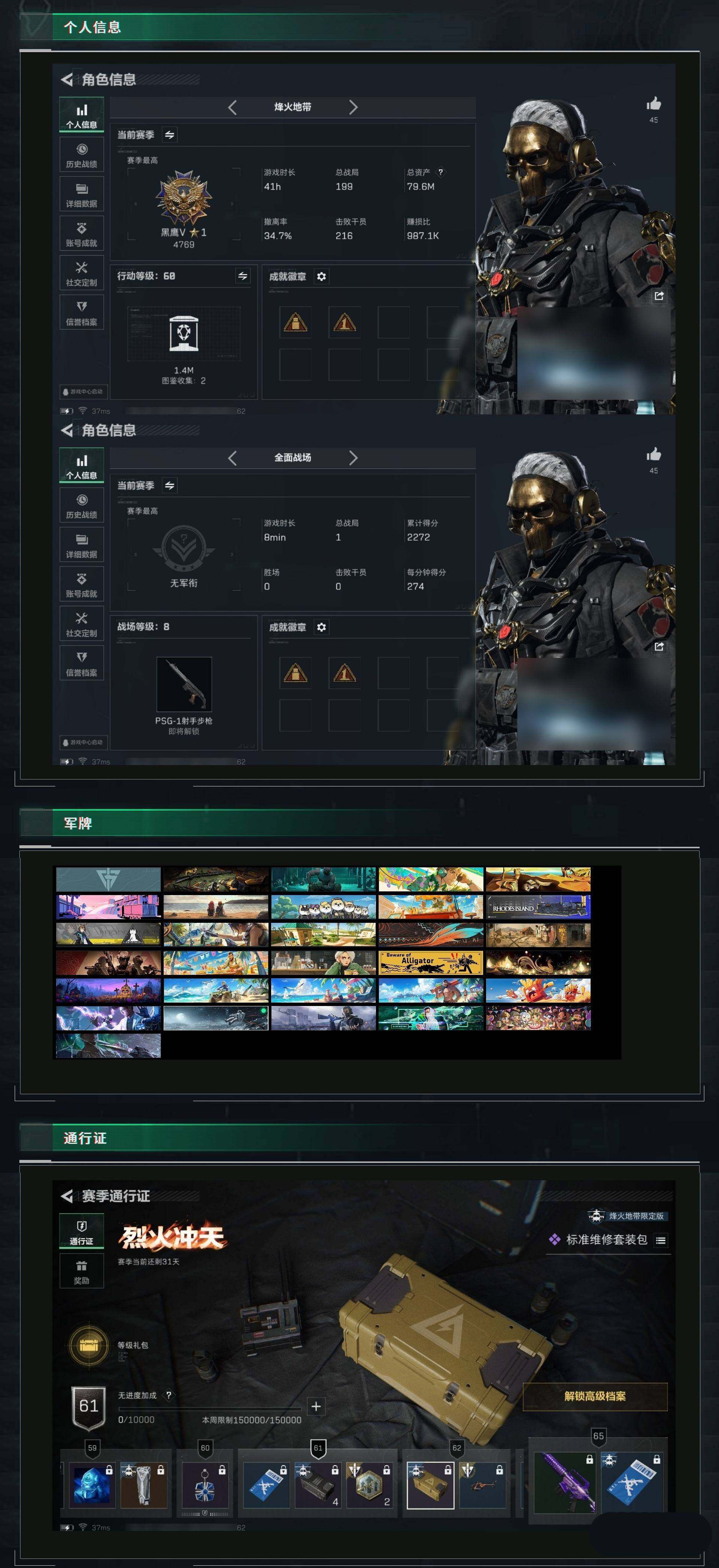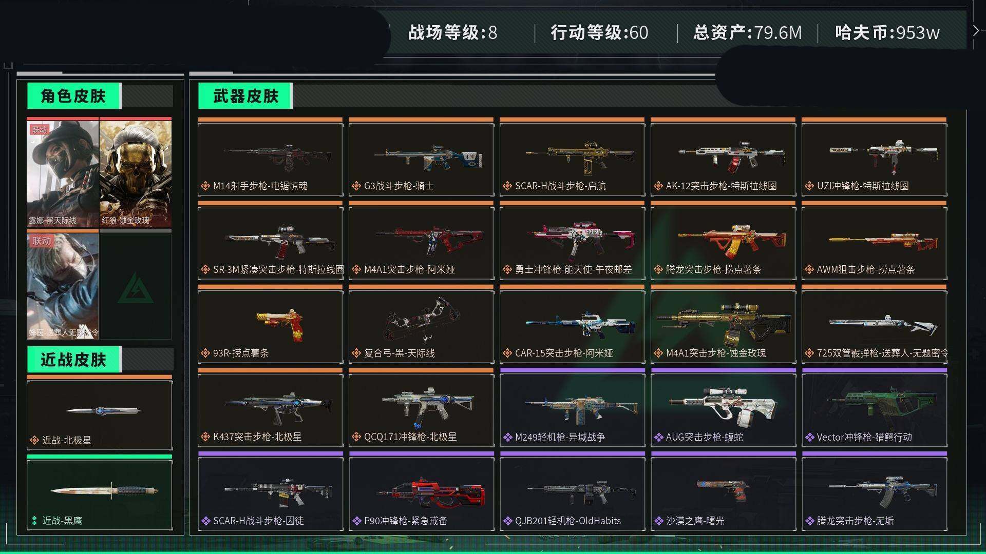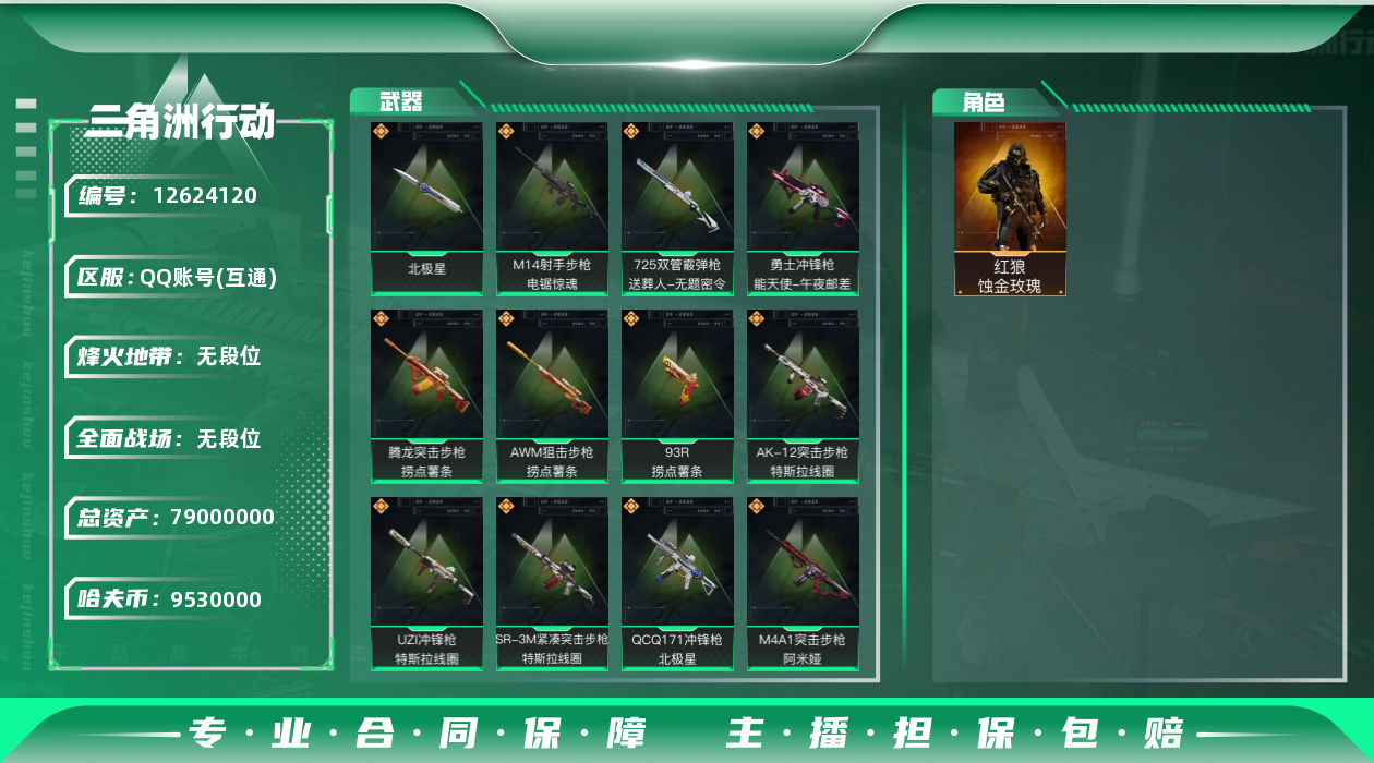 [12624120]汤38925总资产79M,哈夫币953w,枪皮数量132,战场等级:8 无军衔,行动等级:60 黑鹰,角色皮肤数量3,露娜-黑天际线/红狼-蚀金玫瑰/蜂医-送葬人无题密令,近战-北极星/近战-黑鹰,安全箱等时效性道具请以游戏内数据为准;详情请看图【个人信息】战场等级:8 无军衔,行动等级:60 _黑鹰【哈夫币】953w【总资产】79M【货币】35三角币/0曼德尔币/0三角券【安全箱】基础安全箱2(1x2)【通行证】通行证免费版【特勤处】制药台Lv.3/工作台Lv.3/仓库Lv.7/防具台Lv.3/训练中心Lv.6/靶场Lv.4/技术中心Lv.3/指挥中心Lv.4/潜水中心Lv.0/收藏室Lv.1【角色皮肤】露娜-黑天际线/红狼-蚀金玫瑰/蜂医-送葬人无题密令/【已拥有捆绑包】北极星捆绑包/捞点薯条捆绑包/特斯拉线圈捆绑包/【近战皮肤】近战-黑鹰/近战-北极星/【步枪皮肤】M4A1突击步枪-蚀金玫瑰/AUG突击步枪-蝮蛇/SG552突击步枪-深海恐惧/AKM突击步枪-林中猎手/PTR-32突击步枪-英雄/K437突击步枪-北极星/AS Val突击步枪-典狱官/腾龙突击步枪-无垢/SCAR-H战斗步枪-囚徒/M16A4突击步枪-竞赛选手/SR-3M紧凑突击步枪-荒野求生/CAR-15突击步枪-阿米娅/M4A1突击步枪-阿米娅/腾龙突击步枪-捞点薯条/AK-12突击步枪-特斯拉线圈/SR-3M紧凑突击步枪-特斯拉线圈/G3战斗步枪-骑士/SCAR-H战斗步枪-启航/SR-3M紧凑突击步枪-战术竞备/【冲锋枪皮肤】UZI冲锋枪-特斯拉线圈/QCQ171冲锋枪-北极星/MP7冲锋枪-无垢/勇士冲锋枪-能天使-午夜邮差/P90冲锋枪-紧急戒备/Vector冲锋枪-猎鳄行动/勇士冲锋枪-工业狂潮/【霰弹枪皮肤】M1014霰弹枪-林中猎手/725双管霰弹枪-送葬人-无题密令/【轻机枪皮肤】PKM通用机枪-荒野求生/M250通用机枪-囚徒/QJB201轻机枪-OldHabits/M249轻机枪-异域战争/【精准射手步枪皮肤】PSG-1射手步枪-无垢/M14射手步枪-电锯惊魂/【狙击步枪皮肤】SV-98狙击步枪-林中猎手/SVD狙击步枪-荒野求生/AWM狙击步枪-捞点薯条/【手枪皮肤】沙漠之鹰-曙光/93R-捞点薯条/【特殊武器】复合弓-黑-天际线/【挂饰】诡影狙击兵/诡影喷火兵/挂