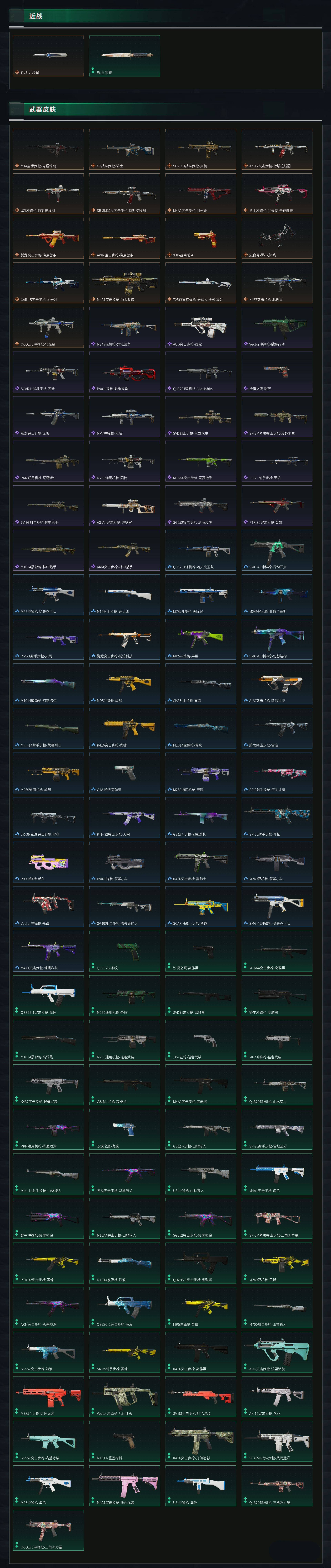 - [12039196]【暑期末清货/特价急出/永久包赔】: 【干员外观】:红狼-蚀金玫瑰,骇爪-水墨云图,露娜-黑·天际线,威龙-飞虎,蜂医-送葬人·无题密令 【典藏外观】:P90冲锋枪-暗鸦,PP19野牛冲锋枪-黄铜,SV-98狙击步枪-马赛克涂装 【传说级普通外观】:M4A1突击步枪-蚀金玫瑰,SCAR-H战斗步枪-水墨云图,CAR-15突击步枪-阿米娅,MP5冲锋枪-黑海,725双管霰弹枪-送葬人-无题密令,QJB201轻机枪-黑海,G18-飞虎,复合弓-黑·天际线 【史诗级普通外观】:AKM突击步枪-林中猎手,SG552突击步枪-深海恐惧,SCAR-H战斗步枪-囚徒,AS Val突击步枪-典狱官,腾龙突击步枪-无垢,MP5冲锋枪-深海恐惧,SR-3M紧凑突击步枪-荒野求生,勇士冲锋枪-深海恐惧,MP7冲锋枪-无垢,M1014霰弹枪-林中猎手,S12K霰弹枪-曙光,PKM通用机枪-荒野求生,SVD狙击步枪-荒野求生,PSG-1射手步枪-无垢,SV-98狙击步枪-林中猎手,SV-98狙击步枪-囚徒,沙漠之鹰-曙光 【稀有级普通外观】:K416突击步枪-虎啸,SCAR-H战斗步枪-荣耀列队,PTR-32突击步枪-天网,PTR-32突击步枪-英雄,CAR15突击步枪-亚特兰蒂斯,腾龙突击步枪-雪崩,K437突击步枪-天狼星,MP5冲锋枪-弄臣,MP5冲锋枪-虎啸,P90冲锋枪-新生,Vector冲锋枪-先锋,SMG-45冲锋枪-哈夫克卫队,SMG-45-行动开启,SMG-45冲锋枪-幻影结构,SMG-45冲锋枪-天网,SR-3M紧凑突击步枪-雪崩,M1014霰弹枪-幻影结构,M250通用机枪-虎啸,M250通用机枪-天网,Mini-14射手步枪-荣耀列队,SKS射手步枪-弄臣,SKS射手步枪-雪崩,SR-25射手步枪-开拓,SR-9射手步枪-街头涂鸦,SV-98狙击步枪-星链科技,G18-星链科技 【普通级普通外观】:M4A1突击步枪-粉色涂装,M4A1突击步枪-高雅黑,M4A1突击步枪-海色,AKM突击步枪-彩墨喷涂,QBZ95-1突击步枪-高雅黑,QBZ95-1突击步枪-海浪,QBZ95-1突击步枪-海色,K416突击步枪-几何迷彩,K416突击步枪-高雅黑,M16A4突击步枪-三角洲力量,M16A4突击步枪-山林猎人,AUG突击步枪-浅蓝涂装,M7战斗步枪-红色涂装,SG552突