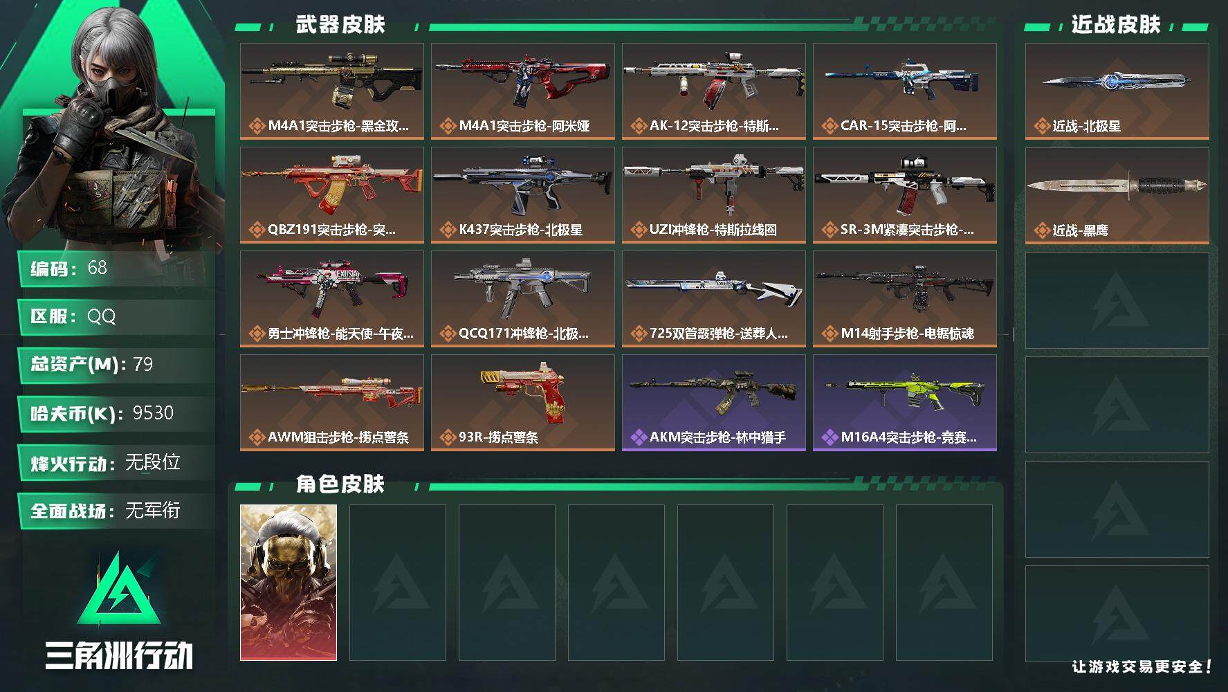 - [11681390]总资产:116.8M 7传说枪械 哈夫币:60.773K 可二次 可修改实名 烽火地带段位:黄金 全面战场段位:无段位 传说武器皮肤:AWM狙击步枪-捞点薯条,腾龙突击步枪-捞点薯条,93R-捞点薯条,勇士冲锋枪-能天使-午夜邮差,复合弓-黑-天际线,M4A1突击步枪-阿米娅,CAR-15突击步枪-阿米娅