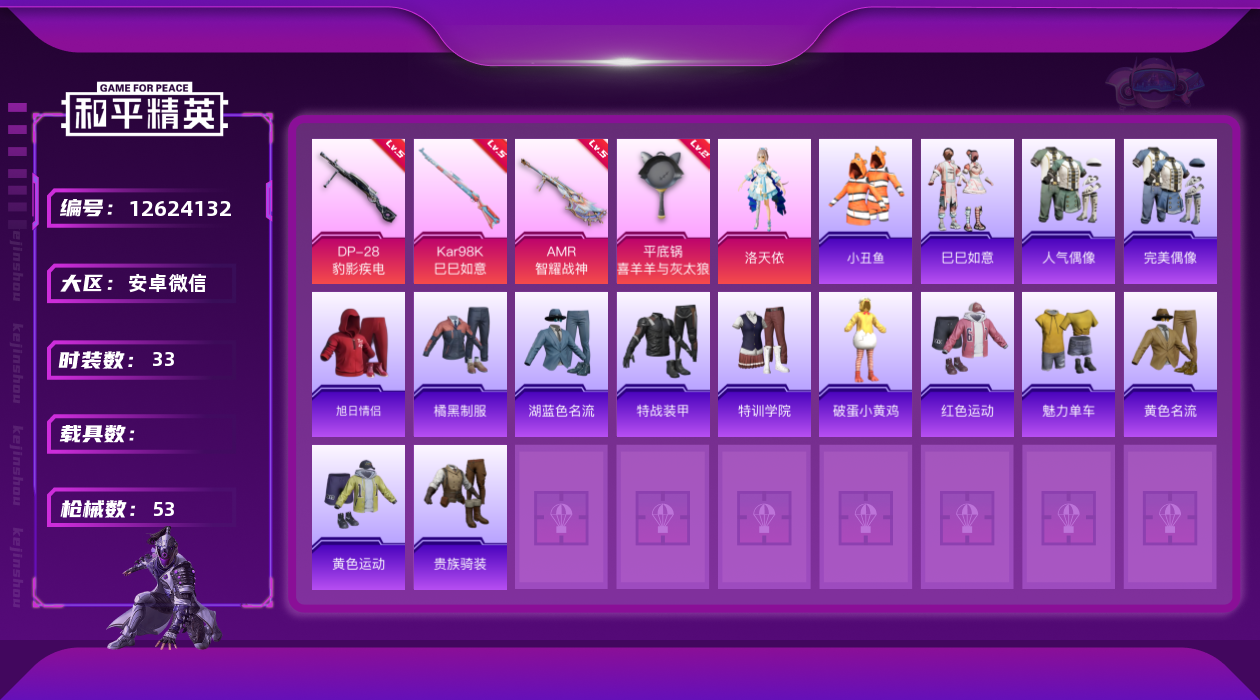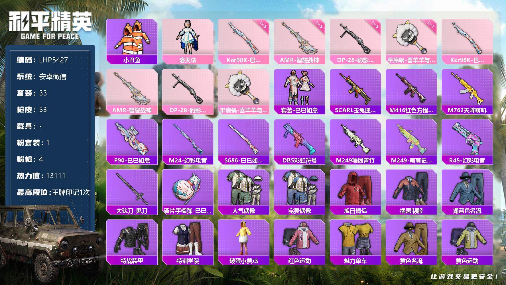 [12624132]地铁满天赋 安卓 微信-1粉装-4特效枪-1.3w热力值-1王牌印记-33套装-53枪皮【热门品类】:套装-小丑鱼【粉色套装】:角色-洛天依【粉色枪皮等级】:Kar98K-巳巳如意(五级),AMR-智耀战神(五级),DP-28-豹影疾电(五级),平底锅-喜羊羊与灰太狼(二级)