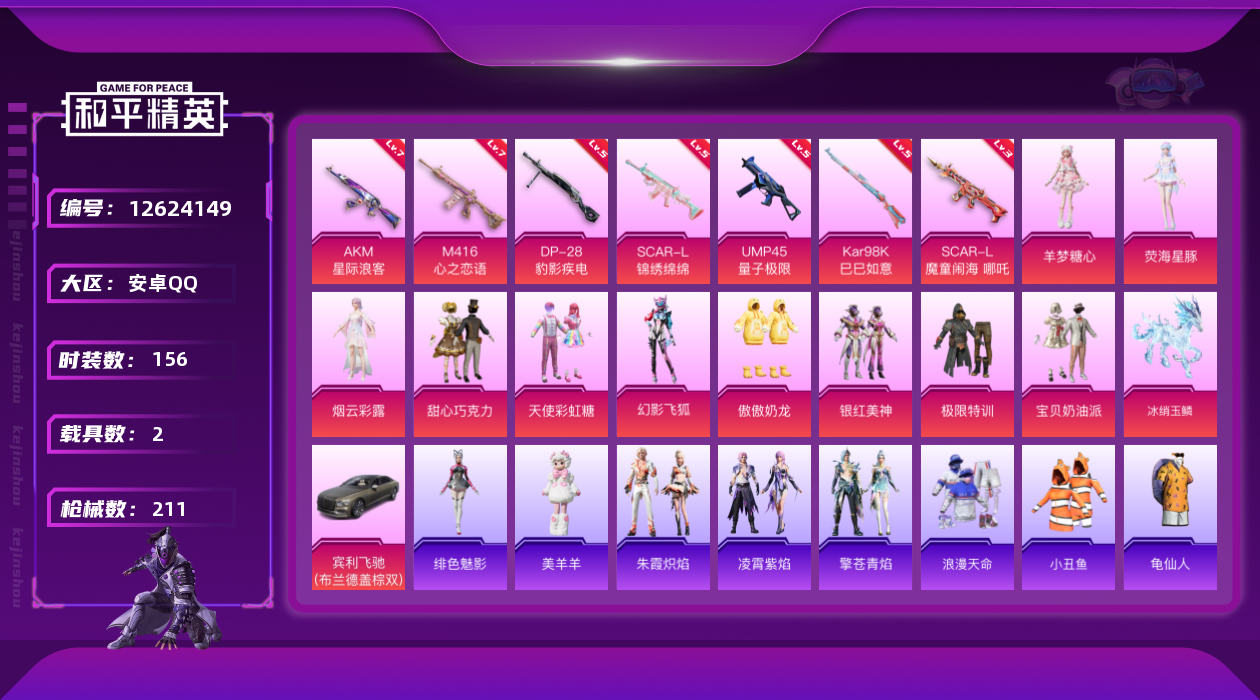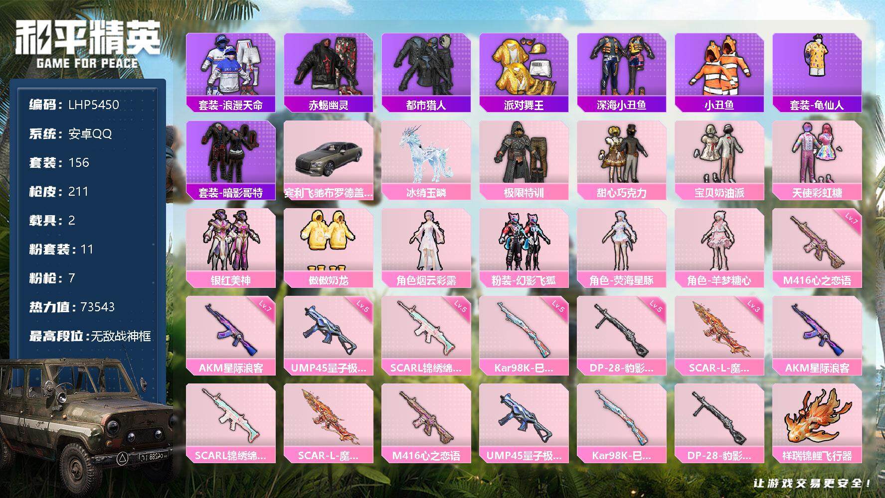 [12624149]素材身法号/无敌战神框1/绝世印记4/地铁满天赋 安卓 手Q-无敌战神框-11粉装-7特效枪-2载具-5粉色飞行器-7.3w热力值-13王牌印记-156套装-211枪皮【热门品类】:套装-浪漫天命,套装-赤蝎幽灵,套装-都市猎人,套装-派对舞王,套装-深海小丑鱼,套装-小丑鱼,套装-龟仙人,套装-暗影哥特【粉色载具】:宾利飞驰(布罗德盖棕双色),冰绡玉鳞【粉色套装】:粉装-极限特训,粉装-甜心巧克力,粉装-宝贝奶油派,粉装-天使彩虹糖,粉装-银红美神,粉装-傲傲奶龙,角色-烟云彩露,粉装-幻影飞狐,角色-荧海星豚,角色-羊梦糖心【粉色枪皮等级】:AKM-星际浪客(七级),SCAR-L-锦绣绵绵(五级),SCAR-L-魔童闹海 哪吒(三级),M416-心之恋语(七级),UMP45-量子极限(五级),Kar98K-巳巳如意(五级),DP-28-豹影疾电(五级)【粉色飞行器】:祥瑞锦鲤飞行器,灵猫魔法师飞行器,飞天猪飞行器,灵珠游龙飞行器