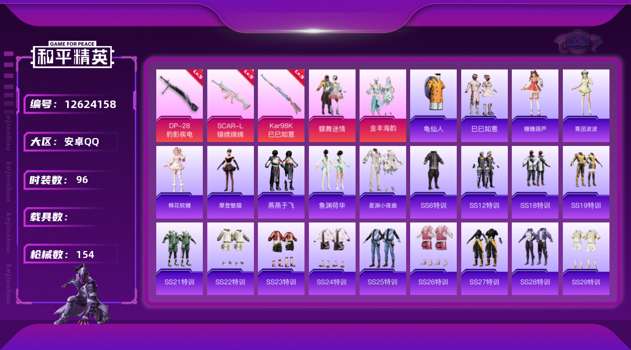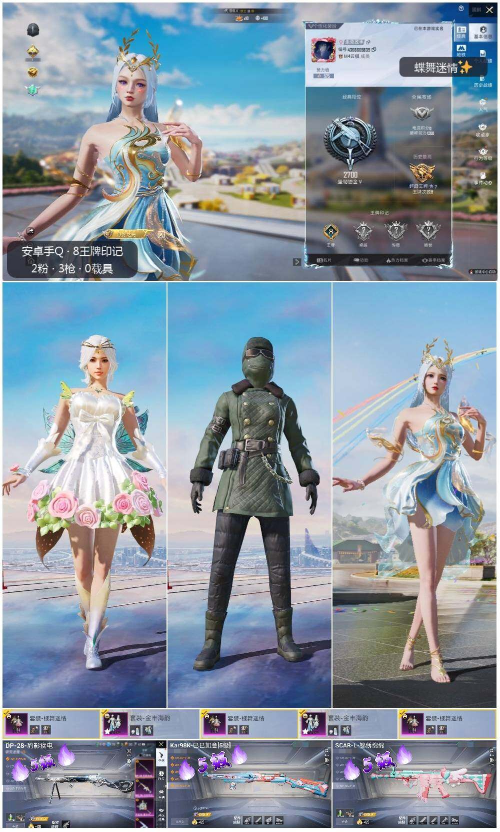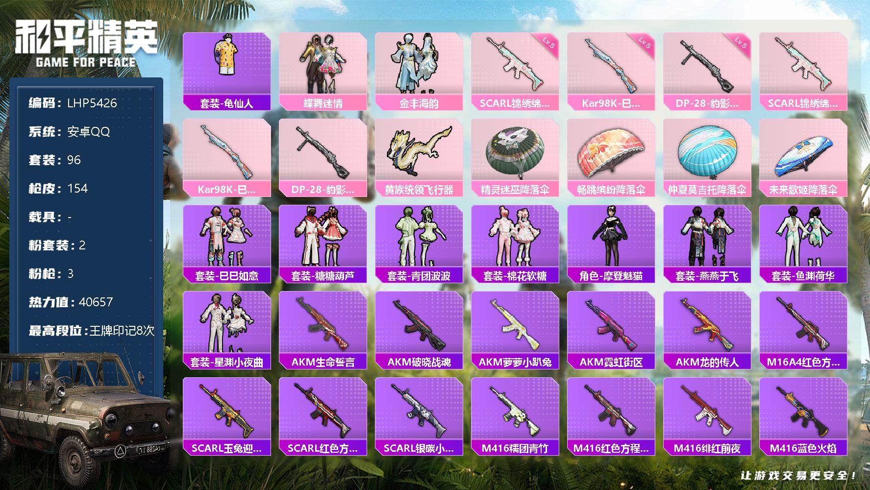 [12624158]安卓 手Q-2粉装-3特效枪-1粉色飞行器-4w热力值-8王牌印记-96套装-154枪皮【热门品类】:套装-龟仙人【粉色套装】:粉装-蝶舞迷情,粉装-金丰海韵【粉色枪皮等级】:SCAR-L-锦绣绵绵(五级),Kar98K-巳巳如意(五级),DP-28-豹影疾电(五级)【粉色飞行器】:黄族统领飞行器