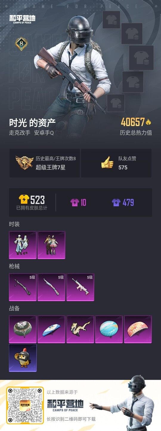 - PX_2109291- 苹果手Q-5王牌印记-6粉装-2特效枪-3载具-60504热力值-150套装-195枪皮-3卓越印记-2传奇印记 【6粉装】,蝶舞迷情,极致幻想,狂花道·不知火舞,飓风飞鹰,金域紫灵,星梦奇缘 【2特效枪】M416-心之恋语-7级 Kar98K-巳巳如意-5级 【4稀有紫装】,Mark.06,雪山精英,浪漫波比,龟仙人, 【3稀有载具】,阿斯顿·马丁DBS(红),时空跃影