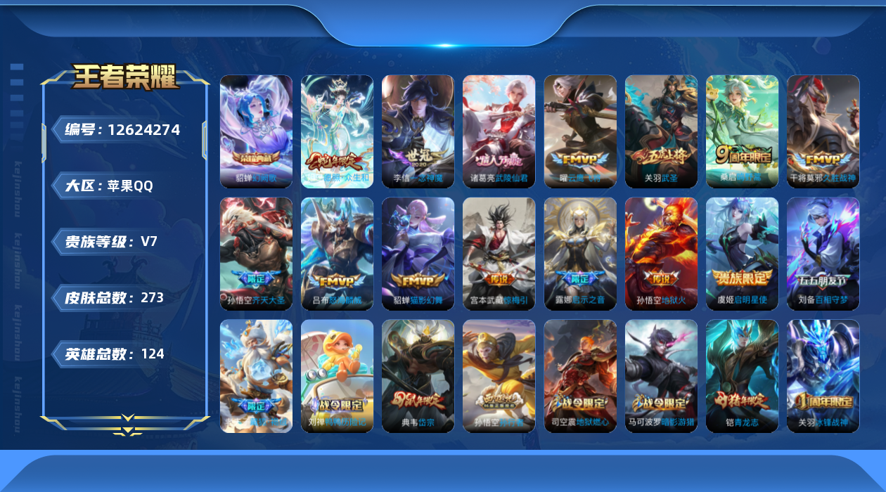[12624274]苹果Q-V7-永恒钻石IV段位-124英雄-273皮肤-1典藏-0珍品无双-0无双-0珍品传说-14传说-64史诗