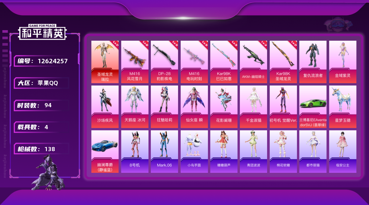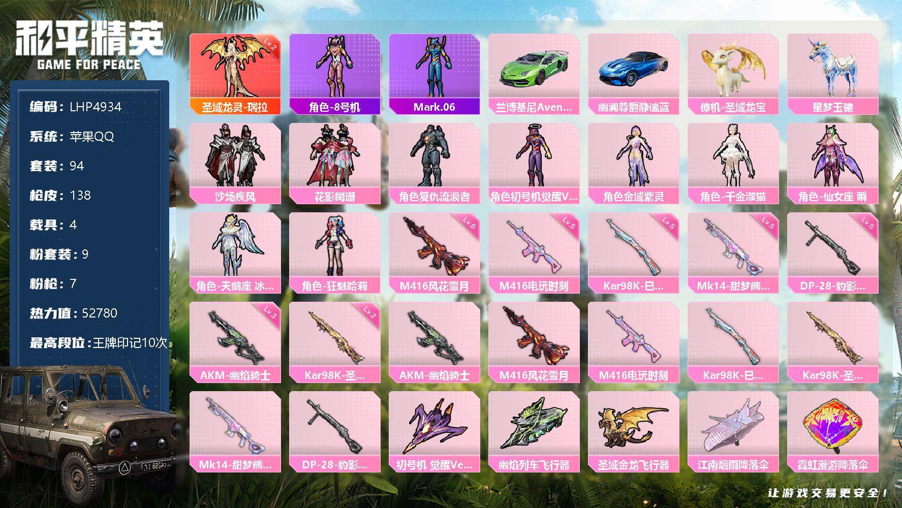 [12624257]素材身法号/【特价急出/详情看图】:苹果 手Q-1神装-9粉装-7特效枪-4载具-3粉色飞行器-5.2w热力值-10王牌印记-94套装-138枪皮【红色神装等级】:圣域龙灵-瑞拉(二级)【热门品类】:角色-8号机,角色-Mark.06【粉色载具】:兰博基尼Aventador SVJ(翡翠绿),幽澜尊爵(静谧蓝),僚机-圣域龙宝,星梦玉骢【粉色套装】:粉装-沙场疾风,粉装-花影阑珊,角色-复仇流浪者,角色-初号机 觉醒Ver.,角色-金域紫灵,角色-千金淑猫,角色-仙女座 瞬,角色-天鹅座 冰河,角色-狂魅哈莉【粉色枪皮等级】:AKM-幽焰骑士(三级),M416-风花雪月(六级),M416-电玩时刻(五级),Kar98K-巳巳如意(五级),Kar98K-圣域龙灵(二级),Mk14-甜梦熊击(五级),DP-28-豹影疾电(五级)【粉色枪皮】:AKM-幽焰骑士,M416-风花雪月,M416-电玩时刻,Kar98K-巳巳如意,Kar98K-圣域龙灵,Mk14-甜梦熊击,DP-28-豹影疾电【粉色飞行器】:初号机 觉醒Ver.飞行器,幽焰列车飞行器,圣域金龙飞行器