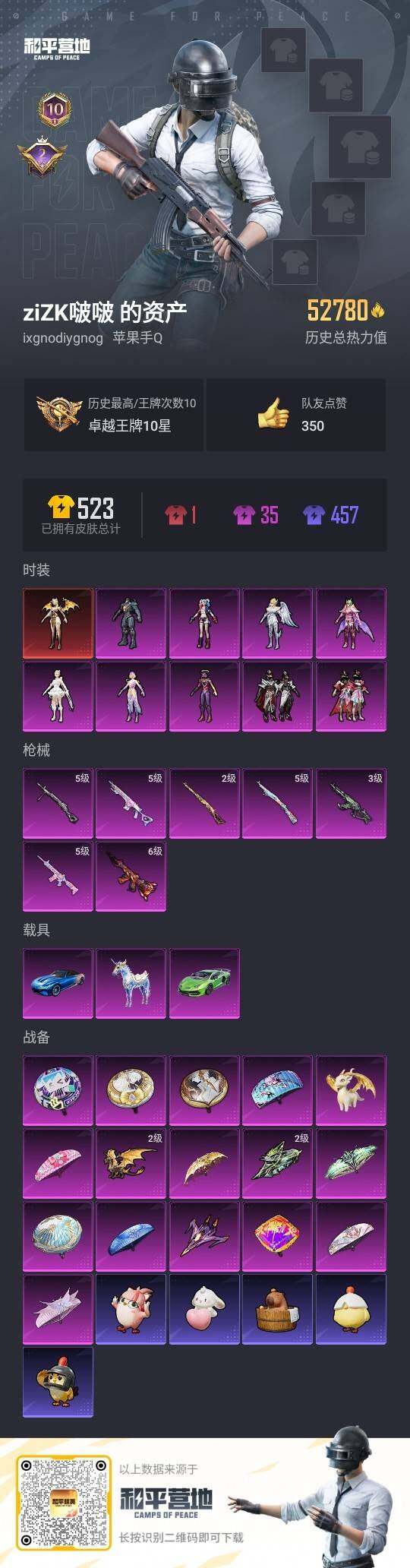 - PX_2097367- 苹果手Q-22王牌印记-有战神框-11粉装-5特效枪-1载具-74263热力值-171套装-210枪皮-8卓越印记-6传奇印记 【11粉装】,梦幻火箭,甜心巧克力,宝贝奶油派,天使彩虹糖,放客神游,千金淑猫,暗夜玫瑰,深海曼妙,炫光之旅,冰川幽秘,冰川红玫 【5特效枪】AKM-炫紫旋律-7级 SCAR-L-锦绣绵绵-5级 M416-五爪金龙-7级 AUG-暖羊咩咩-5级 K