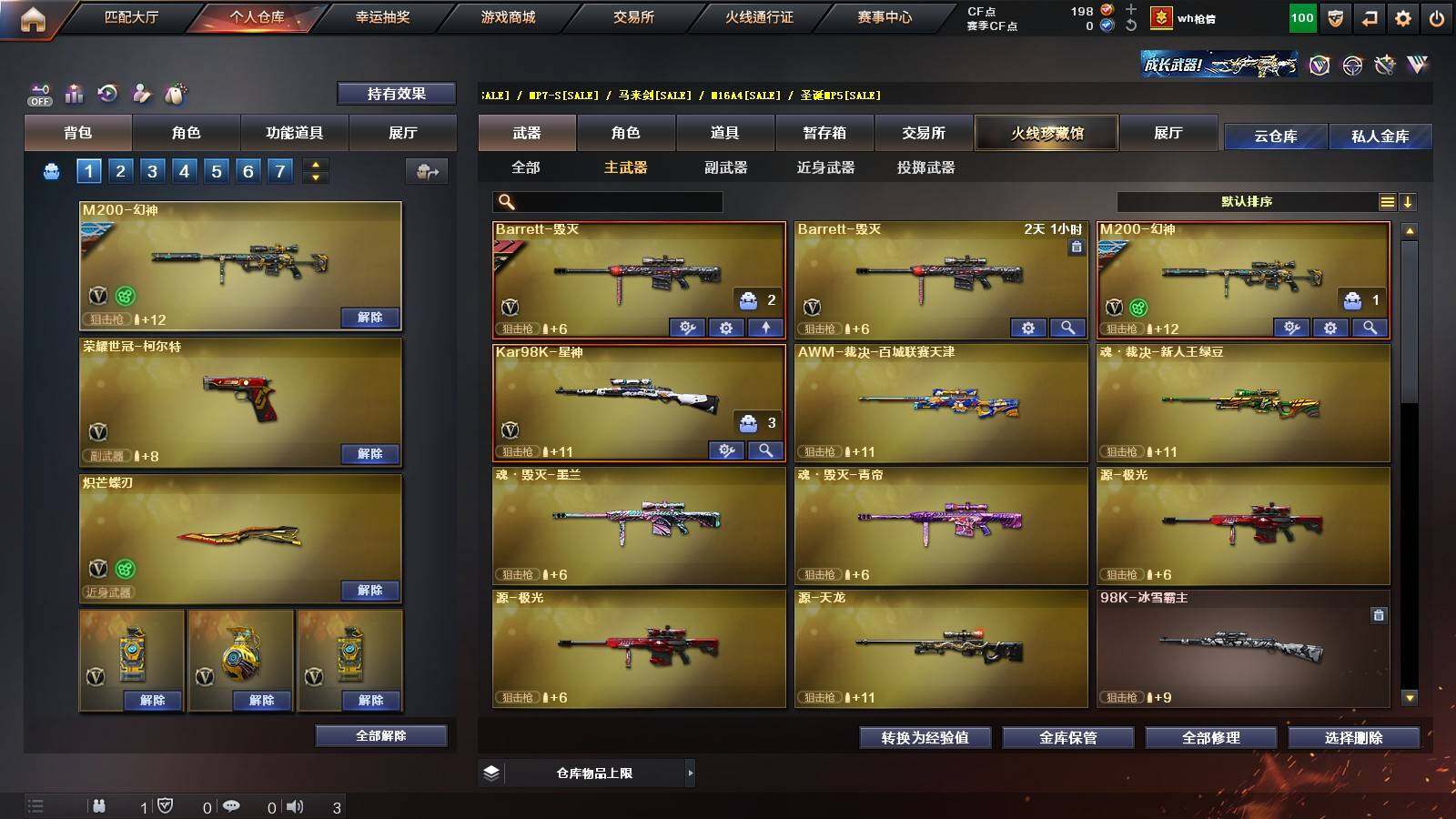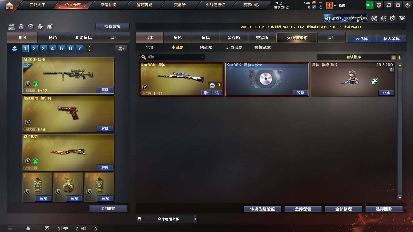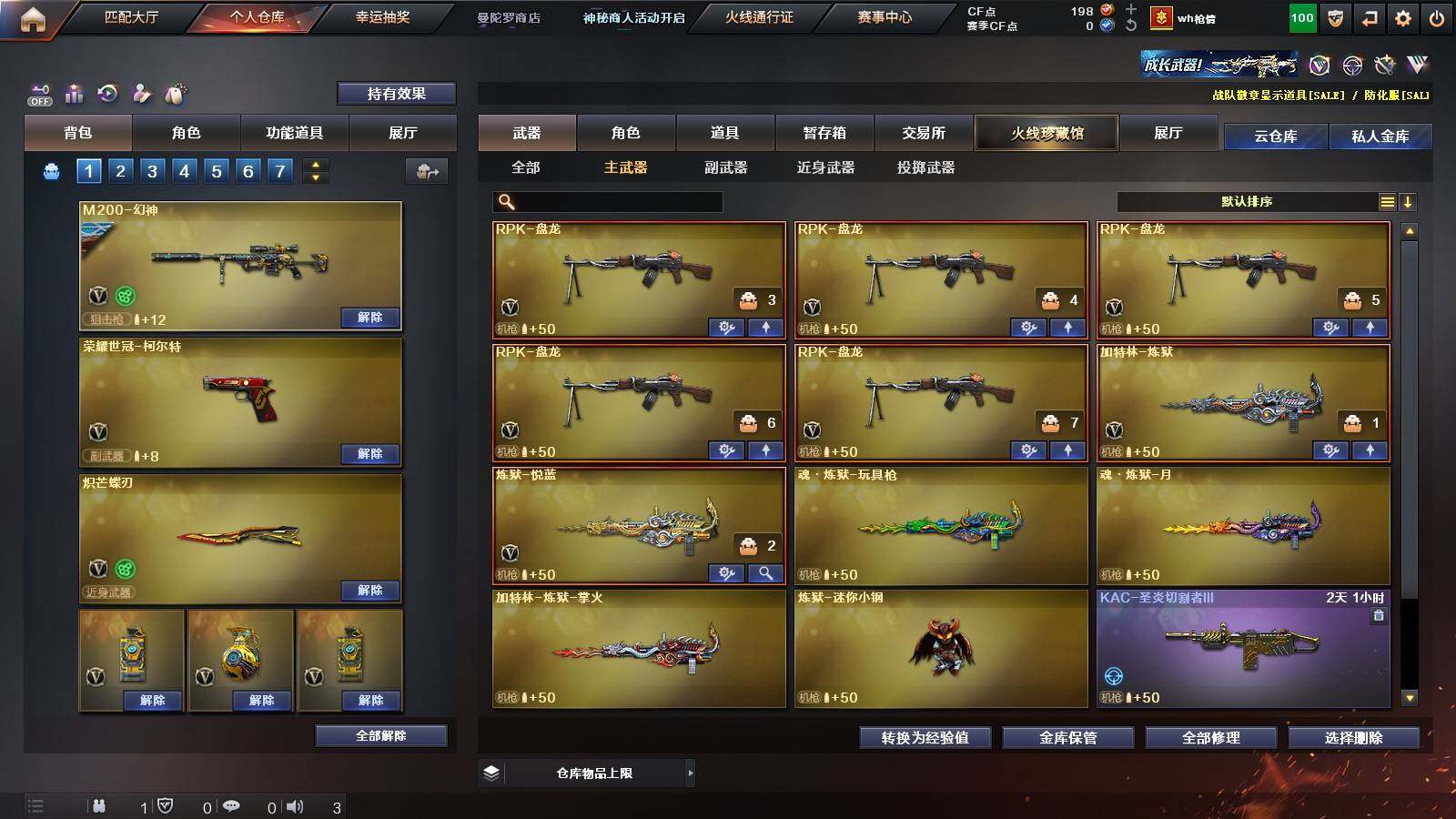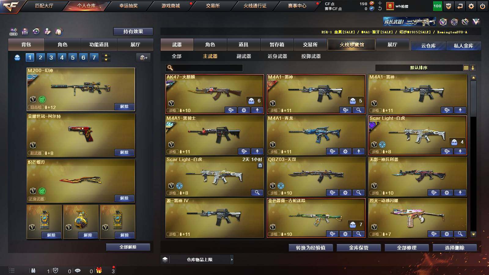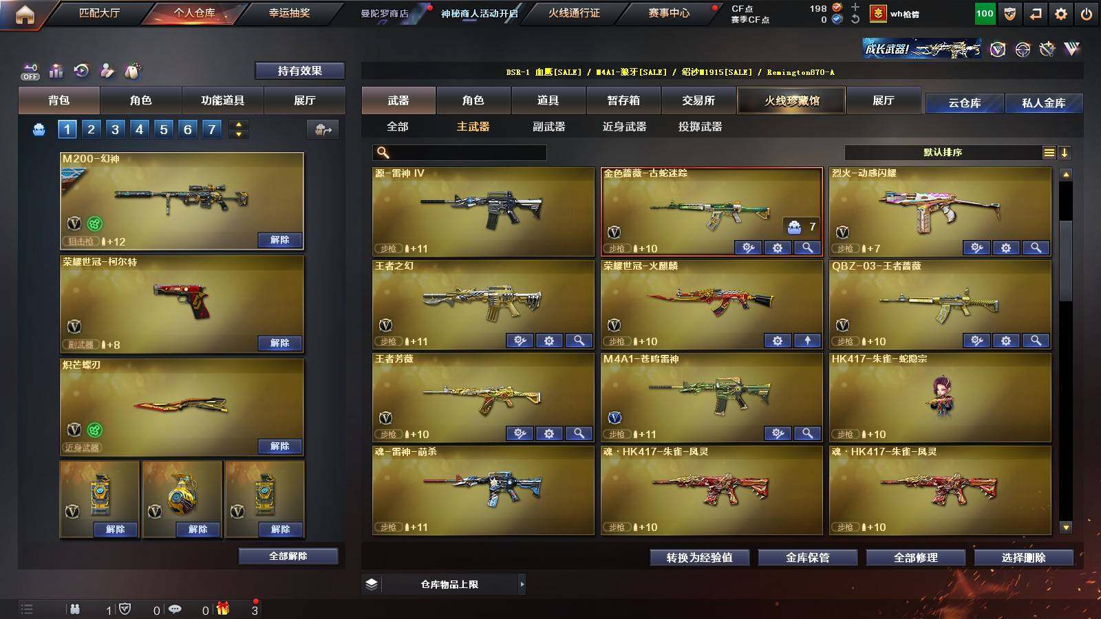 【热门武器】:Scar Light-白虎,M4A1-青龙,M200-幻神,金色蔷薇-古蛇迷踪,修罗-古蛇迷踪,荣耀世冠-火麒麟,荣耀世冠-柯尔特,Kar98K-星神,炼狱-迷你小钢,M4A1-黑骑士,RPK-盘龙*5,加特林-炼狱,沙鹰-修罗*2,炽芒蝶刃,荣耀世冠-龙啸