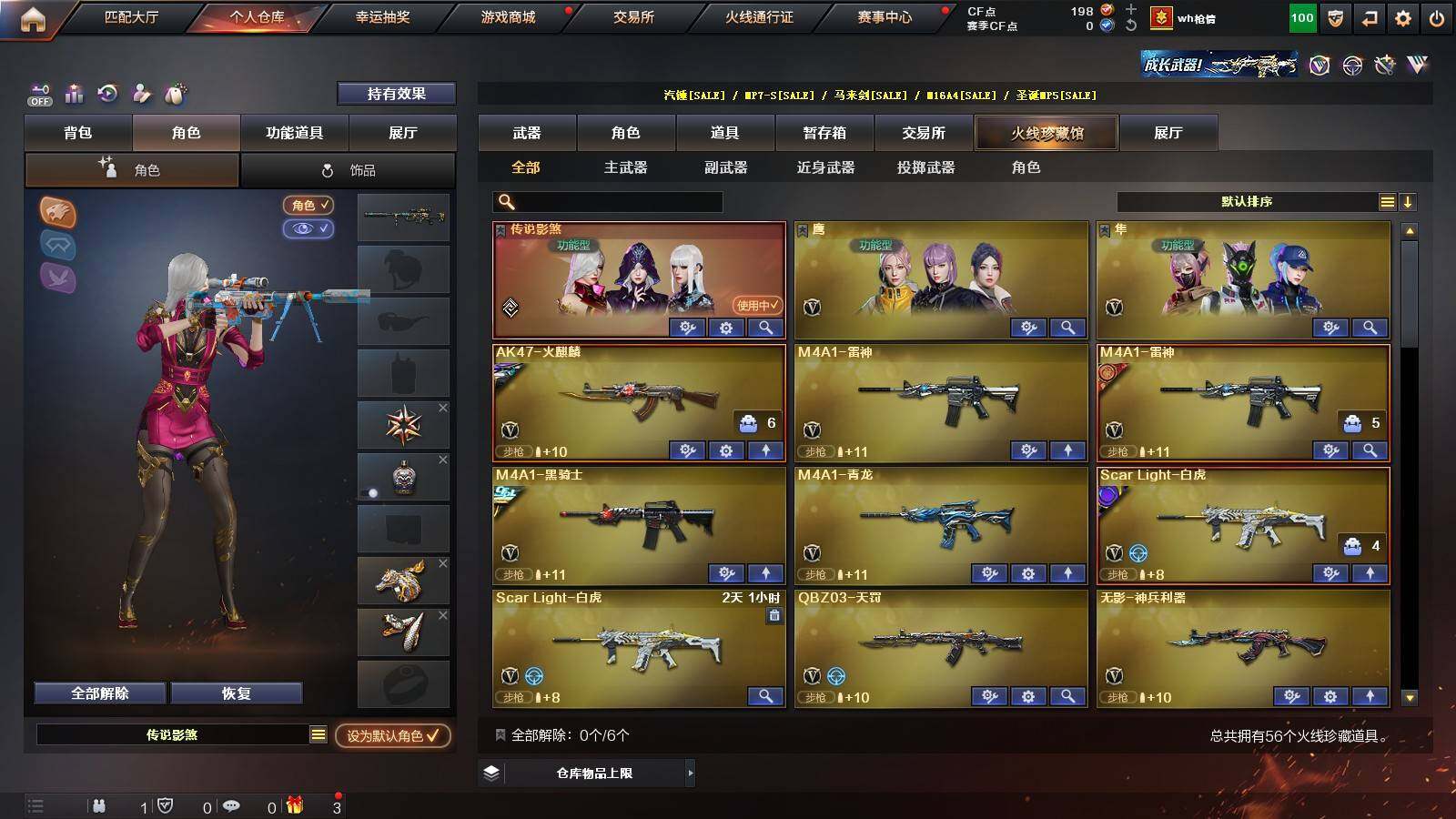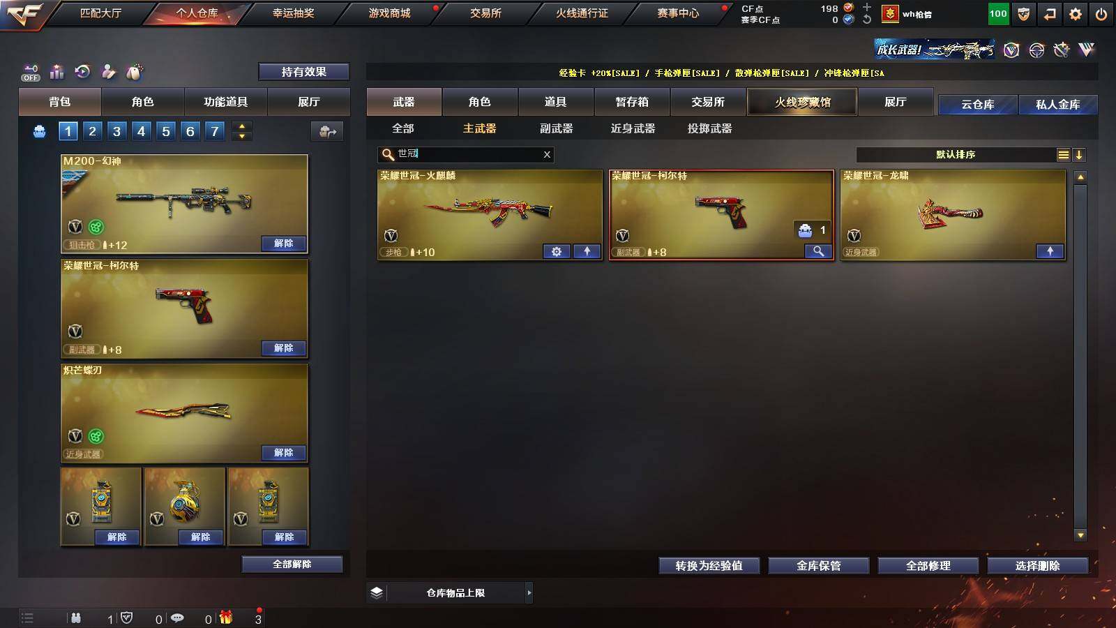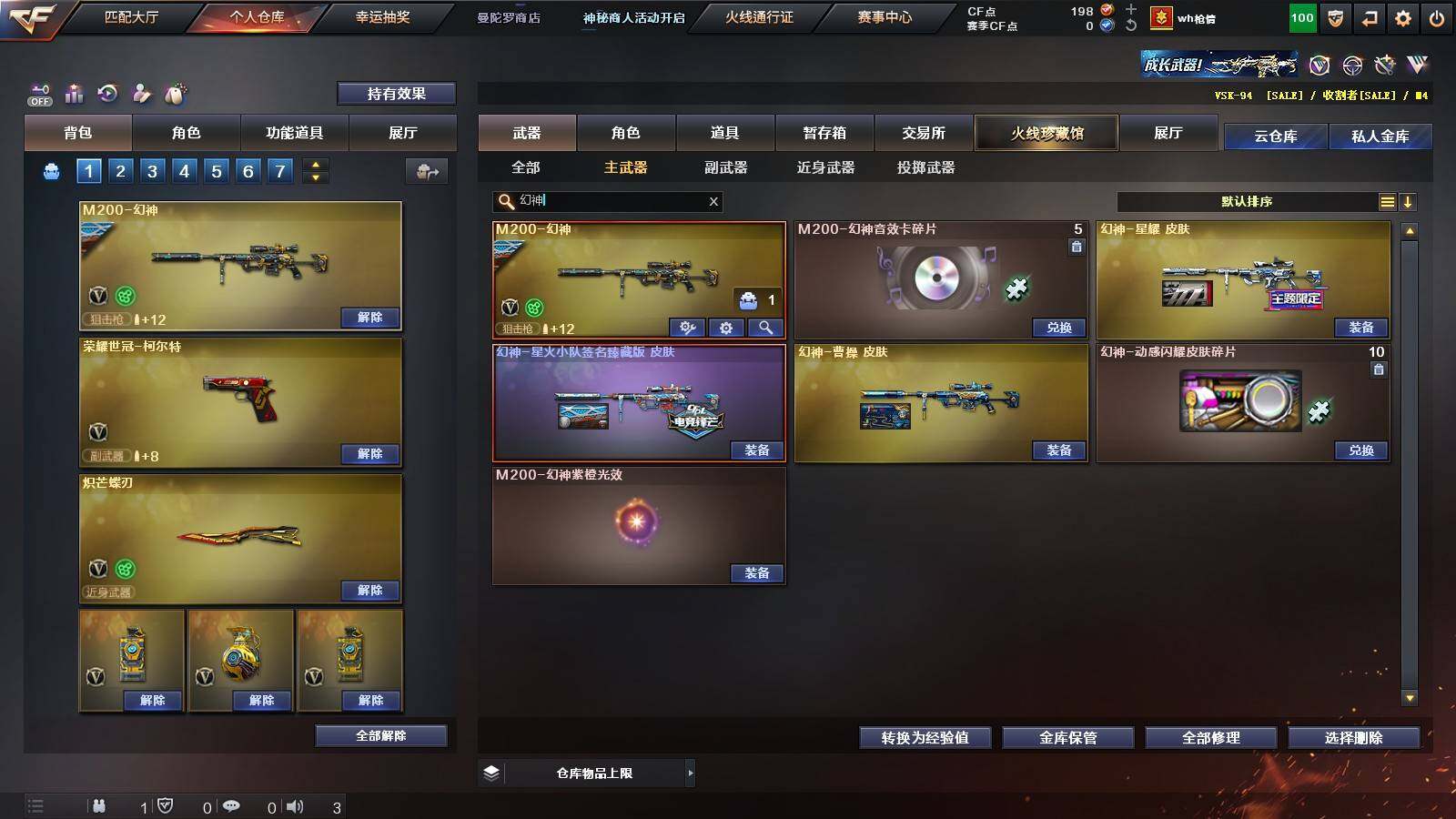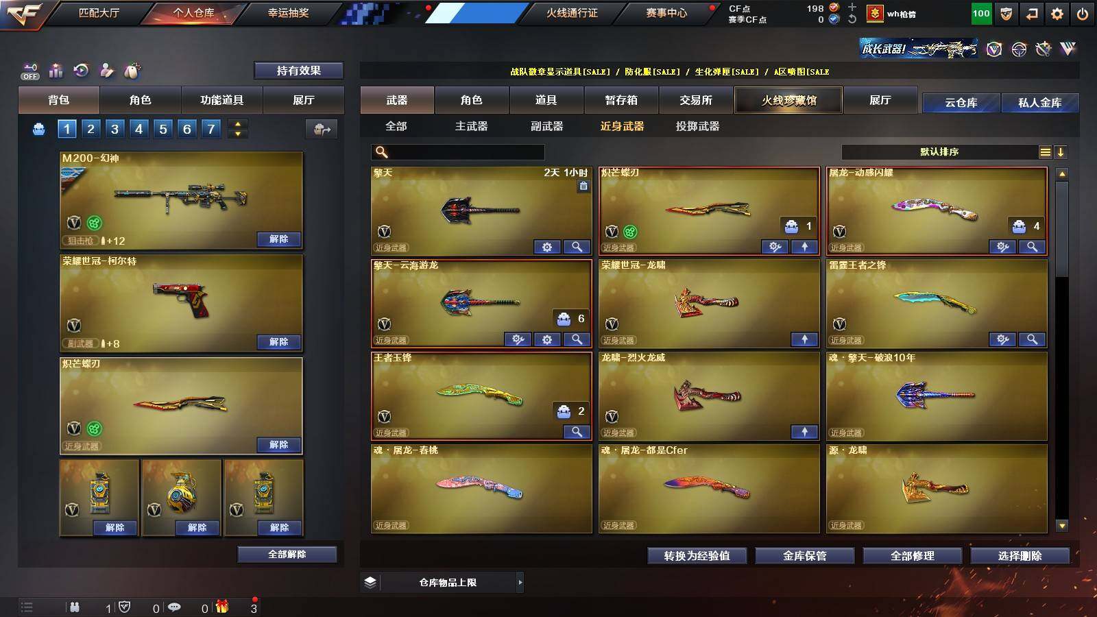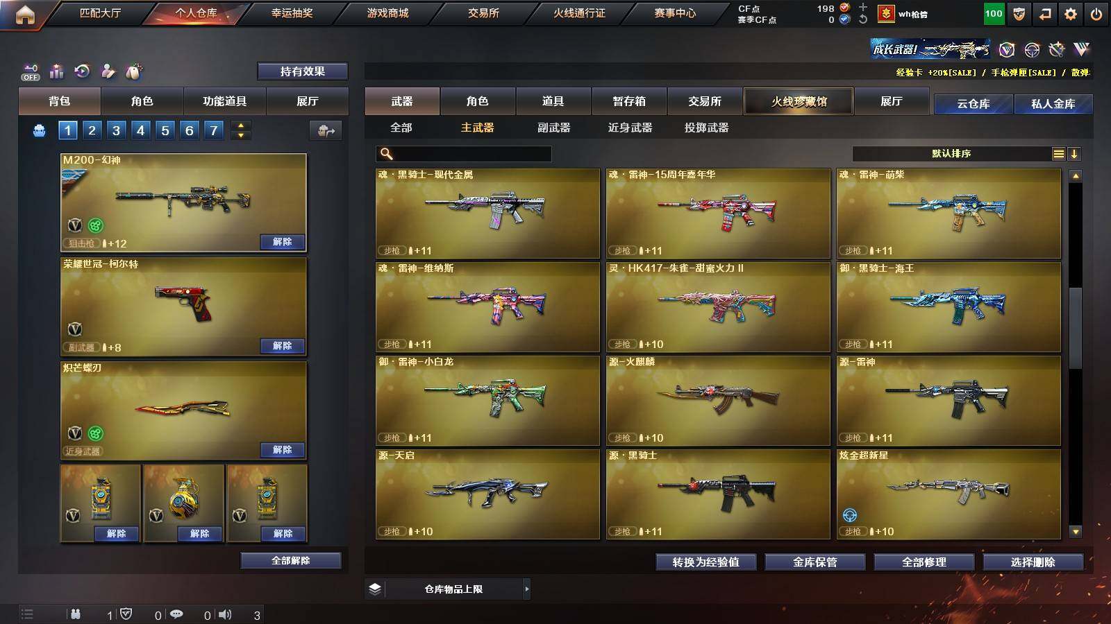 【热门武器】:Scar Light-白虎,M4A1-青龙,M200-幻神,金色蔷薇-古蛇迷踪,修罗-古蛇迷踪,荣耀世冠-火麒麟,荣耀世冠-柯尔特,Kar98K-星神,炼狱-迷你小钢,M4A1-黑骑士,RPK-盘龙*5,加特林-炼狱,沙鹰-修罗*2,炽芒蝶刃,荣耀世冠-龙啸
