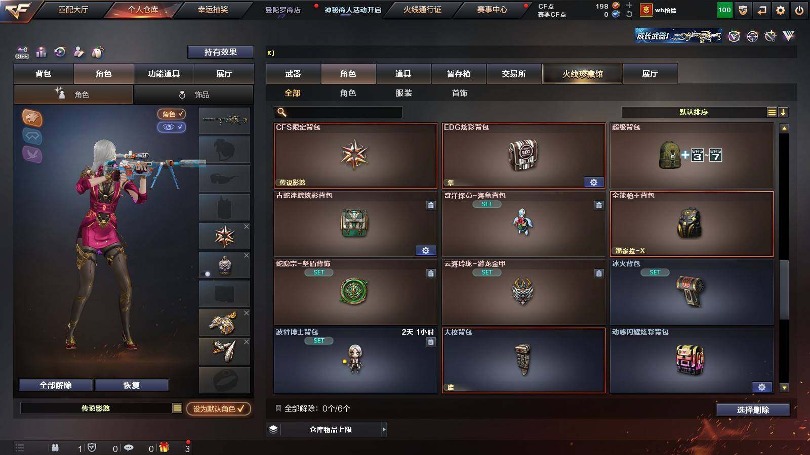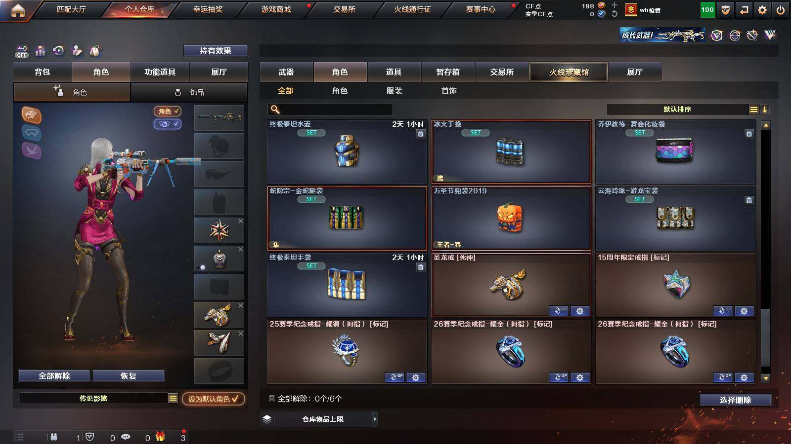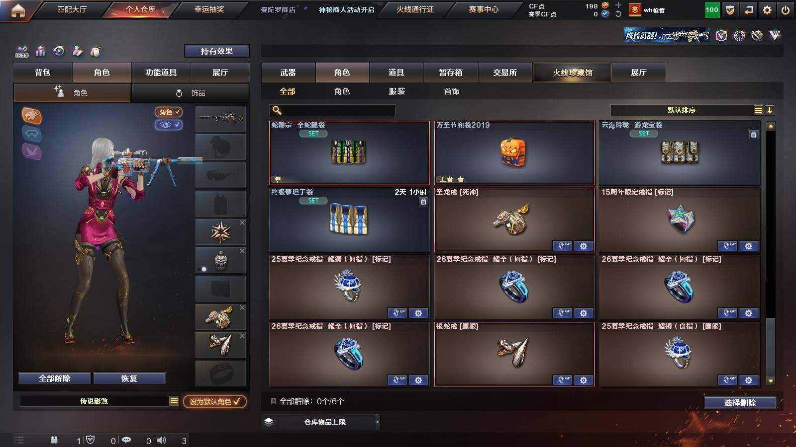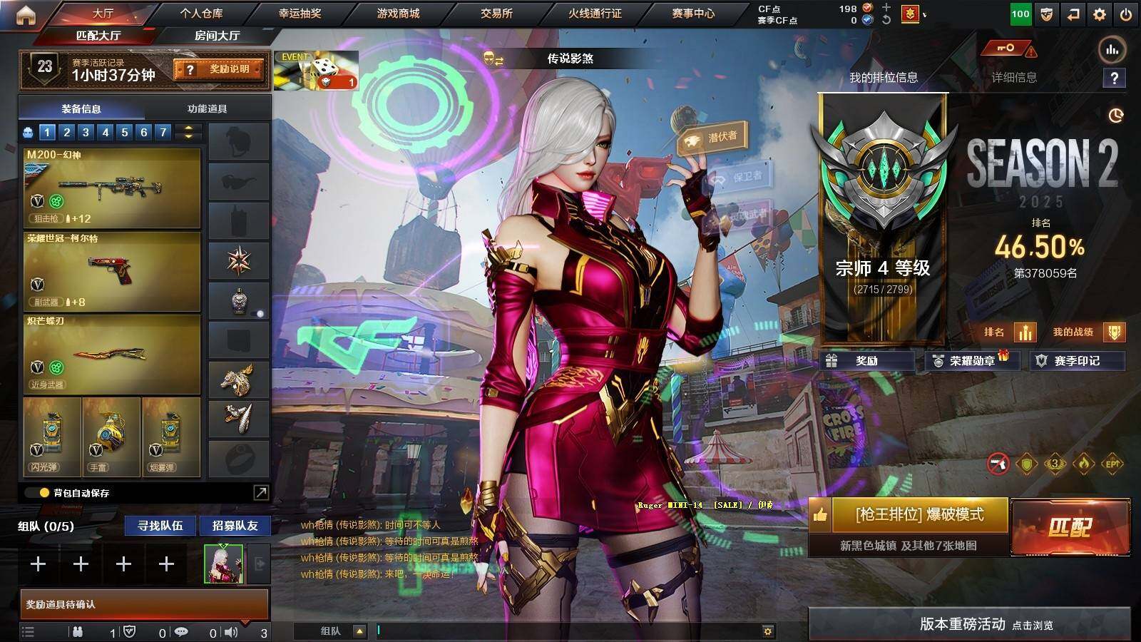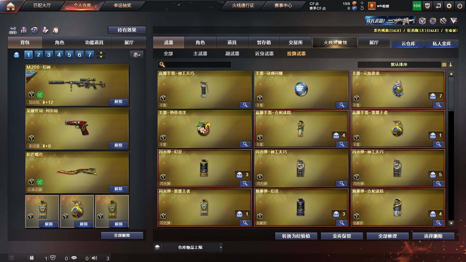 【热门武器】:Scar Light-白虎,M4A1-青龙,M200-幻神,金色蔷薇-古蛇迷踪,修罗-古蛇迷踪,荣耀世冠-火麒麟,荣耀世冠-柯尔特,Kar98K-星神,炼狱-迷你小钢,M4A1-黑骑士,RPK-盘龙*5,加特林-炼狱,沙鹰-修罗*2,炽芒蝶刃,荣耀世冠-龙啸