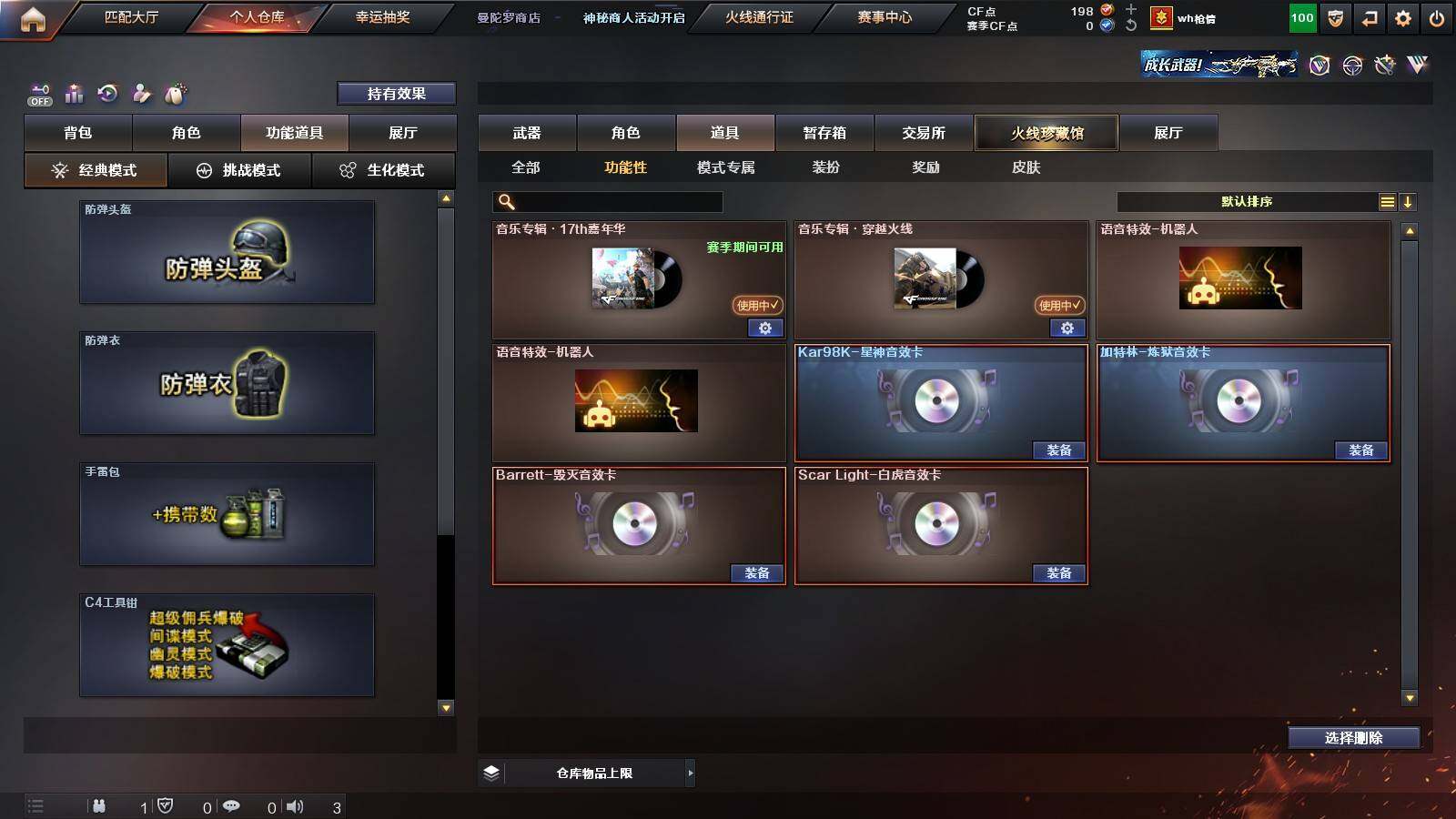 【音效卡】:Barrett-毁灭音效卡,Scar Light-白虎音效卡,Kar98K-星神音效卡,加特林-炼狱音效卡