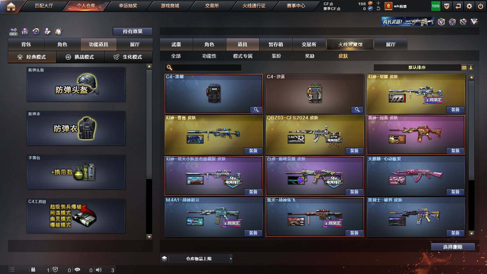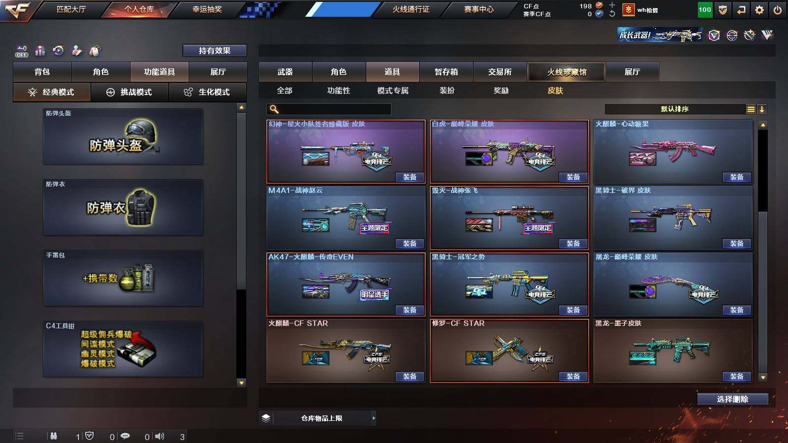 【稀有皮肤】:幻神-星耀 皮肤,幻神-星火小队签名臻藏版 皮肤,幻神-曹操 皮肤,白虎-巅峰荣耀 皮肤,QBZ03-CFS2024 皮肤,M4A1-战神赵云,AK47-火麒麟-传奇EVEN,火麒麟-心动糖果,黑骑士-冠军之势,黑龙-墨子皮肤,毁灭-战神张飞