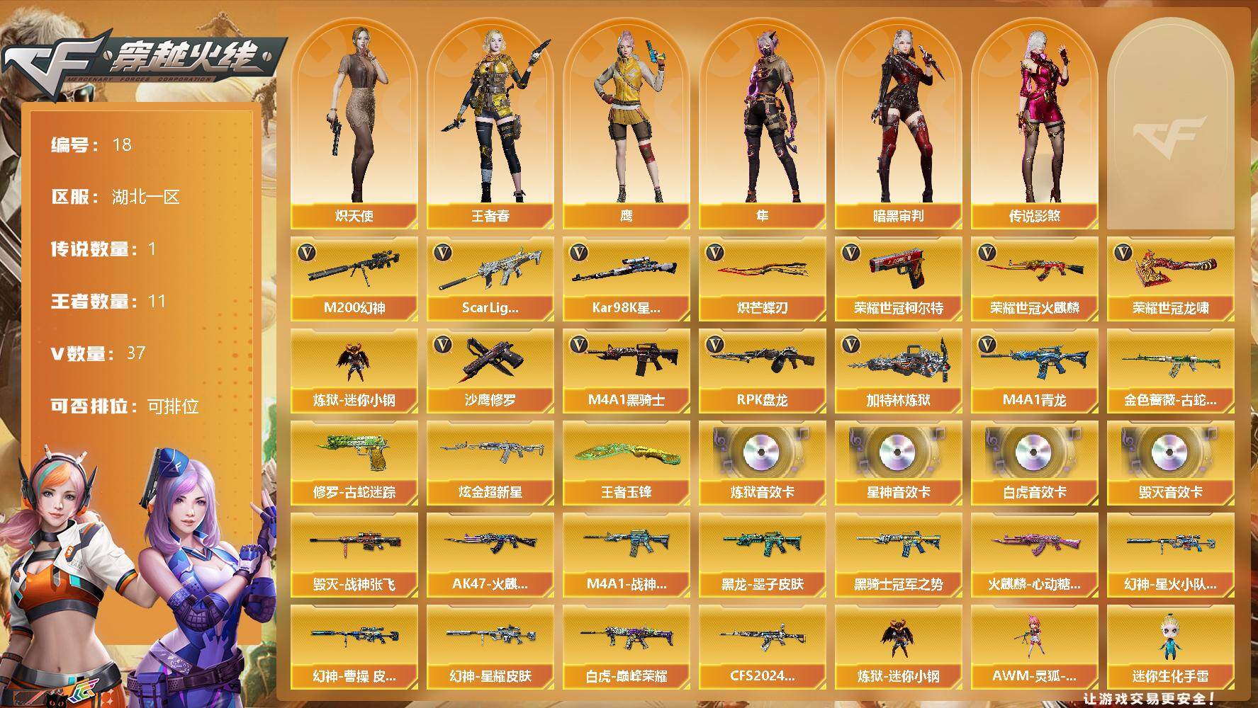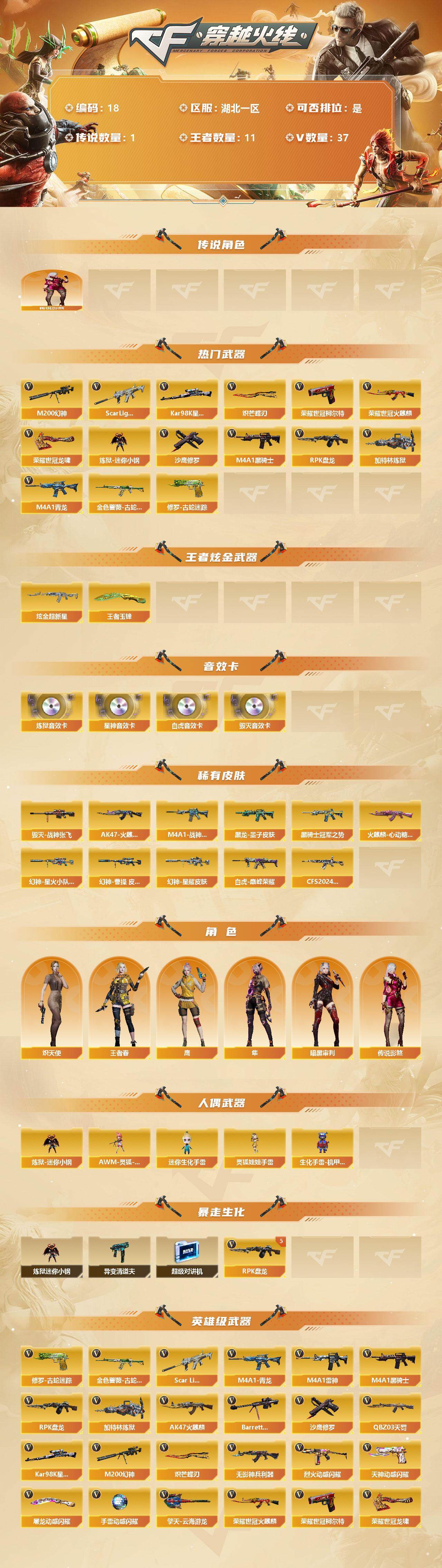 [12624413]湖北一区-37V-11王者-1炫金 【传说角色】:传说影煞 【热门武器】:Scar Light-白虎,M4A1-青龙,M200-幻神,金色蔷薇-古蛇迷踪,修罗-古蛇迷踪,荣耀世冠-火麒麟,荣耀世冠-柯尔特,Kar98K-星神,炼狱-迷你小钢,M4A1-黑骑士,RPK-盘龙*5,加特林-炼狱,沙鹰-修罗*2,炽芒蝶刃,荣耀世冠-龙啸 【王者炫金武器】:炫金超新星,王者玉锋 【音效卡】:Barrett-毁灭音效卡,Scar Light-白虎音效卡,Kar98K-星神音效卡,加特林-炼狱音效卡 【稀有皮肤】:幻神-星耀 皮肤,幻神-星火小队签名臻藏版 皮肤,幻神-曹操 皮肤,白虎-巅峰荣耀 皮肤,QBZ03-CFS2024 皮肤,M4A1-战神赵云,AK47-火麒麟-传奇EVEN,火麒麟-心动糖果,黑骑士-冠军之势,黑龙-墨子皮肤,毁灭-战神张飞 【角色】:传说影煞,王者春,鹰,隼,炽天使,暗黑审判 【人偶武器】:AWM-灵狐-15周年嘉年华,炼狱-迷你小钢,迷你生化手雷*2,灵狐娃娃手雷,生化手雷-机甲核心 【暴走生化】:炼狱-迷你小钢,异变清道夫,超级对讲机 【英雄级武器】:荣耀世冠-火麒麟,荣耀世冠-柯尔特,荣耀世冠-龙啸,烈火-动感闪耀,天神-动感闪耀,屠龙-动感闪耀,手雷-动感闪耀,Scar Light-白虎,M4A1-青龙,金色蔷薇-古蛇迷踪,无影-神兵利器,M4A1-雷神*2,M4A1-黑骑士,RPK-盘龙*5,加特林-炼狱,AK47-火麒麟,Barrett-毁灭,QBZ03-天罚,Kar98K-星神,M200-幻神,修罗-古蛇迷踪,沙鹰-修罗*2,炽芒蝶刃,擎天-云海游龙 【特殊枪械】:1白虎,1黑骑士,5盘龙,1炼狱