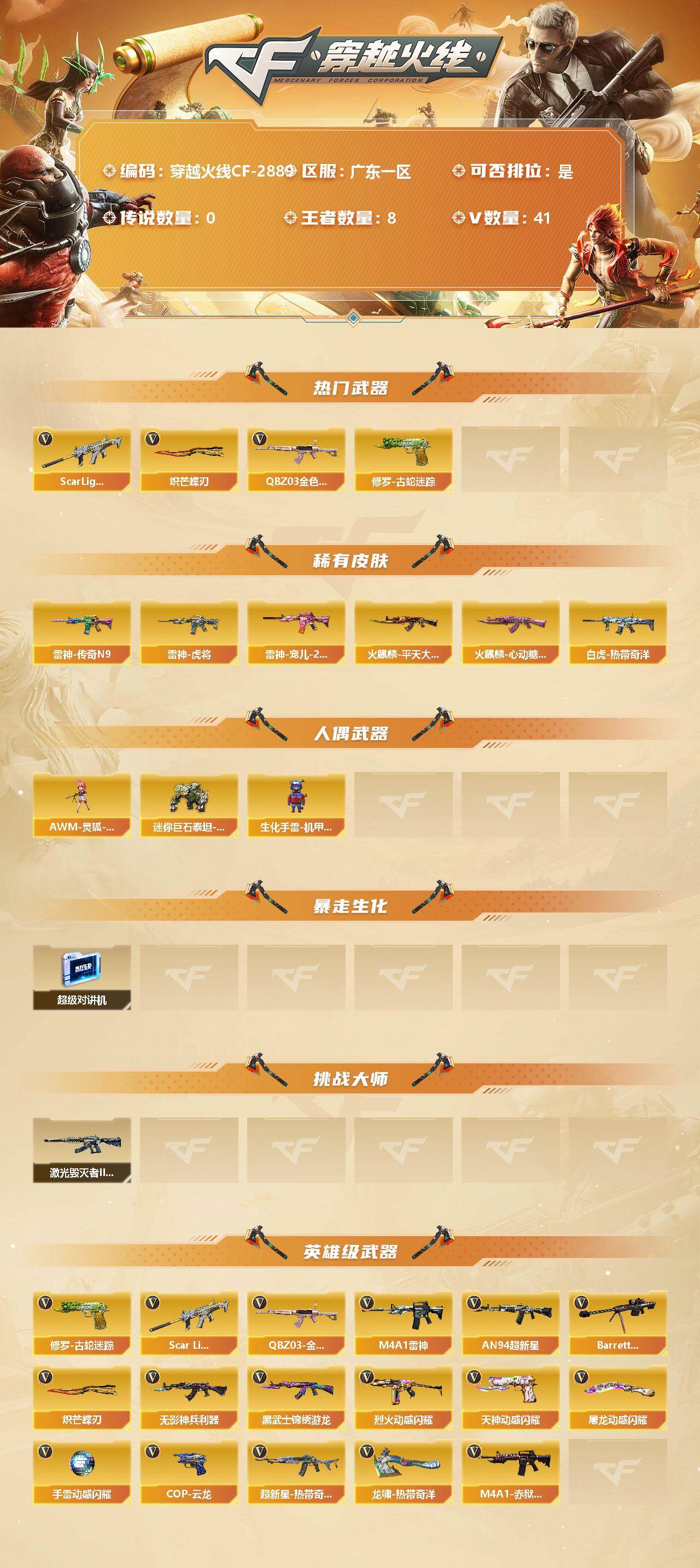 [12624965]广东一区-41V-8王者-0炫金 【热门武器】:QBZ03-金色蔷薇,Scar Light-白虎,修罗-古蛇迷踪,炽芒蝶刃 【稀有皮肤】:白虎-热带奇洋 皮肤,雷神-虎将,雷神-传奇N9,雷神-宠儿-2019MVP,火麒麟-平天大圣,火麒麟-心动糖果 【人偶武器】:AWM-灵狐-15周年嘉年华*2,迷你巨石泰坦-魔花研究所,生化手雷-机甲核心 【暴走生化】:超级对讲机 【挑战大师】:激光毁灭者III-白马银枪 【英雄级武器】:COP 357-云龙,烈火-动感闪耀,天神-动感闪耀,屠龙-动感闪耀,手雷-动感闪耀,QBZ03-金色蔷薇,Scar Light-白虎,无影-神兵利器,M4A1-雷神,AN94-超新星,Barrett-毁灭,黑武士-锦绣游龙,超新星-热带奇洋,M4A1-赤狱骑士,修罗-古蛇迷踪,炽芒蝶刃,龙啸-热带奇洋 【特殊枪械】:1白虎
