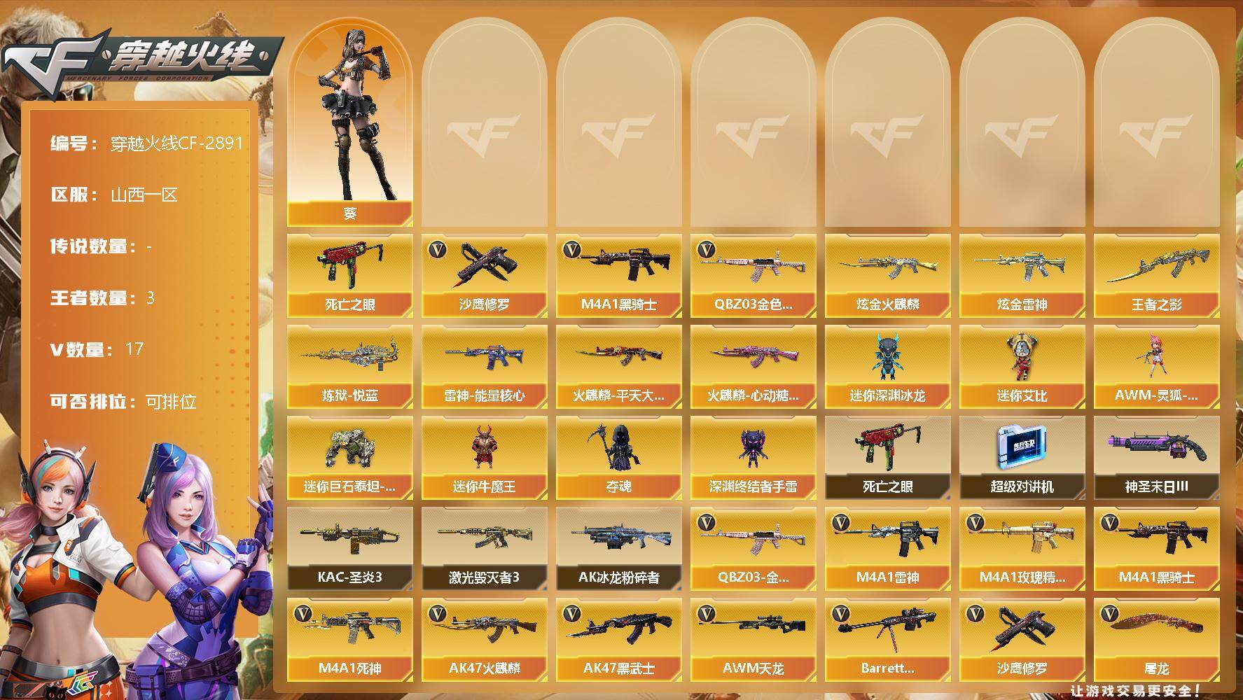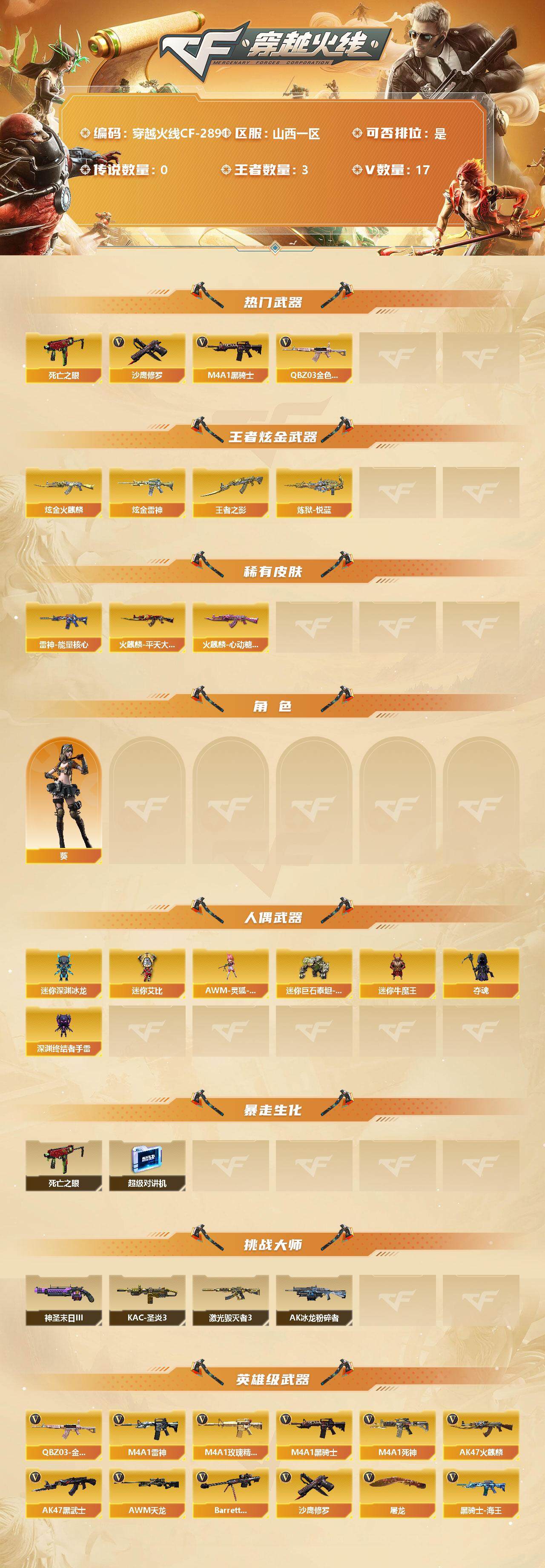 [12625122]山西一区-17V-3王者-2炫金 【热门武器】:QBZ03-金色蔷薇,死亡之眼,M4A1-黑骑士*3,沙鹰-修罗 【王者炫金武器】:炫金火麒麟,炫金雷神,炼狱-悦蓝*2,王者之影 【稀有皮肤】:雷神-能量核心,火麒麟-平天大圣,火麒麟-心动糖果 【角色】:葵 【人偶武器】:AWM-灵狐-15周年嘉年华,迷你深渊冰龙,迷你艾比,迷你巨石泰坦-魔花研究所,迷你牛魔王,夺魂,深渊终结者手雷 【暴走生化】:死亡之眼,超级对讲机 【挑战大师】:神圣爆裂者-末日III,KAC-圣炎切割者III,激光毁灭者III*3,AK47-冰龙粉碎者*2 【英雄级武器】:QBZ03-金色蔷薇,M4A1-雷神,M4A1-玫瑰精灵,M4A1-黑骑士*3,M4A1-死神,AK47-火麒麟*2,AK47-黑武士,AWM-天龙,Barrett-毁灭,黑骑士-海王,沙鹰-修罗,屠龙 【特殊枪械】:3黑骑士