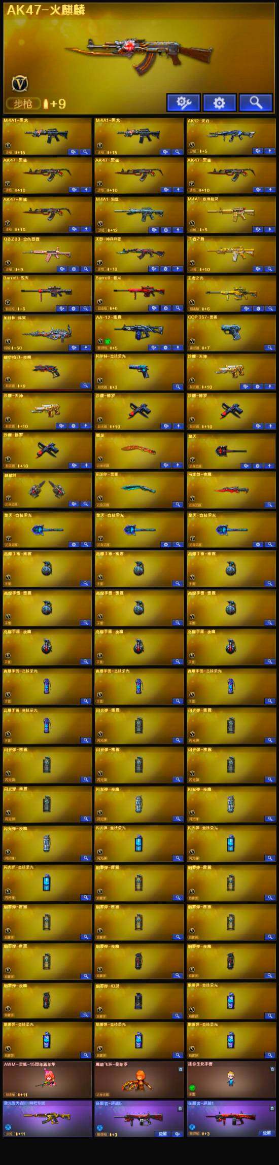 【英雄级武器】:柯尔特-竞技荣光,擎天-竞技荣光*3,高爆手雷-竞技荣光*4,烟雾弹-竞技荣光*4,闪光弹-竞技荣光*3,破空枪刃-夜魔,马来剑-夜魔,M4A1-雷霆,QBZ03-金色蔷薇,无影-神兵利器,M4A1-黑龙*2,M4A1-玫瑰精灵,加特林-炼狱,AK47-火麒麟,AK12-天启,Barrett-毁灭,Barrett-极光,AA-12-雷霆,AK47-黑鲨*4,M4A1-赤狱骑士,沙鹰-天神*2,沙鹰-修罗*3,麒麟刺,擎天,屠龙