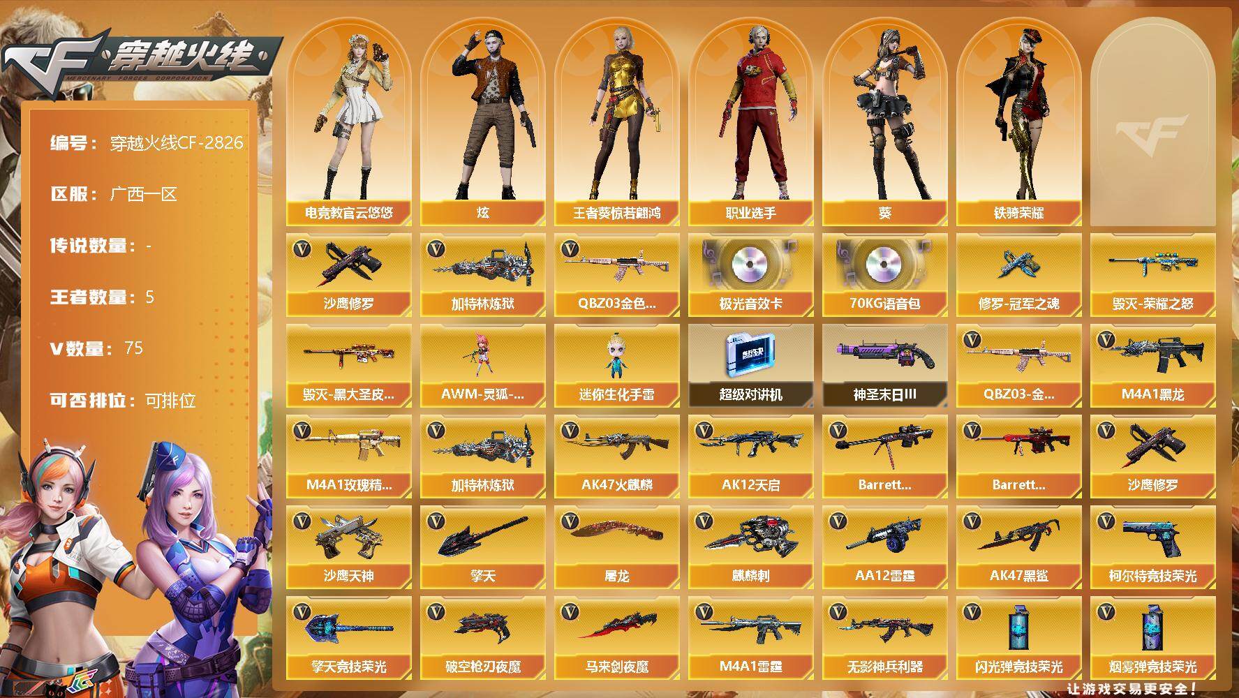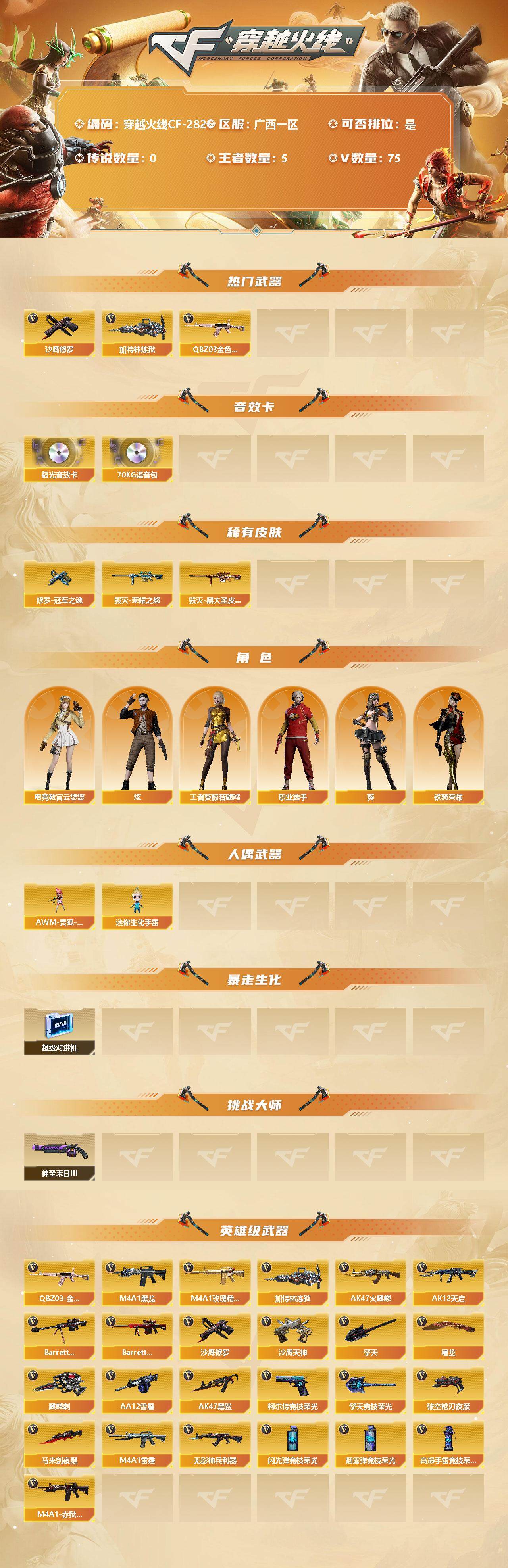 [12625775]广西一区-75V-5王者-0炫金 【热门武器】:QBZ03-金色蔷薇,加特林-炼狱,沙鹰-修罗*3 【音效卡】:Barrett-极光音效卡,70KG语音包 【稀有皮肤】:毁灭-荣耀之怒,毁灭-黑大圣皮肤,修罗-冠军之魂 【角色】:王者葵-惊若翩鸿,葵,炫,电竞教官-云悠悠,铁骑荣耀,职业选手 【人偶武器】:AWM-灵狐-15周年嘉年华,迷你生化手雷 【暴走生化】:超级对讲机 【挑战大师】:神圣爆裂者-末日III 【英雄级武器】:柯尔特-竞技荣光,擎天-竞技荣光*3,高爆手雷-竞技荣光*4,烟雾弹-竞技荣光*4,闪光弹-竞技荣光*3,破空枪刃-夜魔,马来剑-夜魔,M4A1-雷霆,QBZ03-金色蔷薇,无影-神兵利器,M4A1-黑龙*2,M4A1-玫瑰精灵,加特林-炼狱,AK47-火麒麟,AK12-天启,Barrett-毁灭,Barrett-极光,AA-12-雷霆,AK47-黑鲨*4,M4A1-赤狱骑士,沙鹰-天神*2,沙鹰-修罗*3,麒麟刺,擎天,屠龙 【特殊枪械】:1炼狱