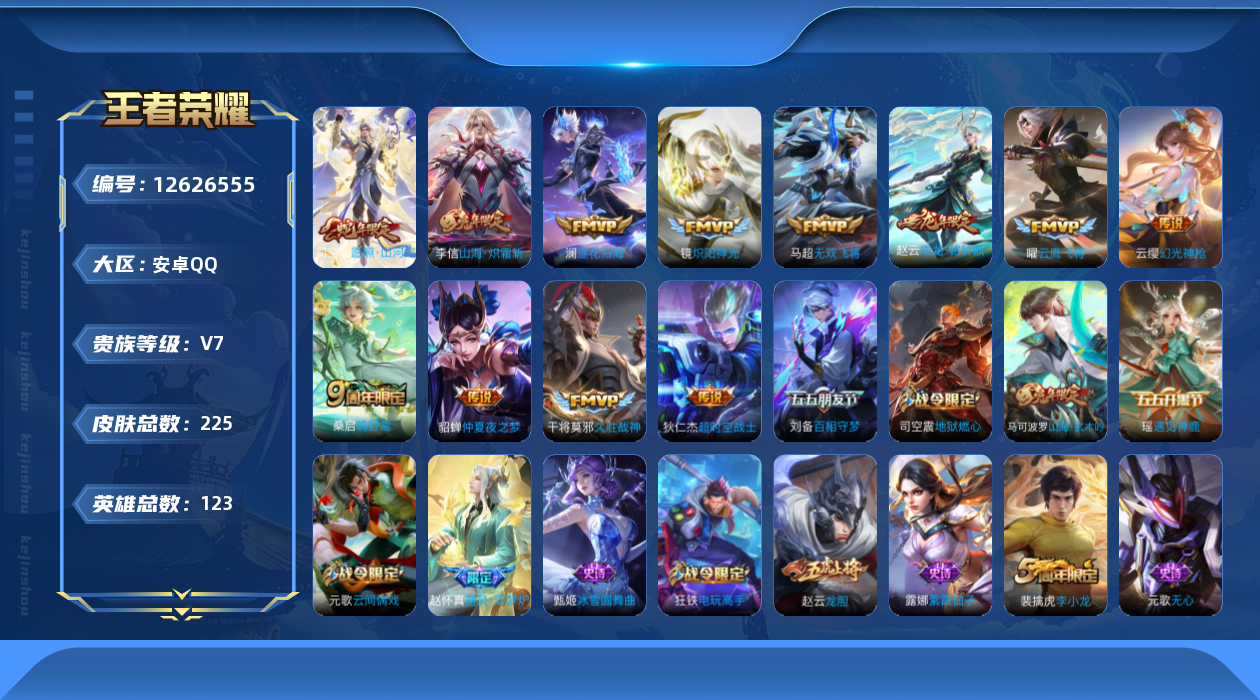 [12626555]安卓Q-V3-永恒钻石II段位-123英雄-225皮肤-0典藏-0珍品无双-0无双-0珍品传说-12传说-52史诗