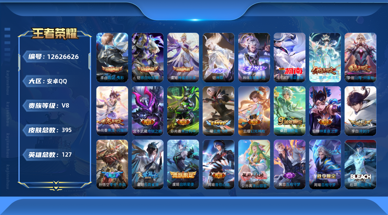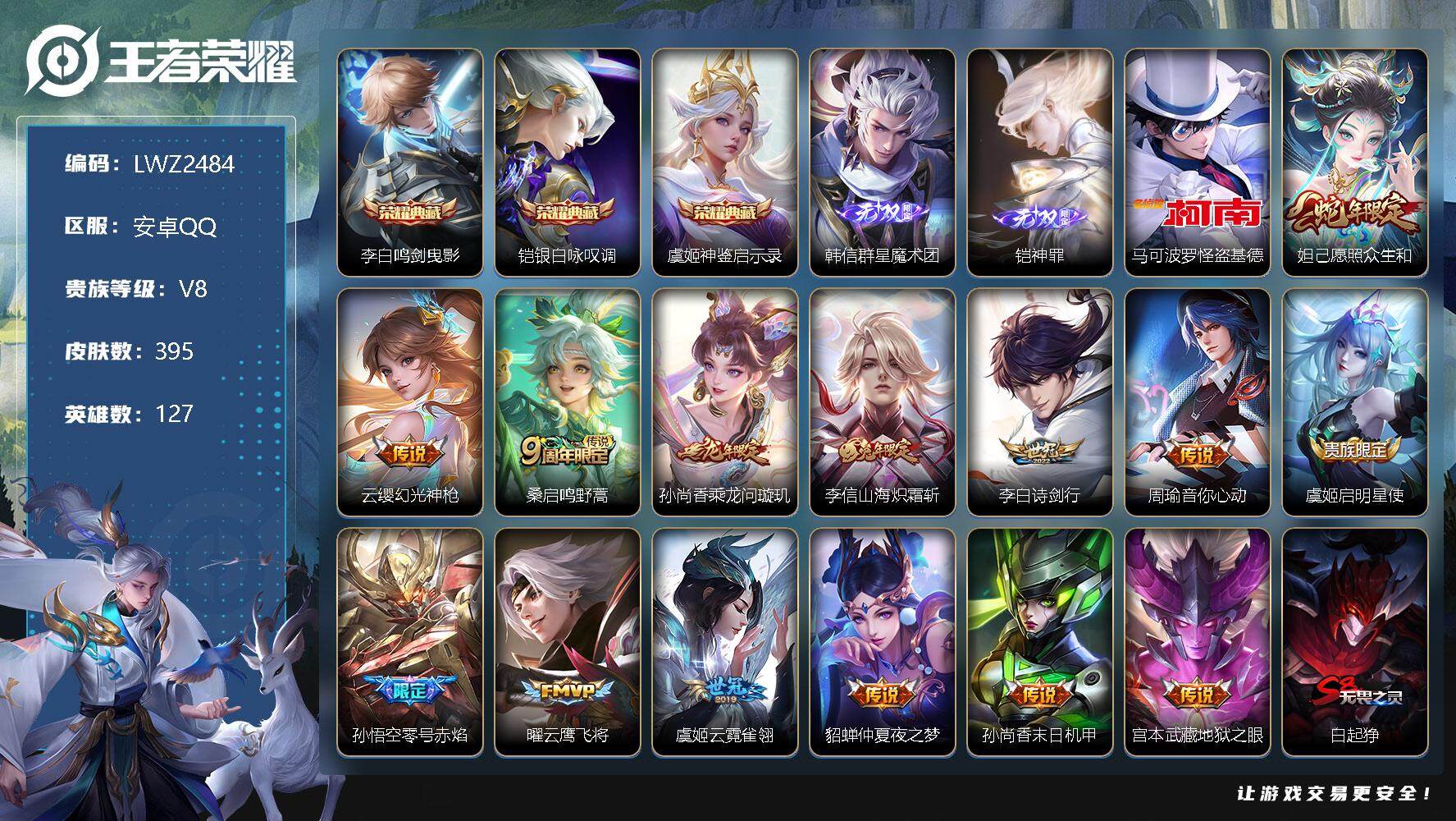 [12626626]安卓Q-V8-至尊星耀V段位-127英雄-395皮肤-3典藏-2无双-1珍品传说-14传说-118史诗