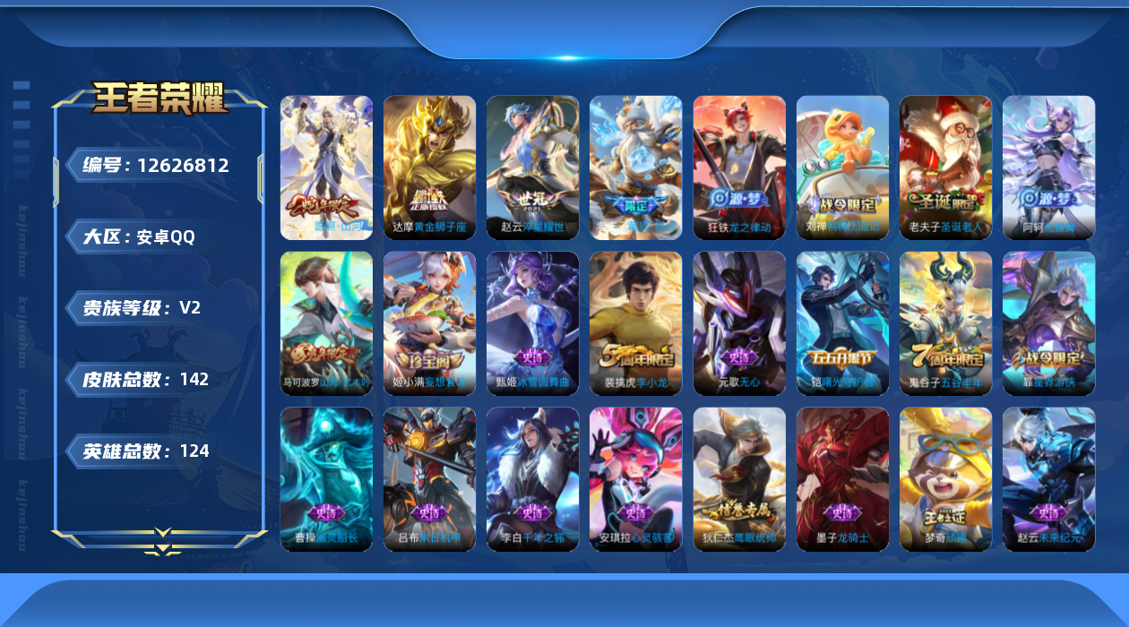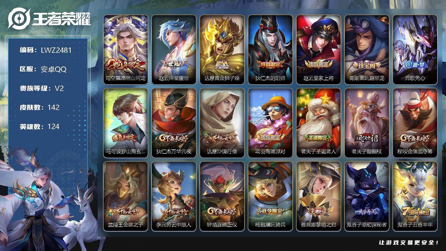 [12626812]对抗路31段/安卓Q-V2-至尊星耀II段位-124英雄-142皮肤-3传说-34史诗 【英雄全皮】:蒙恬全皮 【传说皮肤】:司空震愿照山河定,赵云淬星耀世,达摩黄金狮子座 【限定皮肤】:狄仁杰阴阳师,赵云皇家上将,高渐离玩趣恶龙,元歌无心,马可波罗山海玄木吟,狄仁杰万华元夜,达摩沙漠行僧,项羽海滩派对,老夫子圣诞老人,老夫子醍醐杖,程咬金演武夺筹,兰陵王金庭之子,李元芳云中旅人,钟馗驱傩正仪,杨戬潮玩骑兵,雅典娜黎明之约,鬼谷子原初探秘者,鬼谷子五谷丰年,苏烈千军破阵,弈星混沌棋,梦奇顽趣,沈梦溪大漠名商,明世隐疑决卦,裴擒虎李小龙,裴擒虎擒涛扼浪,嫦娥暖冬兔眠,鲁班大师探海日志,桑启海盐诗旅,暃星界游侠,张良古海寻踪,蒙恬荣光圣徽,鬼谷子天穹祈灯,姬小满妄想食味 【年限皮肤】:马可波罗山海玄木吟 【赛季限定】:狄仁杰万华元夜,达摩沙漠行僧,老夫子醍醐杖,程咬金演武夺筹,兰陵王金庭之子,张良古海寻踪,李元芳云中旅人,钟馗驱傩正仪,雅典娜黎明之约,鬼谷子原初探秘者,苏烈千军破阵,弈星混沌棋,梦奇顽趣,沈梦溪大漠名商,明世隐疑决卦,裴擒虎擒涛扼浪,鲁班大师探海日志,桑启海盐诗旅,鬼谷子天穹祈灯,蒙恬荣光圣徽 【战令限定】:杨戬潮玩骑兵,嫦娥暖冬兔眠,暃星界游侠 【史诗皮肤】:赵云皇家上将,赵云未来纪元,老夫子圣诞老人,甄姬冰雪圆舞曲,王昭君偶像歌手,廉颇地狱岩魂,宫本武藏鬼剑武藏,妲己魅力维加斯,墨子龙骑士,墨子金属风暴,曹操幽灵船长,李白千年之狐,吕布末日机甲,安琪拉心灵骇客,铠曙光守护者,李元芳逐浪之夏,程咬金功夫厨神,伽罗箭羽风息,狄仁杰鹰眼统帅,裴擒虎李小龙,钟馗乐园奇幻夜,雅典娜黎明之约,鬼谷子五谷丰年,元歌无心,梦奇顽趣,暃星界游侠,马可波罗山海玄木吟,蒙恬荣光圣徽,姬小满妄想食味,孙膑茶境仙,阿轲化蝶舞,刘禅鸭鸭历险记,狂铁龙之律动,老夫子藏狐褐绒 【其他皮肤】:项羽海滩派对,韩信教廷特使,韩信街头霸王,达摩大发明家,赵云白执事,赵云忍炎影,程咬金星际陆战队,扁鹊化身博士,姜子牙时尚教父,妲己少女阿狸,亚瑟死亡骑士,花木兰兔女郎,张飞五福同心,甄姬花好人间,狄仁杰阴阳师,刘备汉昭烈帝,关羽龙腾万里,钟无艳海滩丽影,王昭君幻想奇妙夜,狂铁命运角斗场,老夫子功夫老勺,孙尚香沉稳之力,鬼谷子幻乐之宴,苏烈坚韧之力,大乔守护之力,小乔丁香结,吕布野性能量,高渐