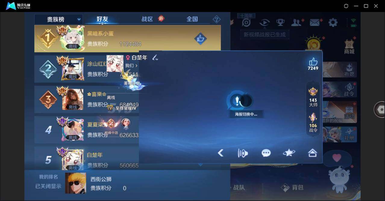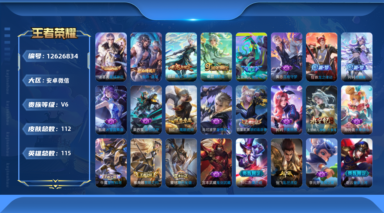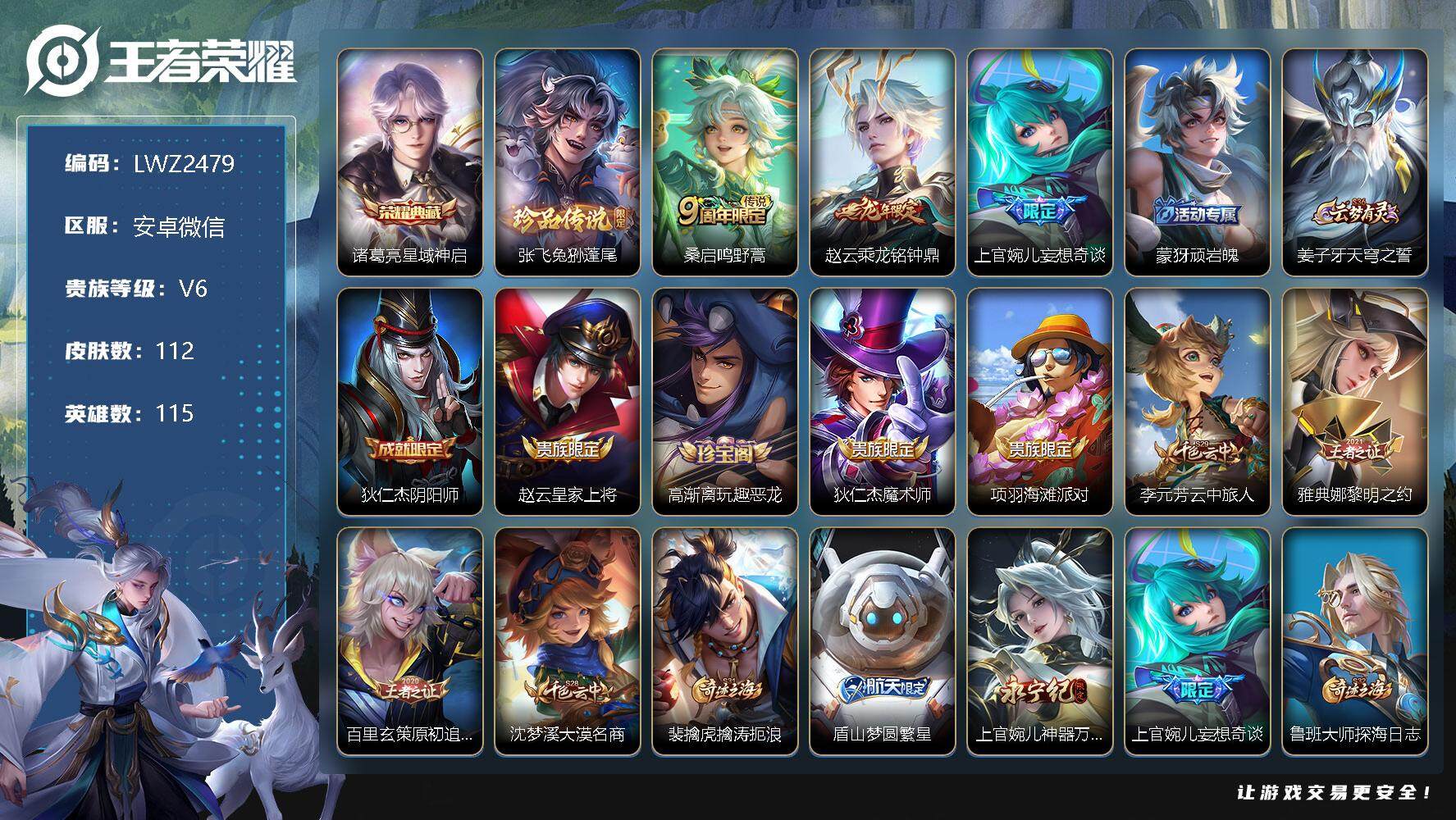 [12626834]游走40段/安卓WX-V6-最强王者段位-115英雄-112皮肤-1典藏-1珍品传说-3传说-21史诗 【英雄全皮】:孙权全皮 【荣耀典藏】:诸葛亮星域神启 【珍品传说】:张飞兔狲蓬尾 【传说皮肤】:桑启鸣野蒿,赵云乘龙铭钟鼎,上官婉儿妄想奇谈 【限定皮肤】:蒙犽顽岩魄,姜子牙天穹之誓,狄仁杰阴阳师,赵云皇家上将,高渐离玩趣恶龙,狄仁杰魔术师,项羽海滩派对,李元芳云中旅人,雅典娜黎明之约,百里玄策原初追逐者,沈梦溪大漠名商,裴擒虎擒涛扼浪,盾山梦圆繁星,上官婉儿神器万象笔,上官婉儿妄想奇谈,鲁班大师探海日志,桑启海盐诗旅,张良古海寻踪,蒙恬荣光圣徽,鬼谷子天穹祈灯,赵云乘龙铭钟鼎,沈梦溪龙舞盛年,刘邦剑破天穹,周瑜熔金海岸 【年限皮肤】:赵云乘龙铭钟鼎 【赛季限定】:张良古海寻踪,李元芳云中旅人,雅典娜黎明之约,百里玄策原初追逐者,沈梦溪大漠名商,裴擒虎擒涛扼浪,鲁班大师探海日志,桑启海盐诗旅,鬼谷子天穹祈灯,蒙恬荣光圣徽,刘邦剑破天穹,姜子牙天穹之誓 【史诗皮肤】:赵云皇家上将,甄姬冰雪圆舞曲,狄仁杰魔术师,宫本武藏鬼剑武藏,孙尚香水果甜心,张飞乱世虎臣,李元芳逐浪之夏,阿轲节奏热浪,狄仁杰鹰眼统帅,百里玄策原初追逐者,雅典娜黎明之约,盾山梦圆繁星,上官婉儿神器万象笔,莱西奥末日机甲,蒙恬荣光圣徽,蒙犽顽岩魄,马可波罗星界特工,牛魔星界战将,阿轲化蝶舞,狂铁龙之律动,黄忠百相守梦 【其他皮肤】:项羽海滩派对,韩信教廷特使,韩信街头霸王,露娜哥特玫瑰,赵云忍炎影,白起白色死神,牛魔西部大镖客,宫本武藏未来纪元,典韦黄金武士,亚瑟死亡骑士,达摩拳王,甄姬花好人间,狄仁杰阴阳师,孙尚香沉稳之力,李白敏锐之力,小乔丁香结,高渐离玩趣恶龙,盾山圆桌骑士,狂铁特工战影,鲁班大师乓乓大师,程咬金无双福将,沈梦溪大漠名商,李元芳云中旅人,戈娅危途狂花,桑启海盐诗旅,裴擒虎擒涛扼浪,太乙真人劲辣红锅,莱西奥西部游侠,鲁班大师探海日志,张良古海寻踪,钟无艳聚星闪耀,鬼谷子天穹祈灯,沈梦溪龙舞盛年,钟无艳春野之旅,刘邦剑破天穹,姜子牙天穹之誓,周瑜熔金海岸,盘古敬我三分,东皇太一噬灭天穹,干将莫邪雾都夜雨,苍苍林狼骑,太乙真人谧流熔炉,姜子牙星梦巡礼,明世隐景韶洛都,戈娅玫蓝誓约,刘备浪漫序章,钟馗虚灵犬护,苏烈春野闲踪,张良灵野札记,阿古朵布丁狗之约,甄姬逆浪荇歌,莱西奥踏浪烽翎,