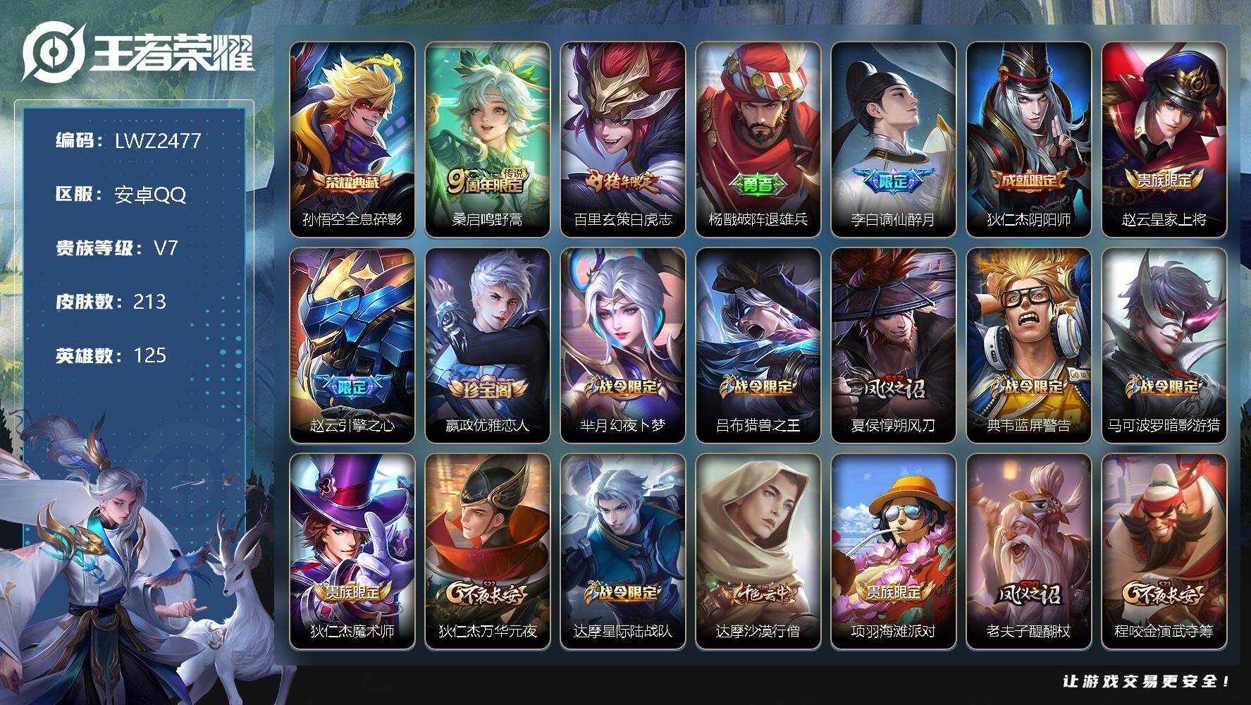 [12626840]安卓Q-V7-永恒钻石IV段位-125英雄-213皮肤-1典藏-2传说-56史诗 【英雄全皮】:鬼谷子全皮,空空儿全皮 【荣耀典藏】:孙悟空全息碎影 【传说皮肤】:桑启鸣野蒿,百里玄策白虎志 【限定皮肤】:杨戬破阵退雄兵,李白谪仙醉月,狄仁杰阴阳师,赵云皇家上将,赵云引擎之心,嬴政优雅恋人,芈月幻夜卜梦,吕布猎兽之王,夏侯惇朔风刀,典韦蓝屏警告,马可波罗暗影游猎,狄仁杰魔术师,狄仁杰万华元夜,达摩星际陆战队,达摩沙漠行僧,项羽海滩派对,老夫子醍醐杖,程咬金演武夺筹,兰陵王金庭之子,孙悟空美猴王,孙悟空至尊宝,孙悟空大圣娶亲,牛魔御旌,李元芳银河之约,李元芳云中旅人,钟馗驱傩正仪,女娲朔望之晖,雅典娜单词大作战,蔡文姬繁星吟游,鬼谷子原初探秘者,鬼谷子五谷丰年,黄忠火炮绅士,苏烈千军破阵,百里玄策白虎志,弈星混沌棋,沈梦溪星空之诺,沈梦溪大漠名商,明世隐疑决卦,裴擒虎李小龙,裴擒虎擒涛扼浪,米莱狄御霄,米莱狄胡桃异想国,云中君纤云弄巧,盾山御銮,猪八戒西部大镖客,上官婉儿梁祝,蒙犽狂想玩偶喵,鲁班大师探海日志,桑启海盐诗旅,张良古海寻踪,鬼谷子天穹祈灯,姬小满妄想食味,刘邦剑破天穹 【年限皮肤】:百里玄策白虎志,孙悟空美猴王 【赛季限定】:夏侯惇朔风刀,狄仁杰万华元夜,达摩沙漠行僧,老夫子醍醐杖,程咬金演武夺筹,兰陵王金庭之子,张良古海寻踪,牛魔御旌,李元芳云中旅人,钟馗驱傩正仪,鬼谷子原初探秘者,苏烈千军破阵,弈星混沌棋,沈梦溪大漠名商,明世隐疑决卦,裴擒虎擒涛扼浪,米莱狄御霄,盾山御銮,鲁班大师探海日志,桑启海盐诗旅,鬼谷子天穹祈灯,刘邦剑破天穹 【战令限定】:芈月幻夜卜梦,吕布猎兽之王,典韦蓝屏警告,马可波罗暗影游猎,达摩星际陆战队,李元芳银河之约,女娲朔望之晖,雅典娜单词大作战,黄忠火炮绅士,沈梦溪星空之诺,米莱狄胡桃异想国,猪八戒西部大镖客,蒙犽狂想玩偶喵 【史诗皮肤】:露娜紫霞仙子,赵云皇家上将,赵云未来纪元,貂蝉圣诞恋歌,甄姬冰雪圆舞曲,王昭君偶像歌手,狄仁杰魔术师,宫本武藏鬼剑武藏,孙尚香水果甜心,嬴政优雅恋人,嬴政暗夜贵公子,嬴政摇滚巨星,墨子金属风暴,吕布圣诞狂欢,曹操幽灵船长,李白千年之狐,吕布末日机甲,张飞乱世虎臣,韩信白龙吟,孙悟空至尊宝,赵云引擎之心,刘邦德古拉伯爵,夏侯惇乘风破浪,兰陵王暗隐猎兽者,诸葛亮黄金分割率,雅典娜冰冠公主,安琪