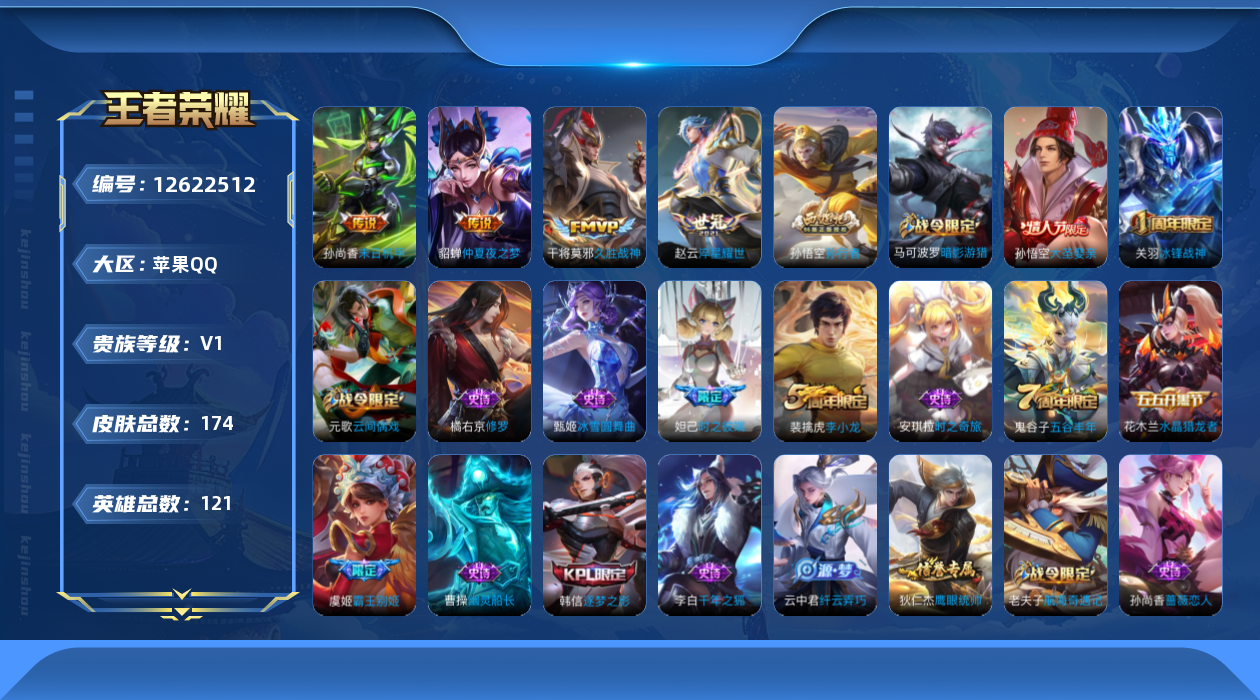 [12622512]【特价急出/详情看图】苹果Q-V0-尊贵铂金II段位-121英雄-174皮肤-4传说-47史诗 【传说皮肤】:赵云淬星耀世,干将莫邪久胜战神,貂蝉仲夏夜之梦,孙尚香末日机甲 【限定皮肤】:狄仁杰阴阳师,赵云皇家上将,墨子神迹守卫,妲己时之彼端,孙尚香蔷薇恋人,庄周高山流水,芈月重明,元歌云间偶戏,夏侯惇朔风刀,甄姬游园惊梦,曹操烛龙,典韦穷奇,马可波罗暗影游猎,狄仁杰魔术师,狄仁杰万华元夜,达摩沙漠行僧,项羽海滩派对,老夫子醍醐杖,老夫子航海奇遇记,关羽冰锋战神,程咬金演武夺筹,韩信逐梦之影,兰陵王金庭之子,亚瑟潮玩骑士王,孙悟空大圣娶亲,孙悟空孙行者,牛魔御旌,李元芳银河之约,李元芳云中旅人,虞姬霸王别姬,钟馗驱傩正仪,杨玉环遇见飞天,雅典娜单词大作战,雅典娜黎明之约,蔡文姬繁星吟游,太乙真人饕餮,鬼谷子原初探秘者,鬼谷子五谷丰年,苏烈千军破阵,百里玄策原初追逐者,弈星混沌棋,梦奇顽趣,沈梦溪星空之诺,沈梦溪大漠名商,明世隐疑决卦,裴擒虎李小龙,裴擒虎擒涛扼浪,狂铁御狮,米莱狄御霄,云中君纤云弄巧,盾山御銮,猪八戒西部大镖客,上官婉儿梁祝,蒙犽狂想玩偶喵,鲁班大师探海日志,桑启海盐诗旅 【赛季限定】:芈月重明,夏侯惇朔风刀,曹操烛龙,典韦穷奇,狄仁杰万华元夜,达摩沙漠行僧,老夫子醍醐杖,程咬金演武夺筹,兰陵王金庭之子,牛魔御旌,李元芳云中旅人,钟馗驱傩正仪,雅典娜黎明之约,太乙真人饕餮,鬼谷子原初探秘者,苏烈千军破阵,百里玄策原初追逐者,弈星混沌棋,梦奇顽趣,沈梦溪大漠名商,明世隐疑决卦,裴擒虎擒涛扼浪,狂铁御狮,米莱狄御霄,盾山御銮,鲁班大师探海日志,桑启海盐诗旅 【战令限定】:墨子神迹守卫,元歌云间偶戏,马可波罗暗影游猎,老夫子航海奇遇记,亚瑟潮玩骑士王,李元芳银河之约,雅典娜单词大作战,沈梦溪星空之诺,猪八戒西部大镖客,蒙犽狂想玩偶喵 【史诗皮肤】:赵云皇家上将,貂蝉圣诞恋歌,甄姬冰雪圆舞曲,狄仁杰魔术师,廉颇地狱岩魂,宫本武藏鬼剑武藏,孙尚香蔷薇恋人,孙尚香水果甜心,妲己魅力维加斯,墨子金属风暴,吕布圣诞狂欢,曹操幽灵船长,李白千年之狐,虞姬霸王别姬,关羽冰锋战神,花木兰水晶猎龙者,刘邦德古拉伯爵,韩信逐梦之影,兰陵王暗隐猎兽者,诸葛亮黄金分割率,甄姬游园惊梦,百里守约特工魅影,蔡文姬舞动绿茵,程咬金功夫厨神,白起星夜王子,杨玉环遇见飞天,孙策猫狗日记,